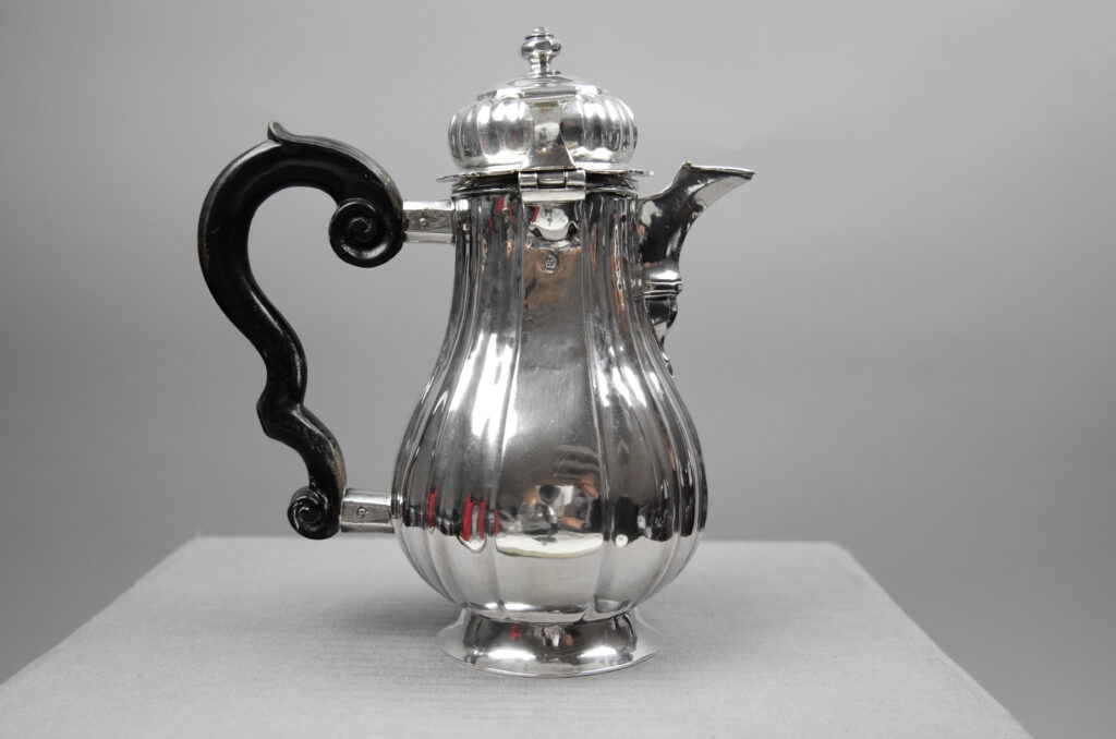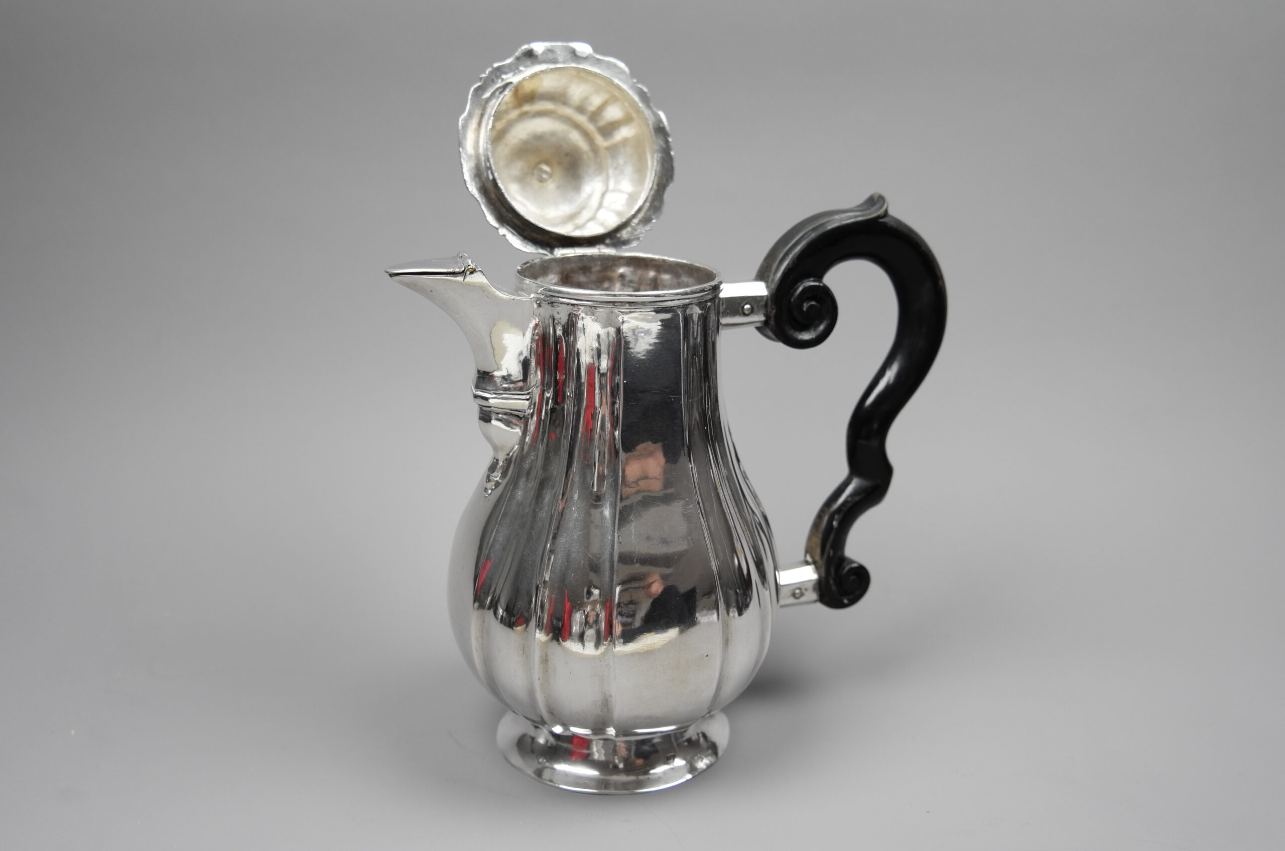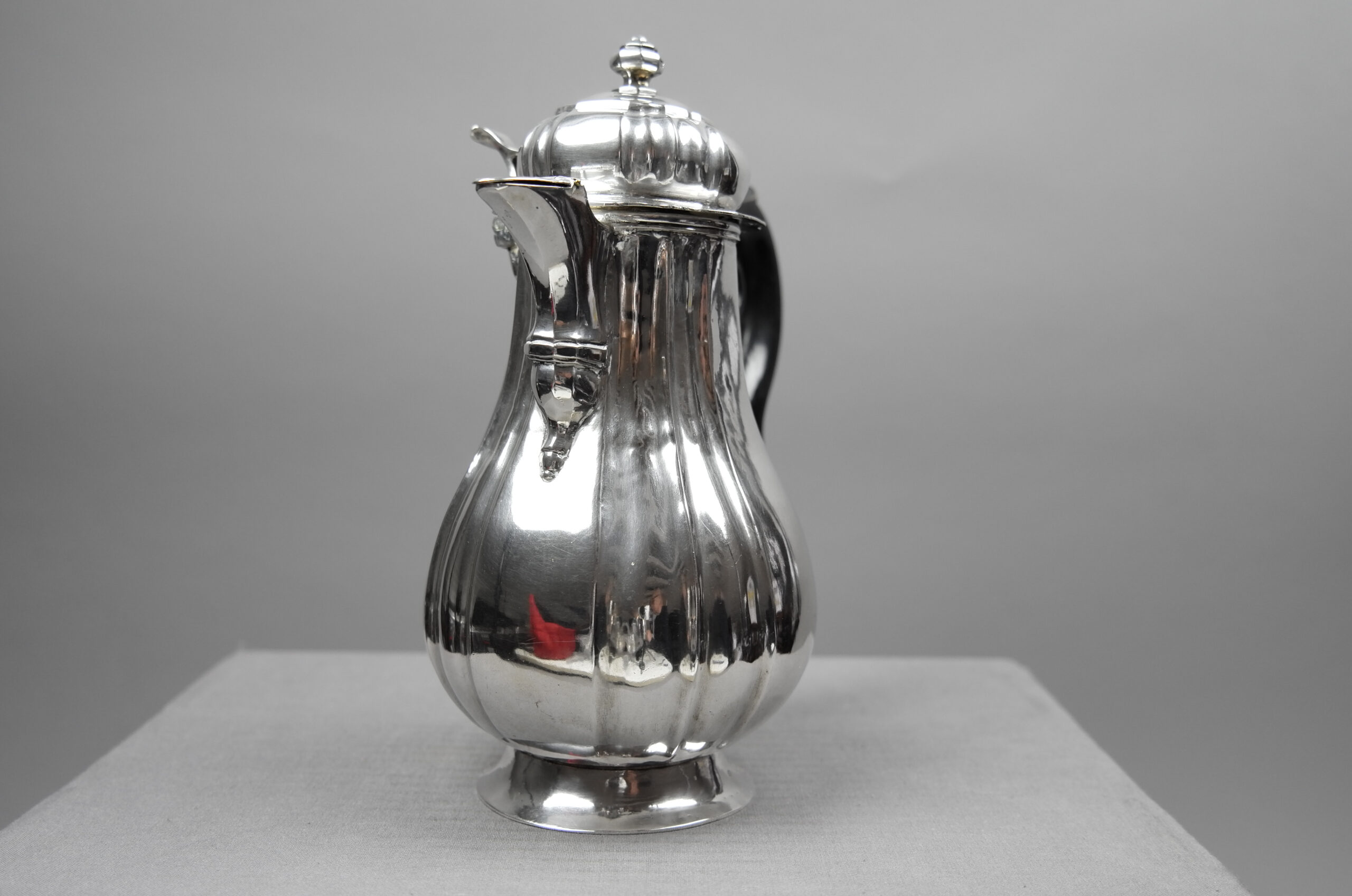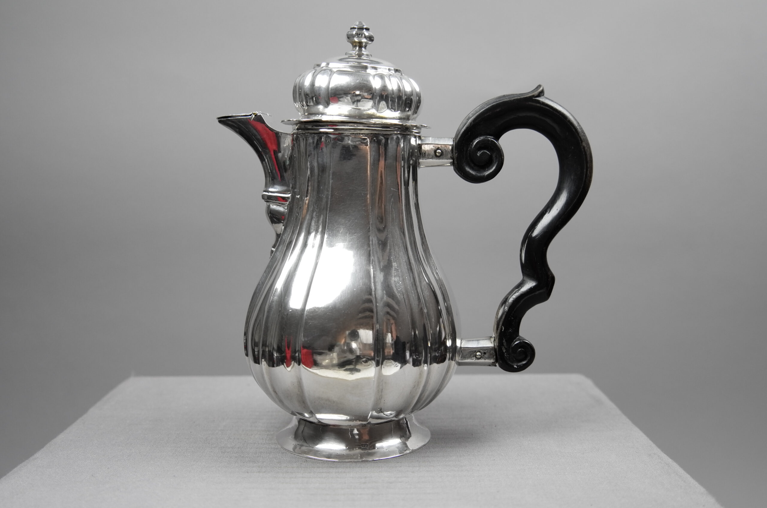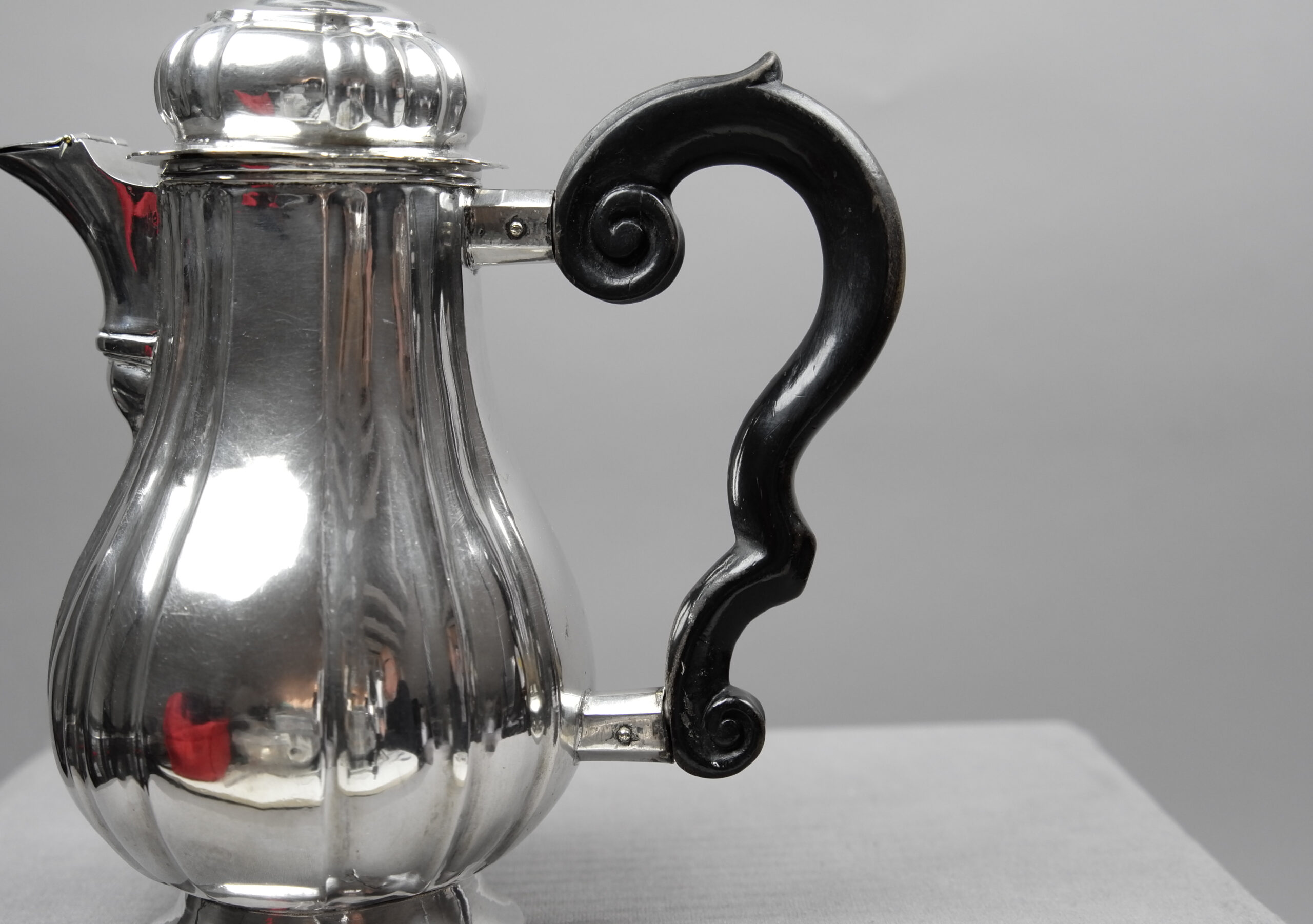 Das Mokkakännchen mit birnenförmigem Korpus steht auf einem runden Standfuß und wird mit einem Haubendeckel geschlossen. Umlaufend gegliederte, schmale Falten zieren den Korpus, der mit einem Konsolausguss sowie mit einem volutenförmig geschweiften und ebonisierten Holzgriff ausgestattet ist.