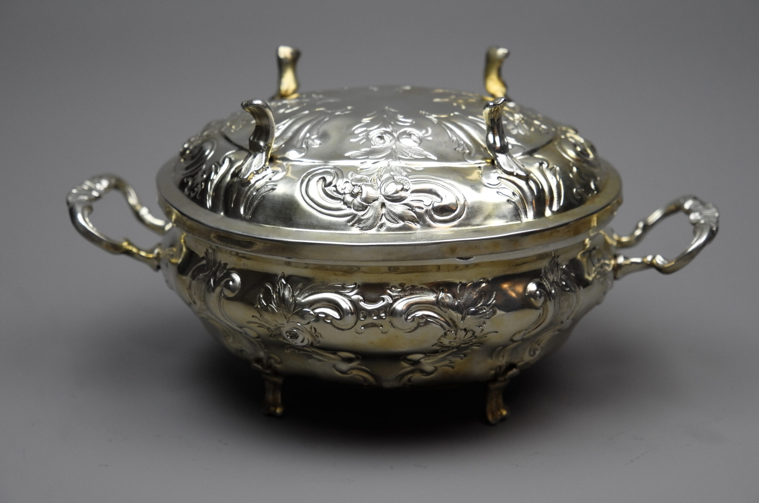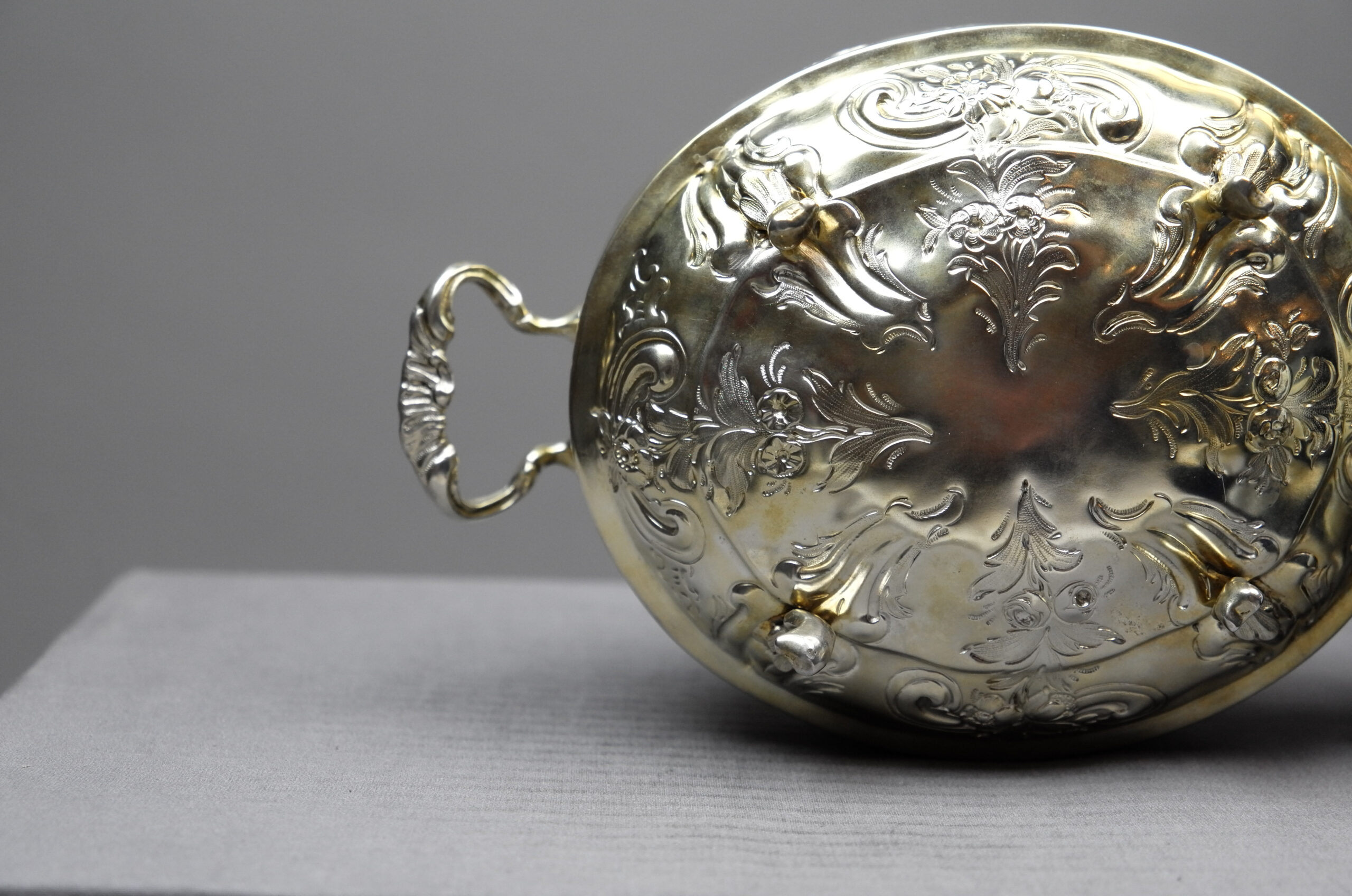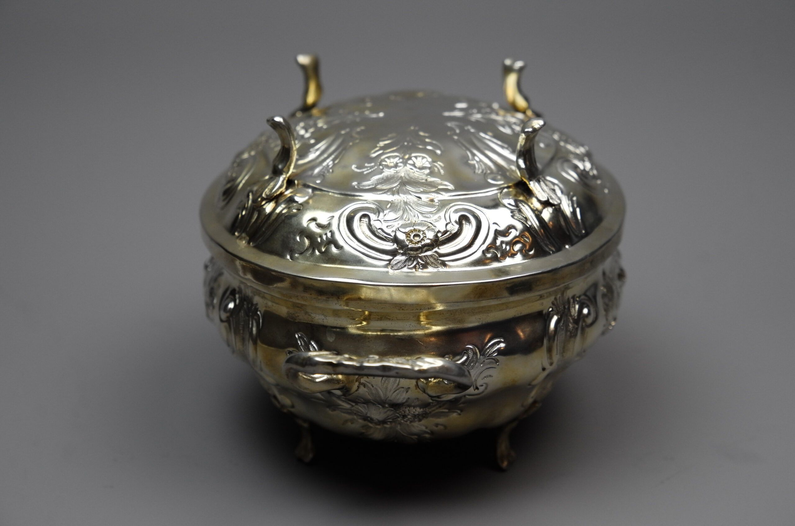 Eine ovale, komplett vergoldete Dose mit Deckel auf bzw. mit jeweils vier Füßen, gänzlich mit geprägten und getriebenen floralen Mustern dekoriert und mit zwei seitlichen Henkel ausgestattet.