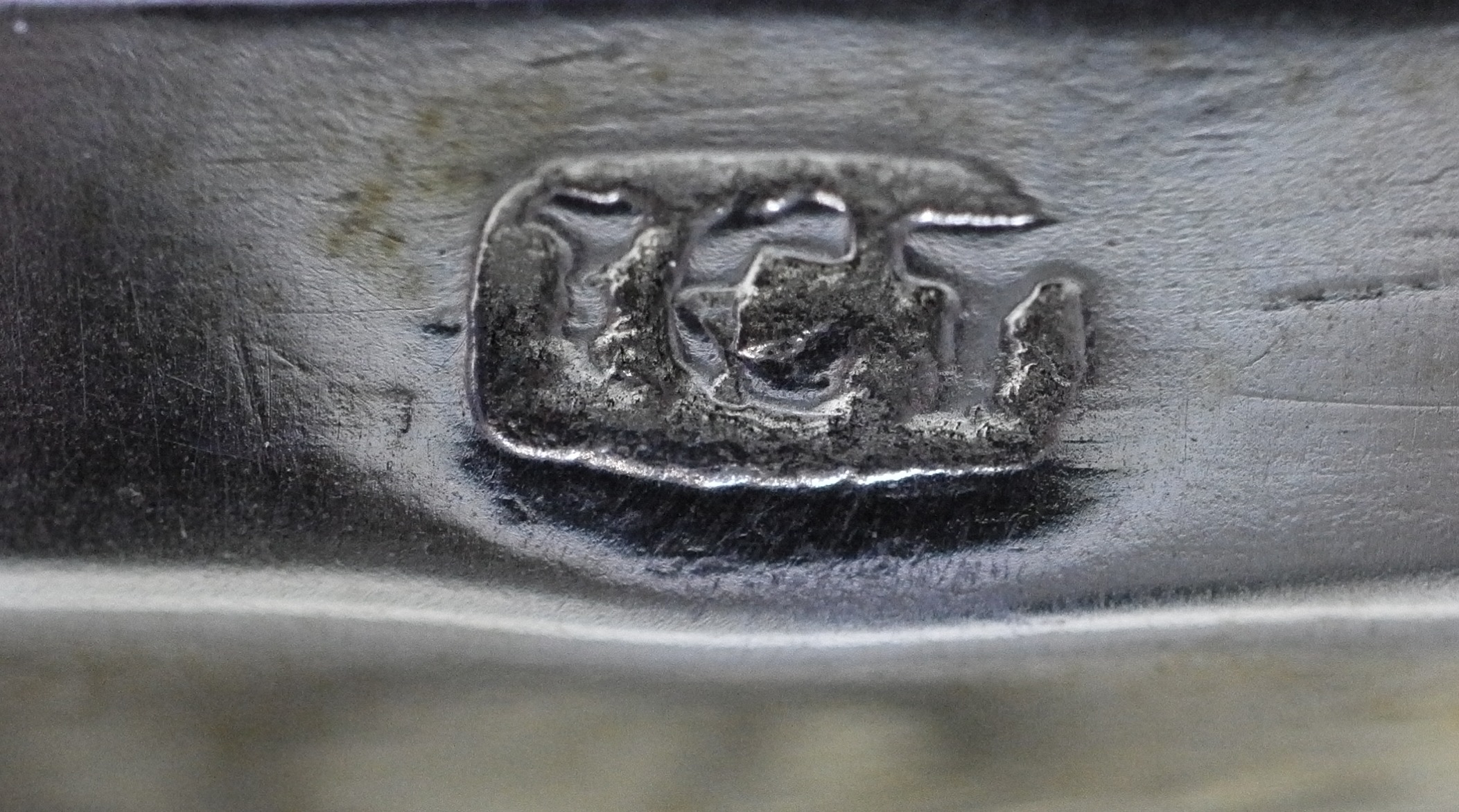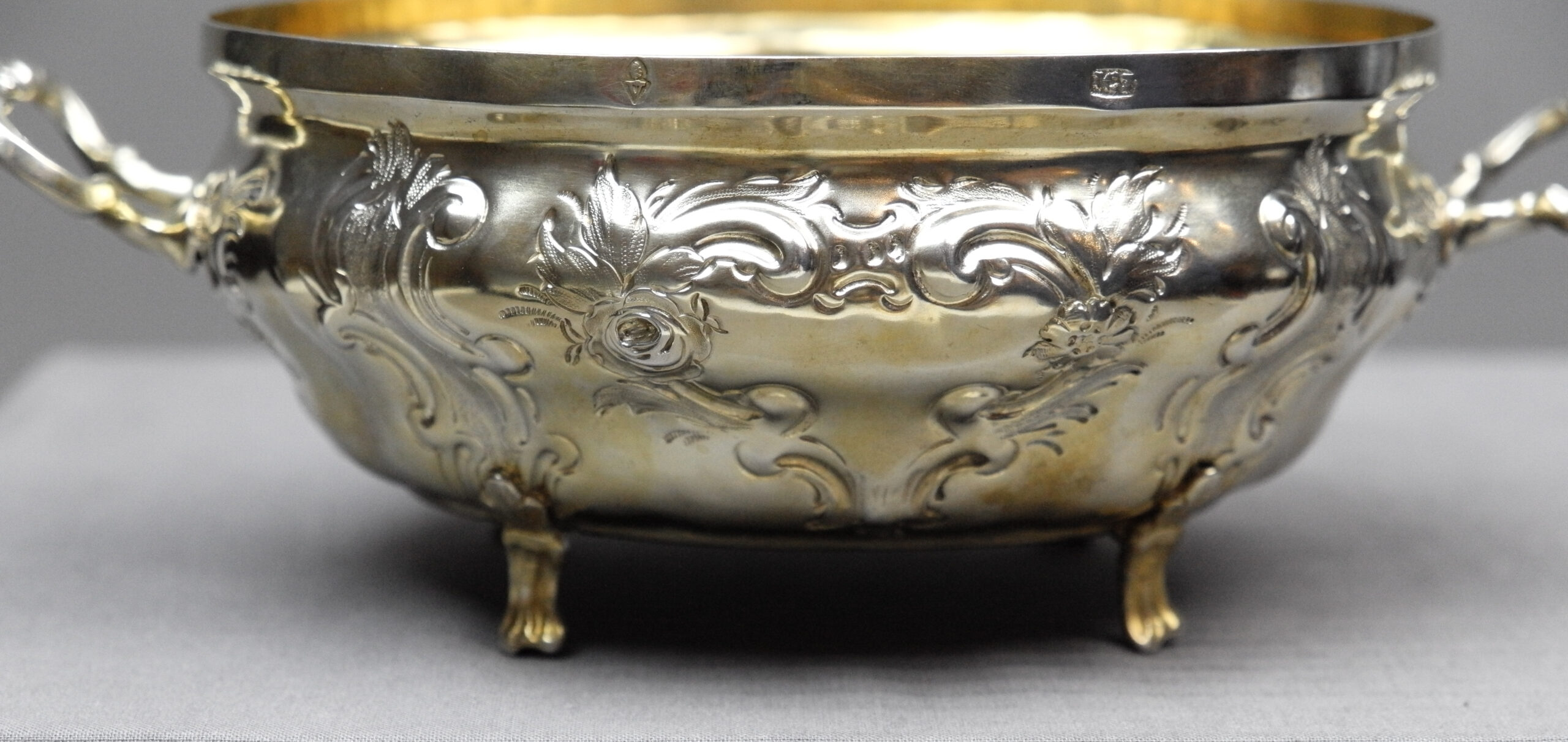 Gepunzt ist die Deckeldose mit der Pyr und dem Buchstaben V als Beschaumarke von Augsburg 1771-1772 sowie mit den Initialen IGT im Oval für den Meister Johann Georg Träger (Seling 2480), der in Augsburg von 1762 bis 1774 tätig war.