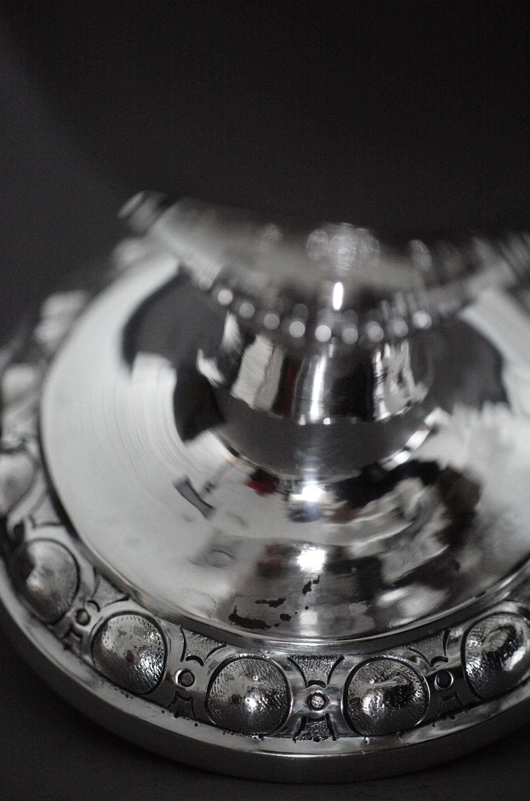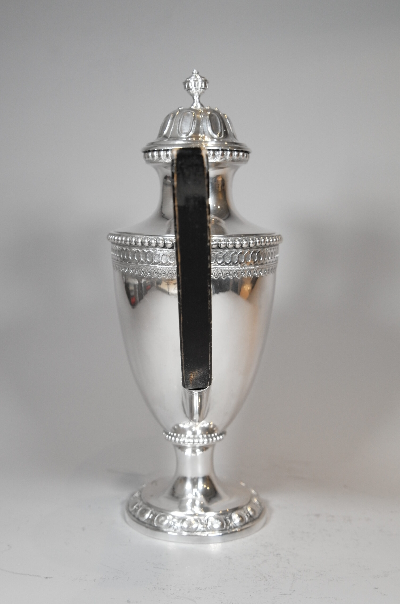 Eine Kaffeekanne in runder Urnenform auf rundem Standfuß mit Verzierung am Fuß und am oberen Korpusrand. Der Deckel ist abnehmbarer, die Hanghabe ist aus Holz gefertigt. Eine schwere Ausführung mit inwendiger Vergoldung.