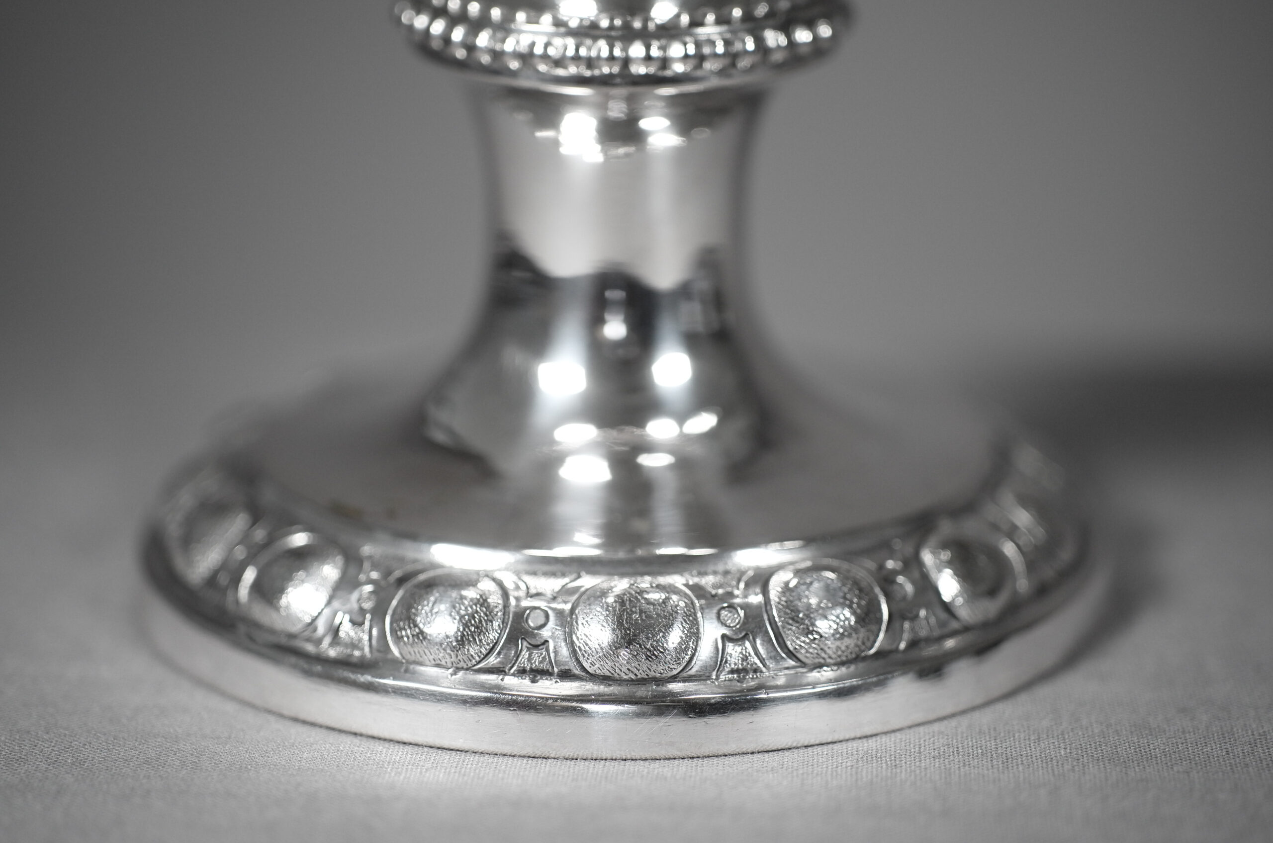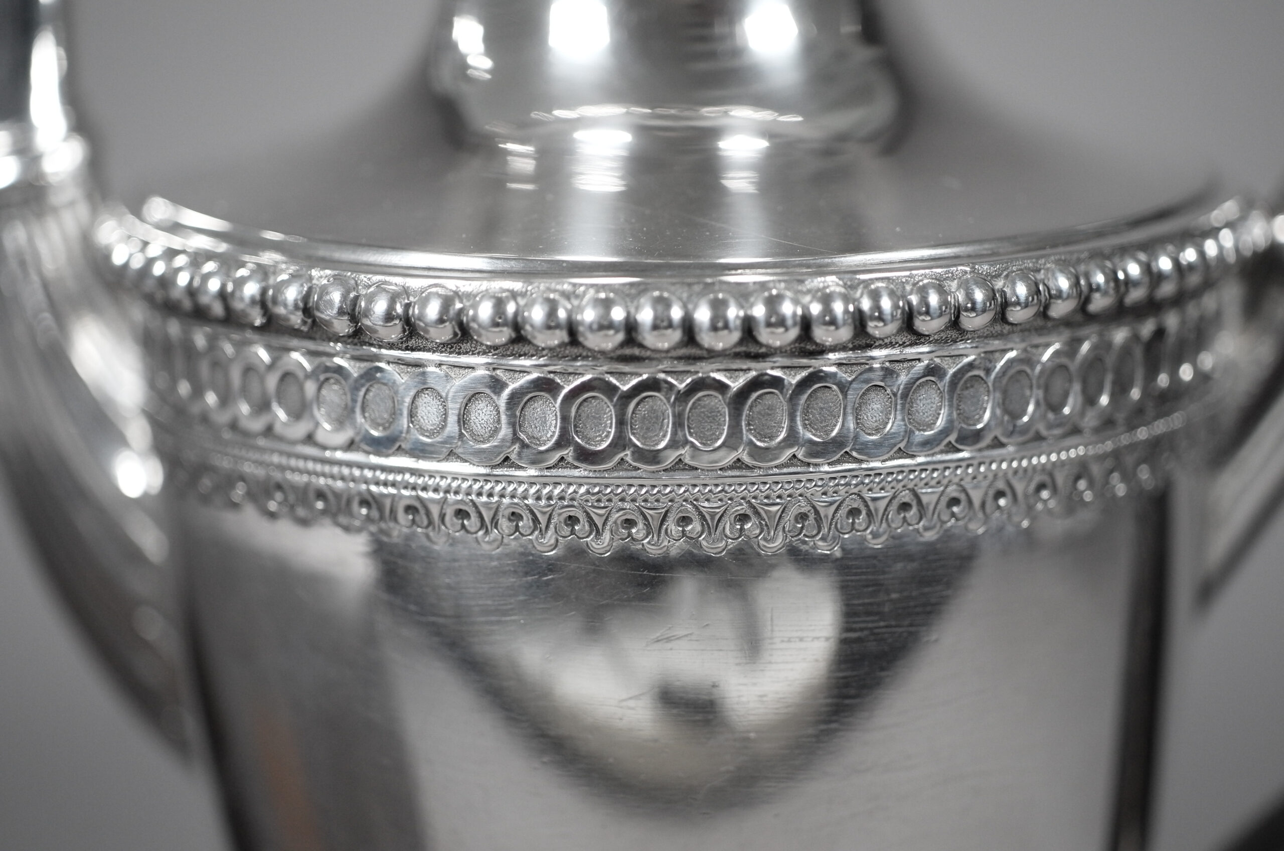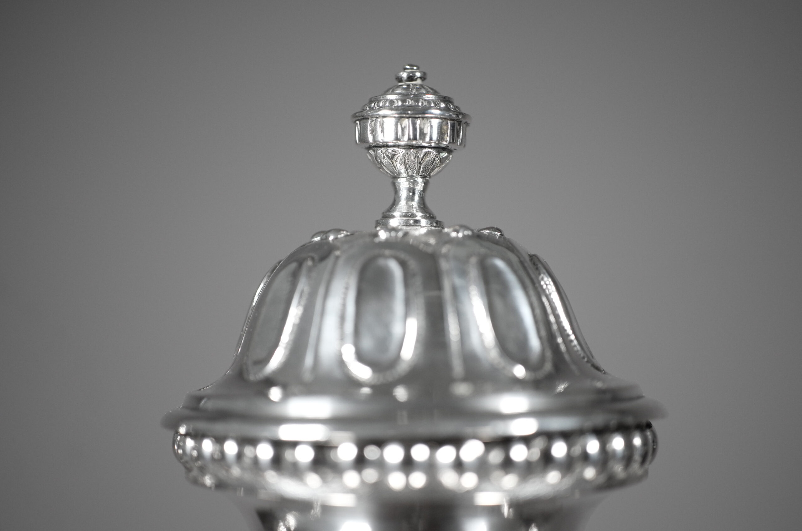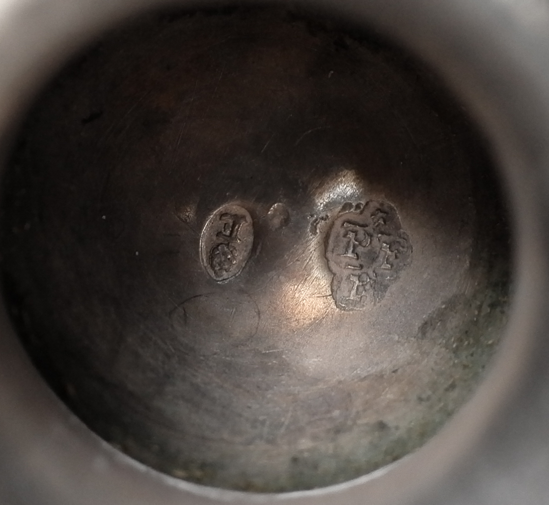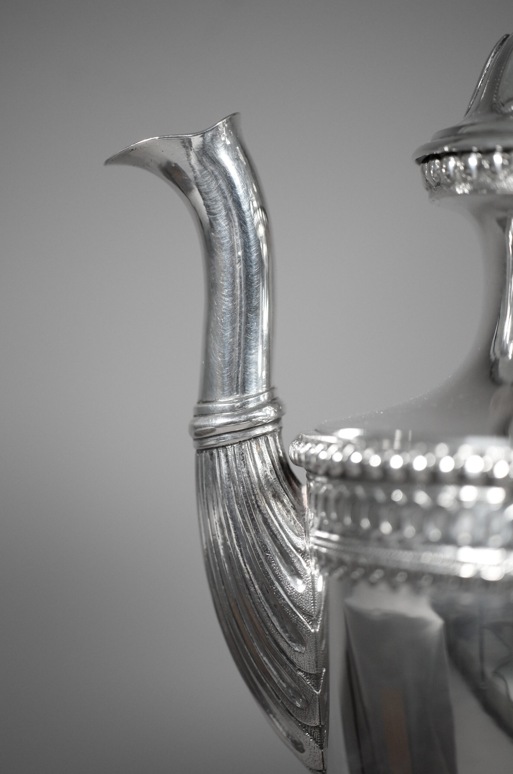 Markiert ist die Kaffeekanne mit PFB im Vierpass für den berühmten Goldschmied Philipp Friedrich Bruglocher (Seling 2531), Meister 1771-1826, mit der Pyr und E für Augsburg 1789-1791.