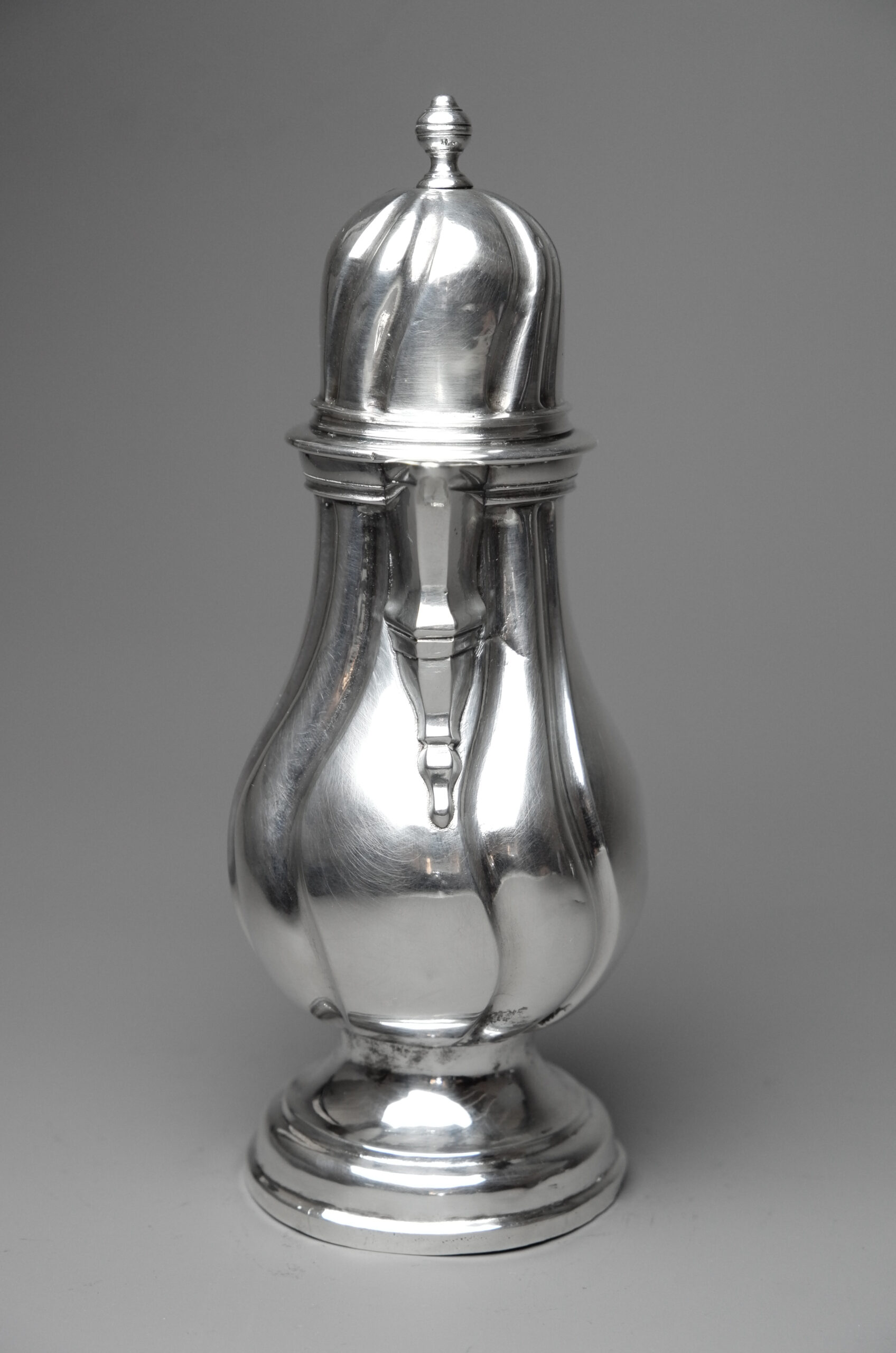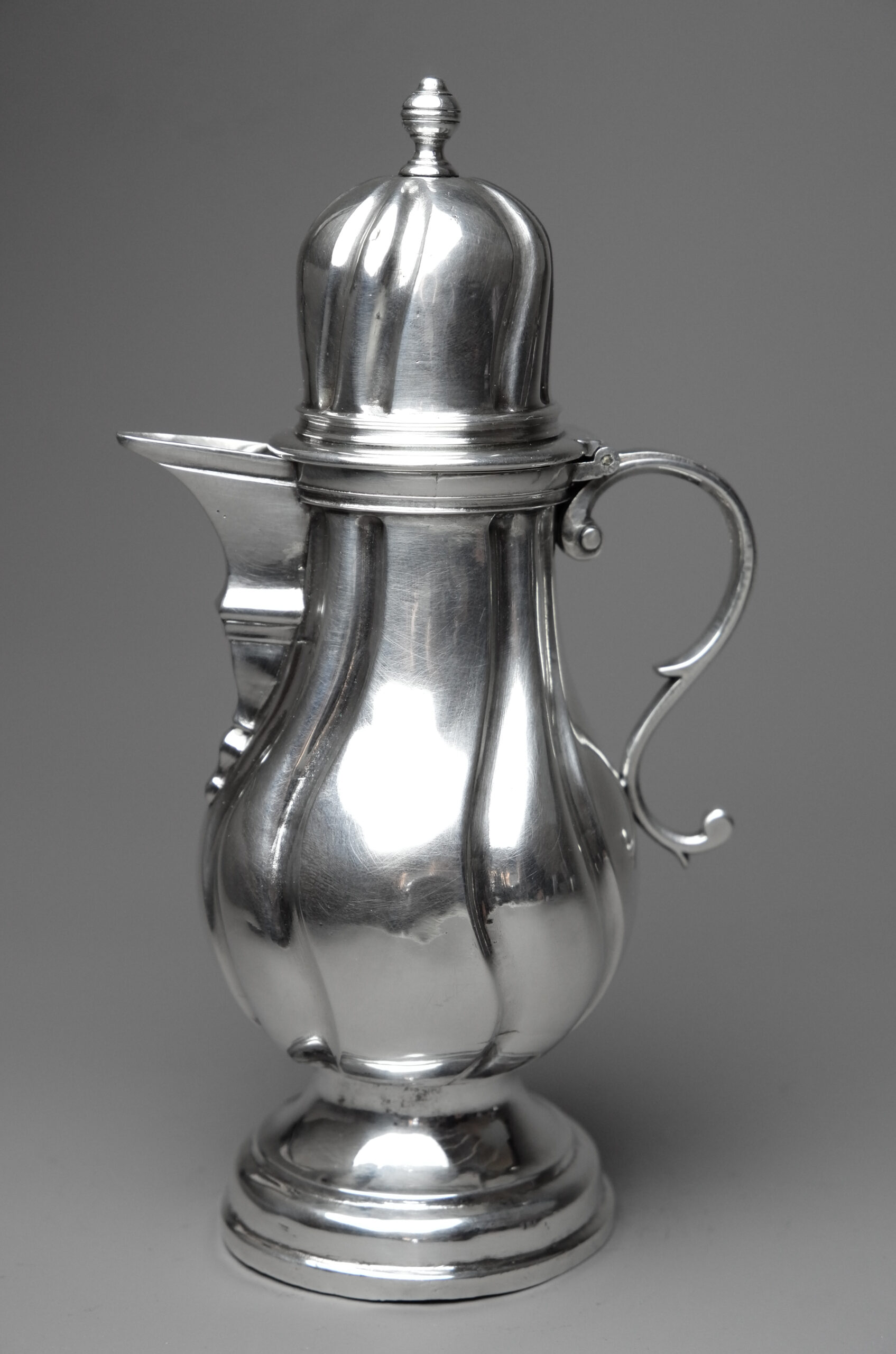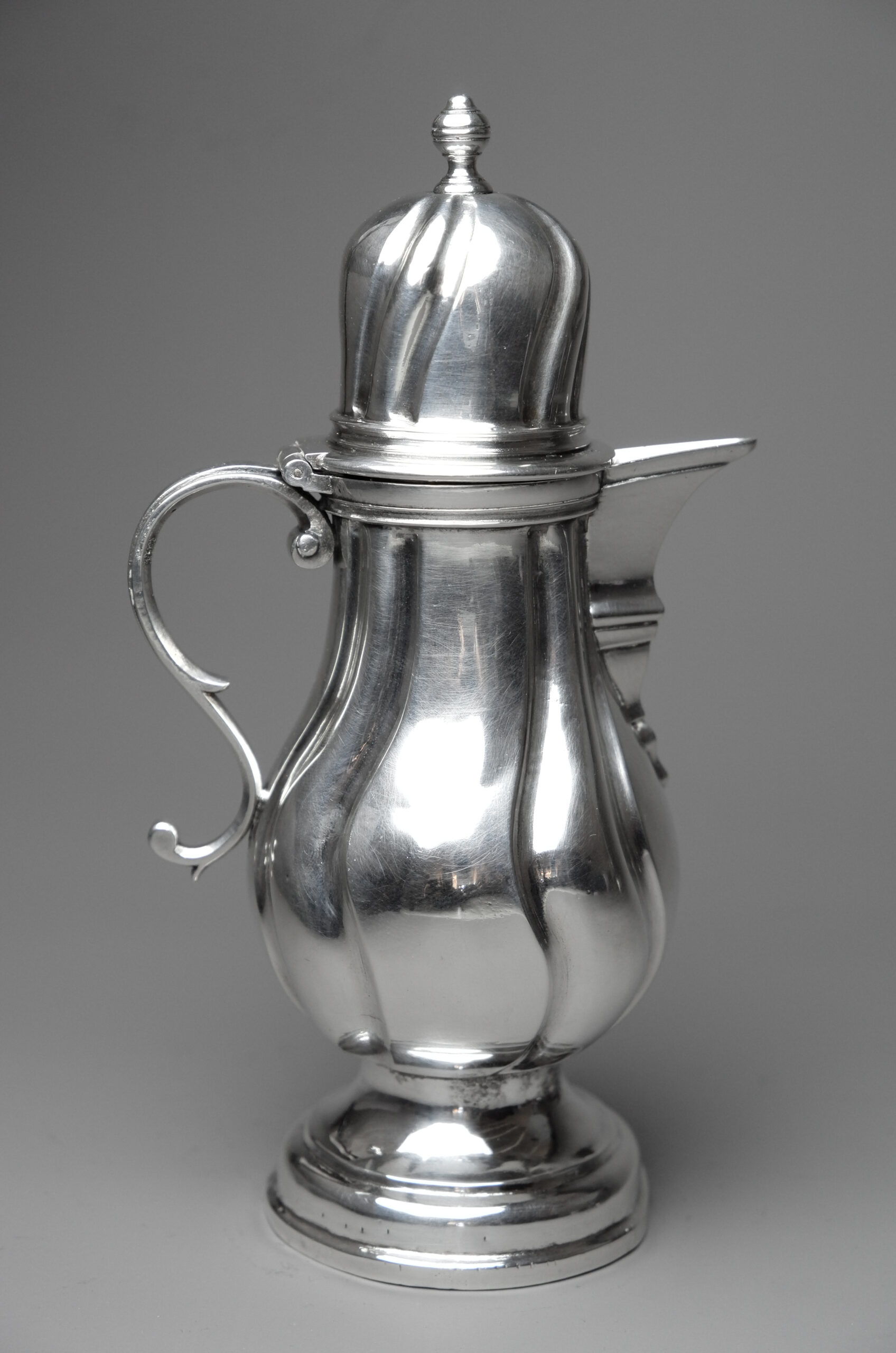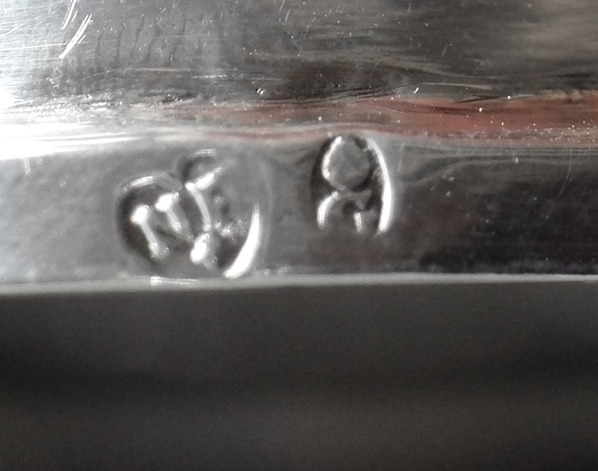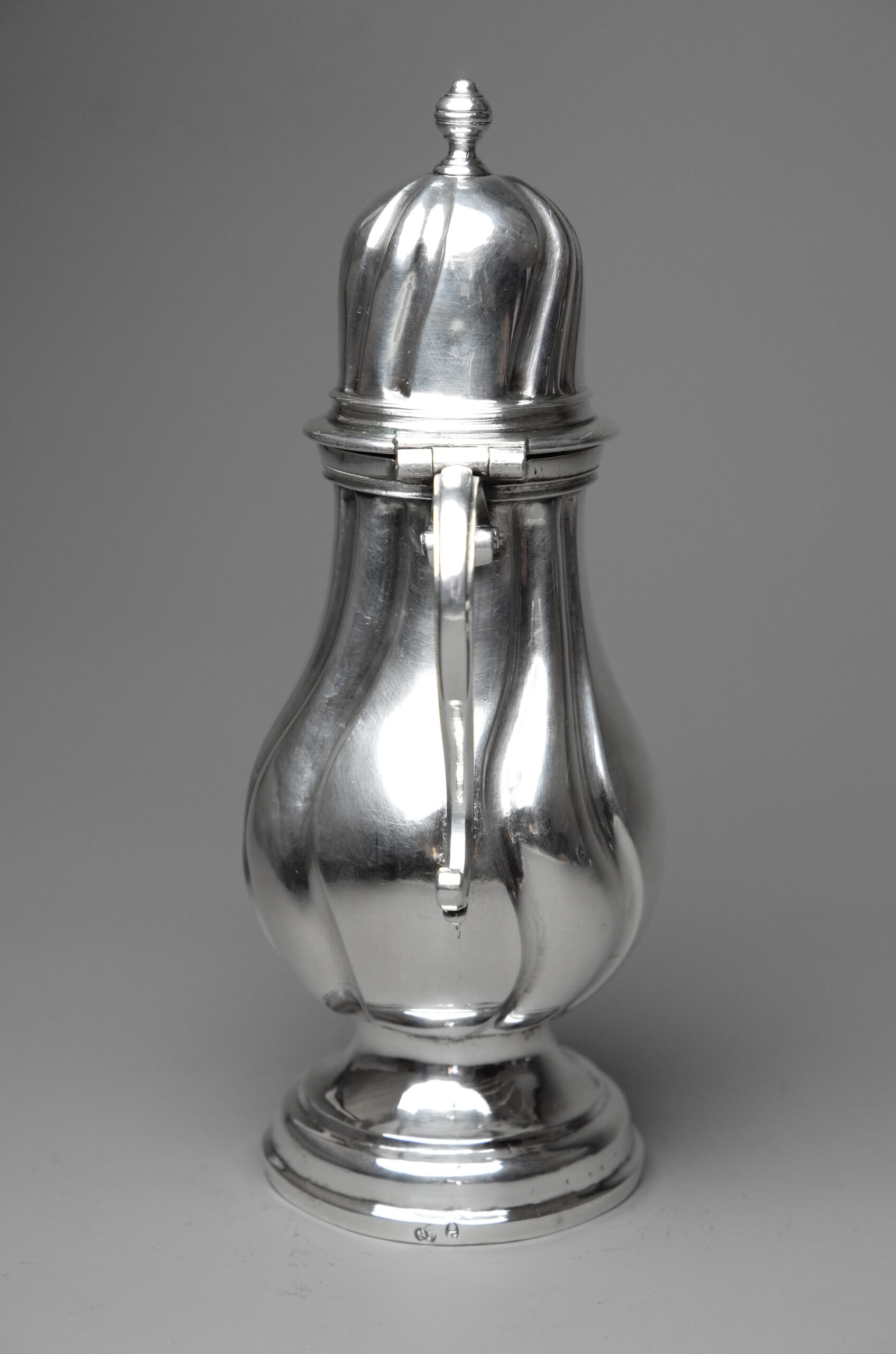 Gepunzt ist das Kännchen mit der Pyr über G für Augsburg 1745-1747 (Seling Nr. 224) sowie mit NF für den aus Stockholm stammenden Nikolaus Franson (Seling Nr. 2105).