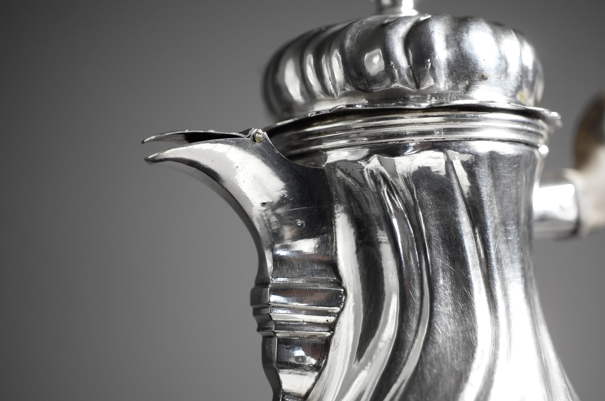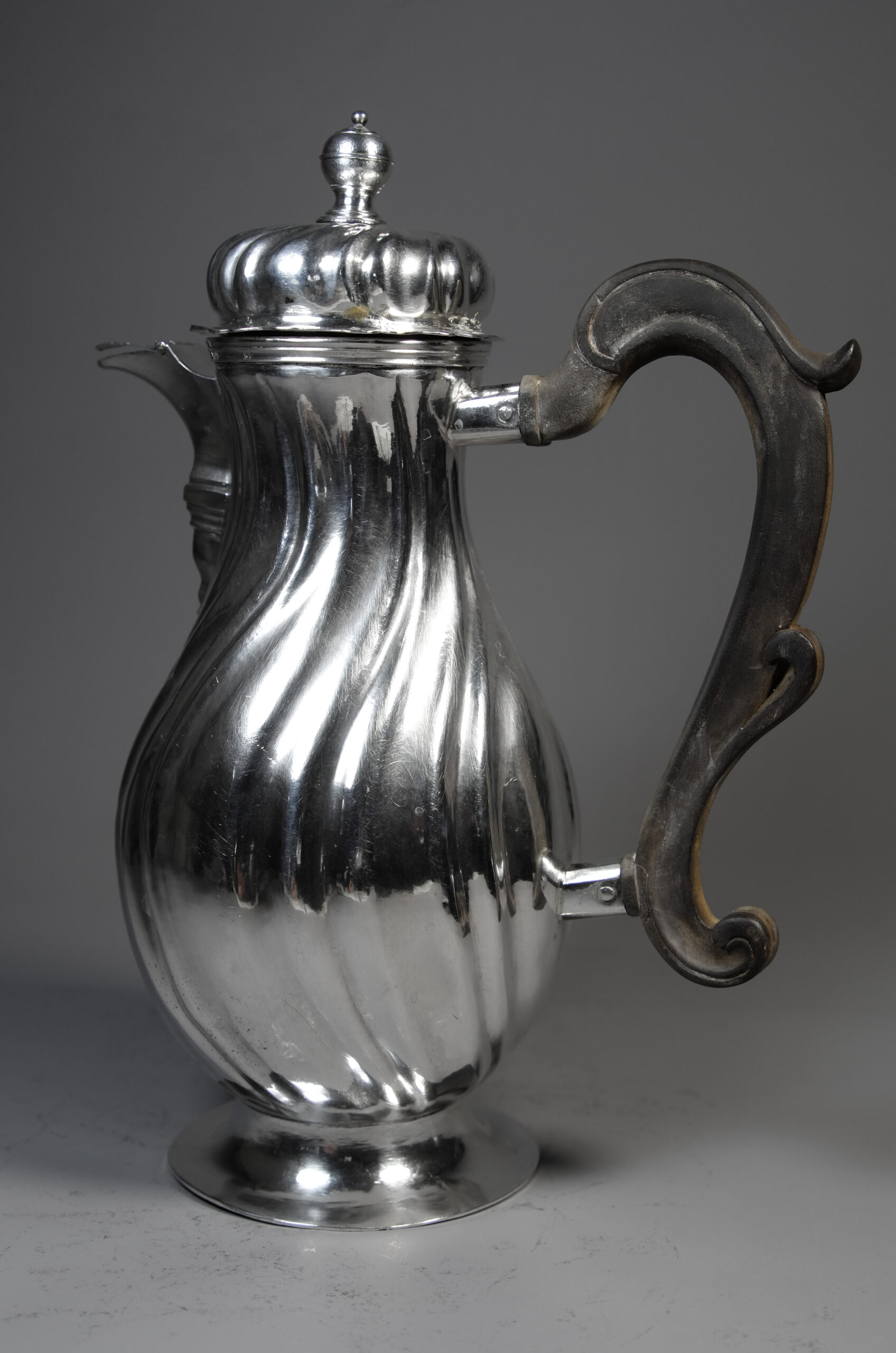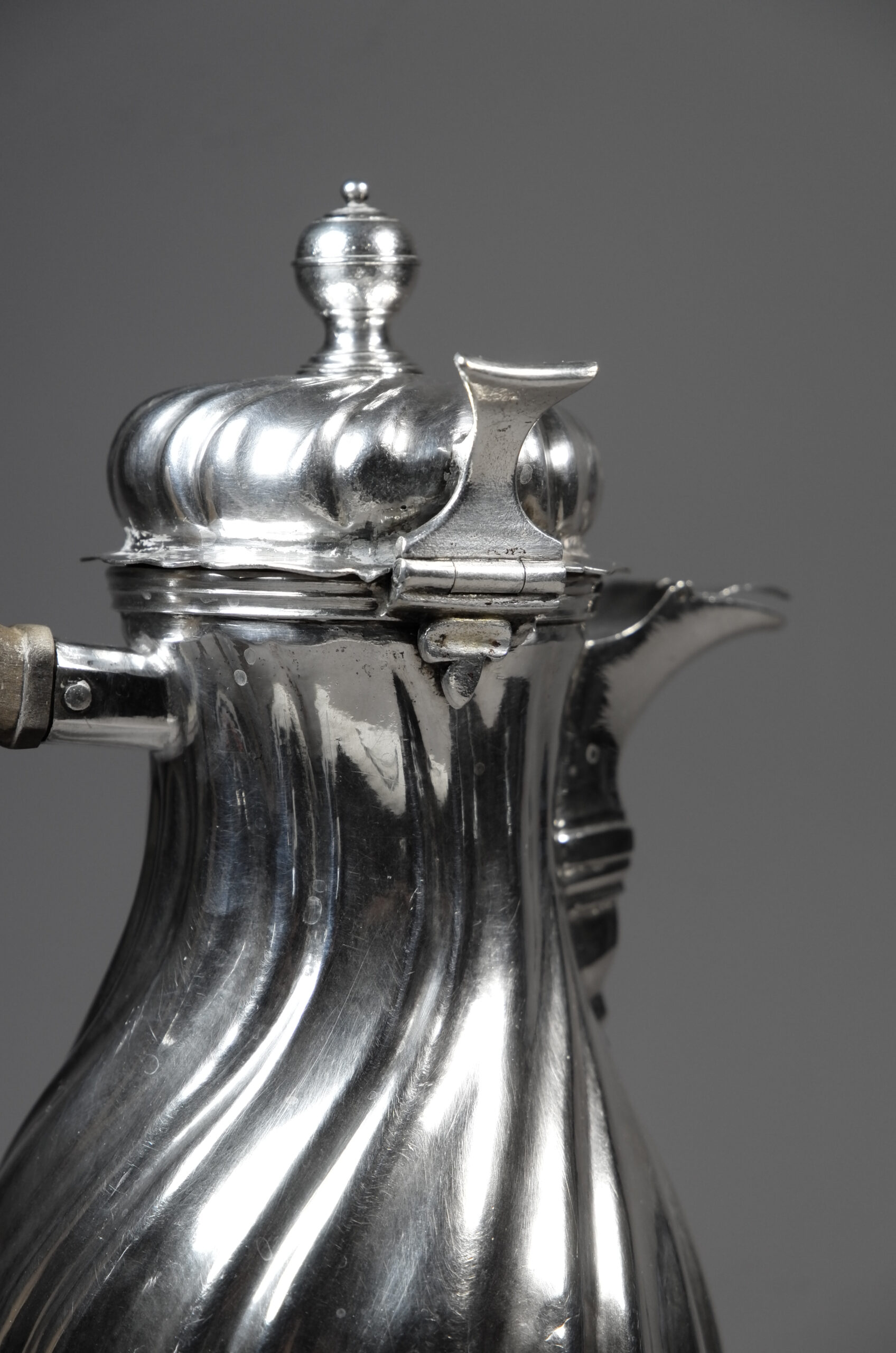 Diese balusterförmige Kanne für Schokolade hat gedrehte Züge, ein seitliches Deckelscharnier und einen Haubendeckel mit Silberknauf. Des weiteren steht die Kanne auf einem runden, eingezogenen Fuß, der Ausguss ist mit Konsole und mit Verschluss gefertigt. Die Handhabe ist aus geschnitztem Holz und die Kanne ist innen vergoldet.
