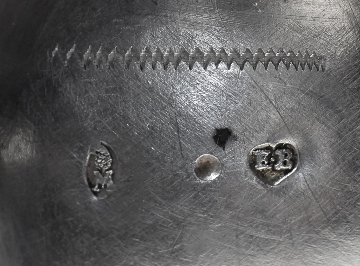 Markiert ist die Kanne mit der Pyr über M für Augsburg 1755-1757 sowie mit EB für den Meister Esaias Busch IV (Seling Nr. 2277).