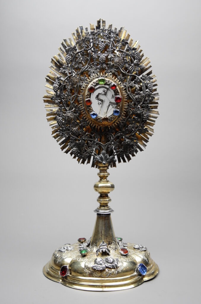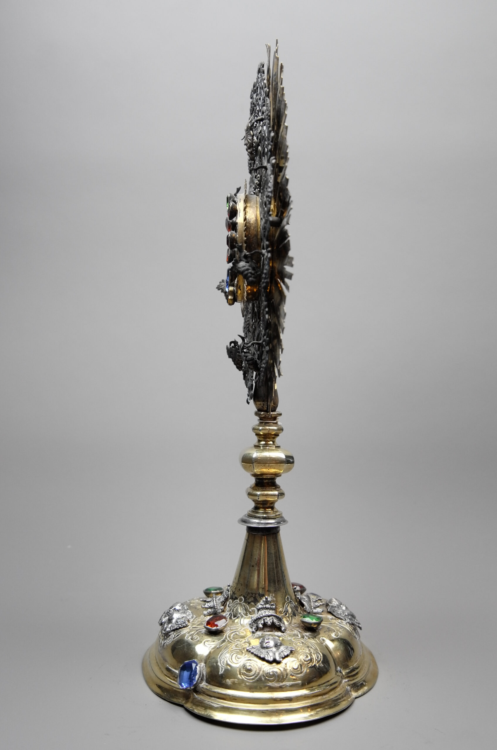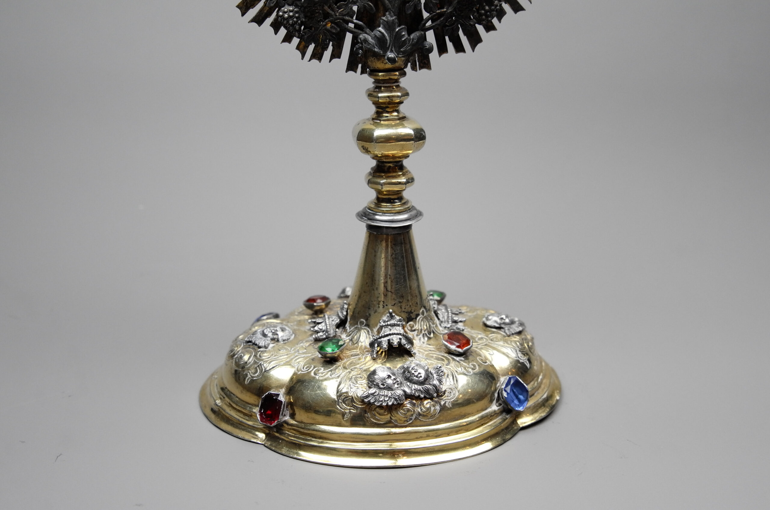 Eine vergoldete Monstranz aus dem Barock, die auf einem ovalen, vierpassigen Standfuß steht, der mit Gravuren, Farbsteinen und aufgesetzten Cherubköpfen dekoriert ist. Auf dem balusterförmigen Schaft ist der ovale Aufsatz in Strahlenform montiert, der mit aufgelegtem und filigranem silbernen Besatz aus Weinranken mit Trauben verziert ist. Im Zentrum befindet sich der mit Farbsteinen dekorierte Glaseinsatz mit einem Glaskreuz.