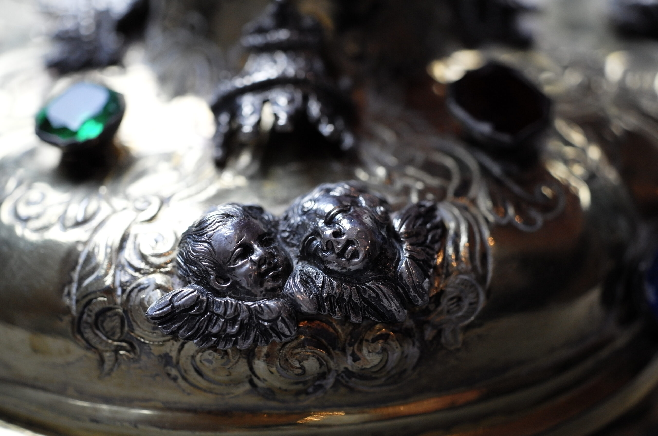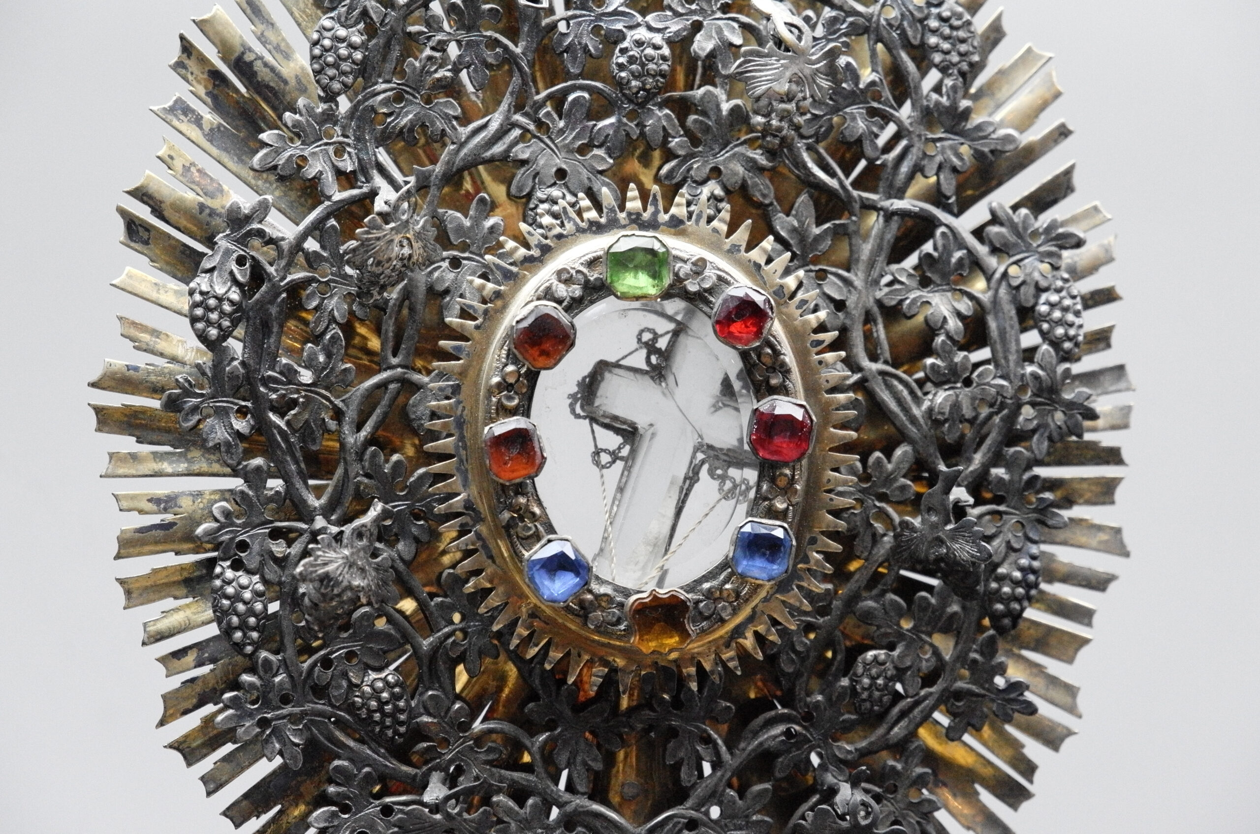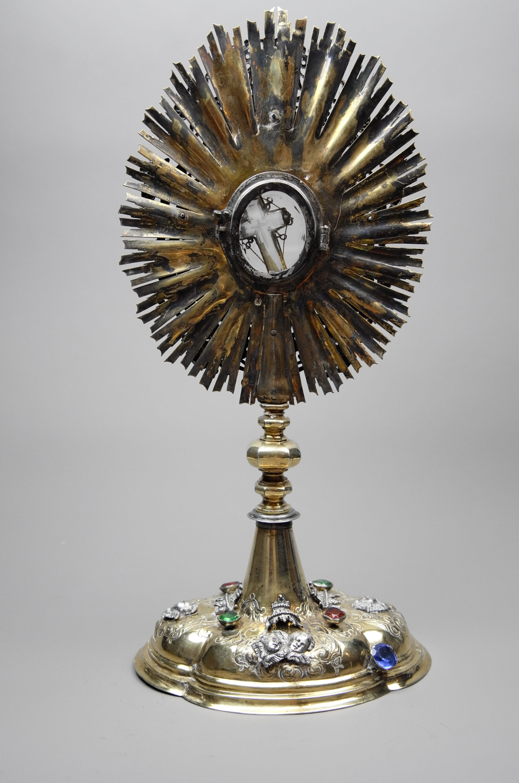 Eine vergoldete Monstranz aus dem Barock, die auf einem ovalen, vierpassigen Standfuß steht, der mit Gravuren, Farbsteinen und aufgesetzten Cherubköpfen dekoriert ist. Auf dem balusterförmigen Schaft ist der ovale Aufsatz in Strahlenform montiert, der mit aufgelegtem und filigranem silbernen Besatz aus Weinranken mit Trauben verziert ist. Im Zentrum befindet sich der mit Farbsteinen dekorierte Glaseinsatz mit einem Glaskreuz.