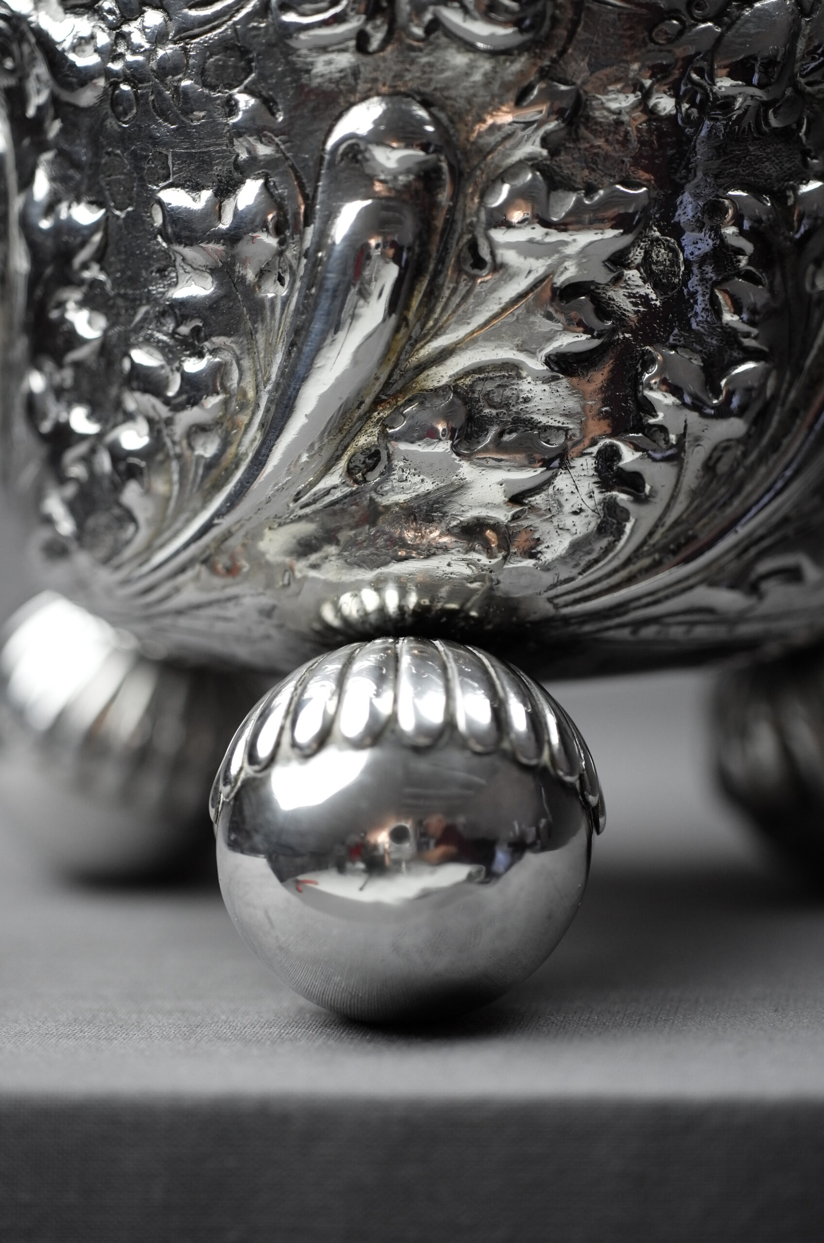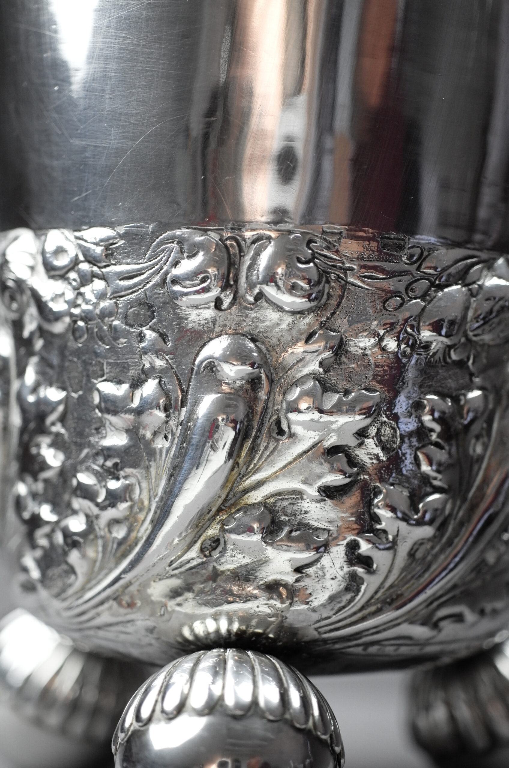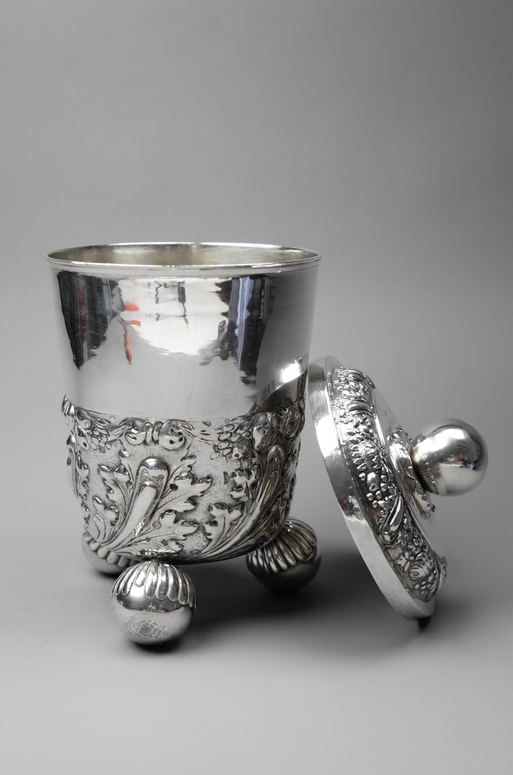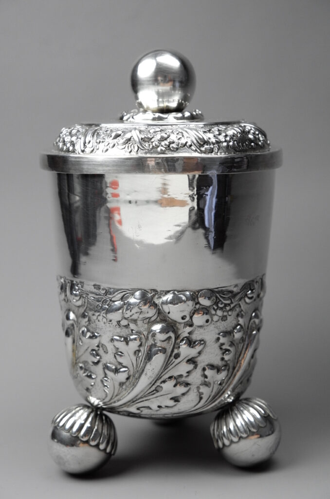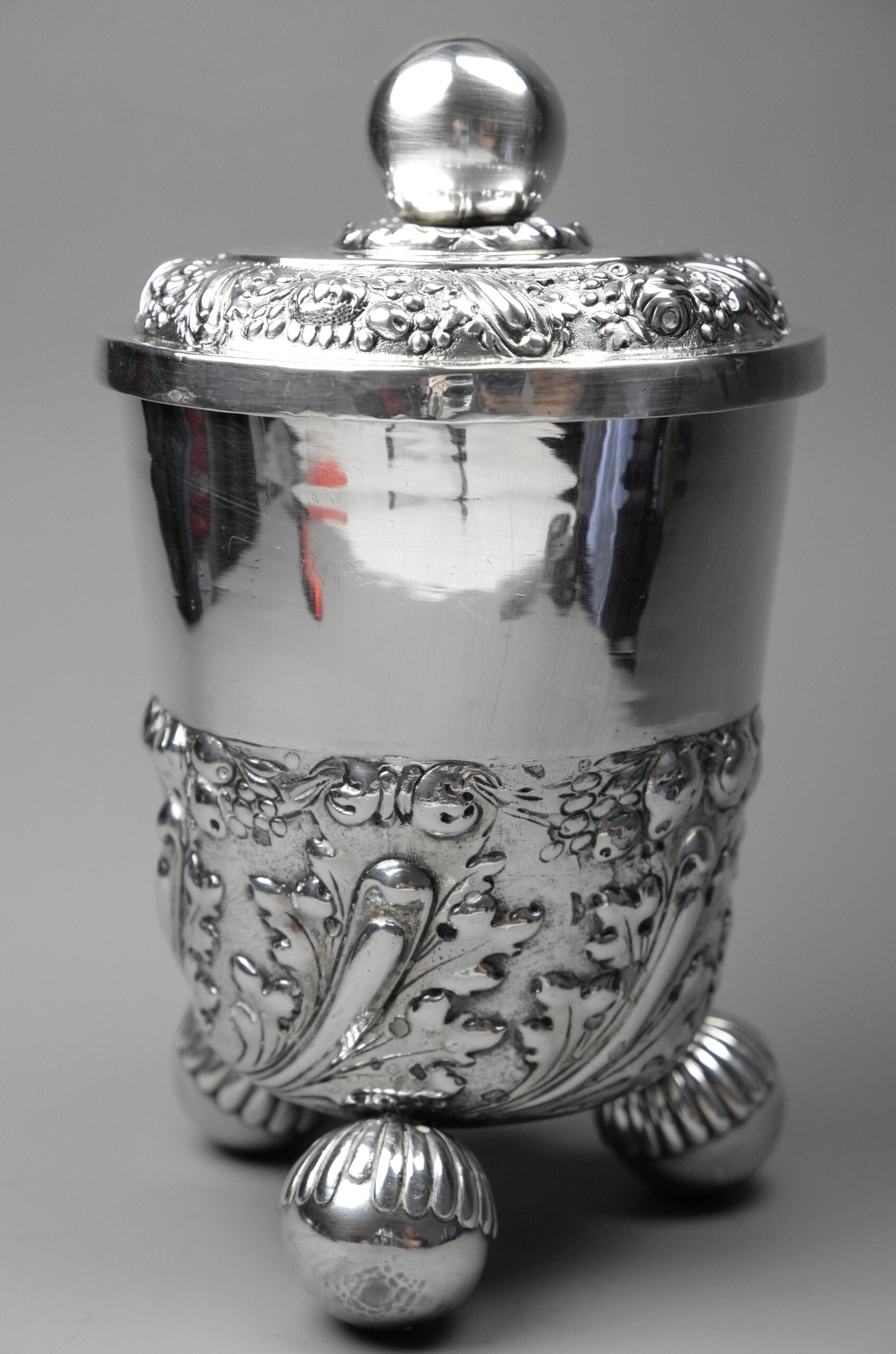 Ein getriebenes, graviertes, ziseliertes und teilweise vergoldetes Deckelgefäß auf drei Kugelfüßen mit Pfeifendekor. Den hohen Korpus zieren im unteren Bereich Akanthus- und Früchtemotive. Der abnehmbare Deckel ist mit Blumendekor verziert und hat einen Kugelknauf.