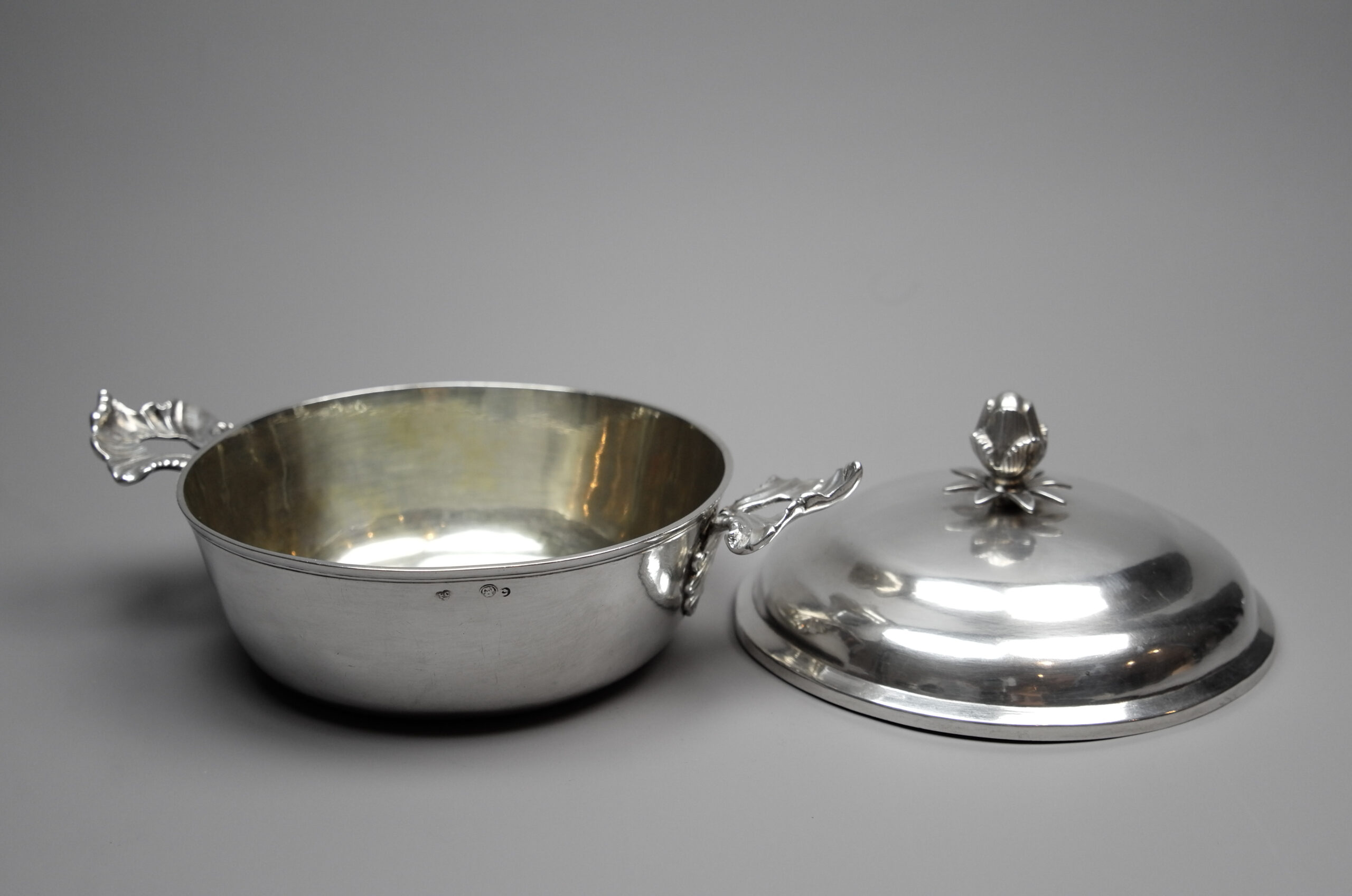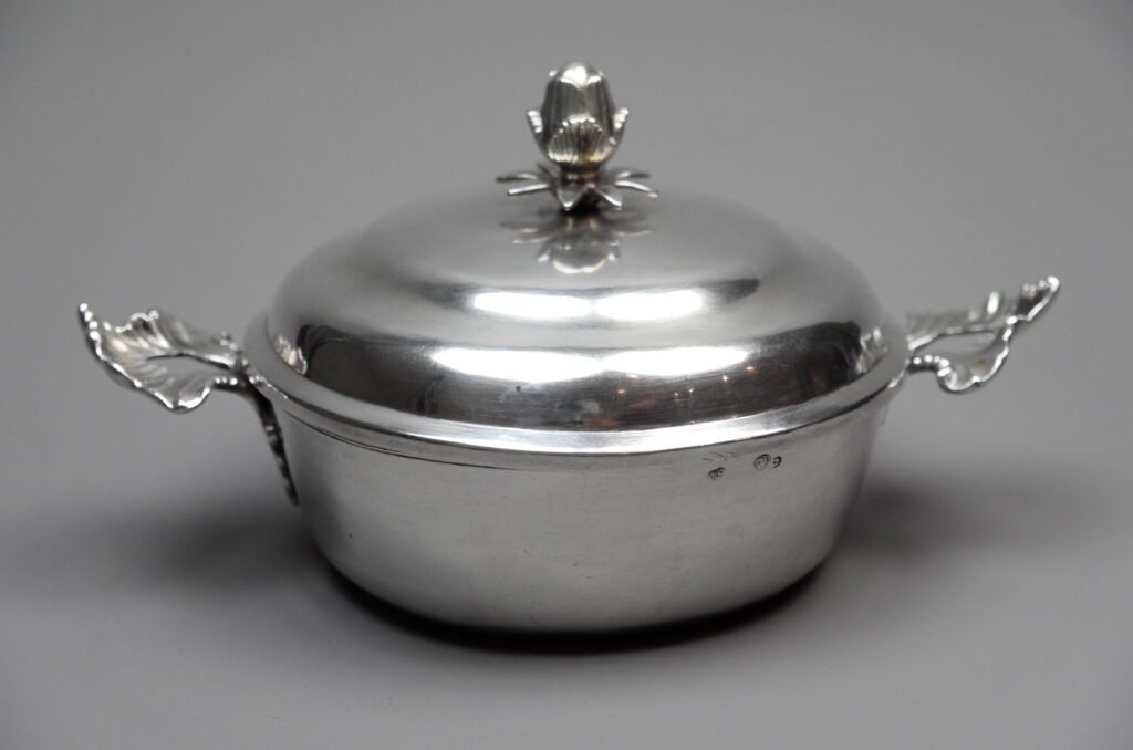 Eine aus Breslau (dem heutigen Wroclaw) stammende Écuelle, die aus einer runden, konischen Schüssel mit zwei seitlichen Rocaillenhenkel besteht. Der abnehmbare Deckel ist getreppt und mit einer plastischen Blüte als Knauf ausgestattet. Die Écuelle ist glatt posliert und innen vergoldet.