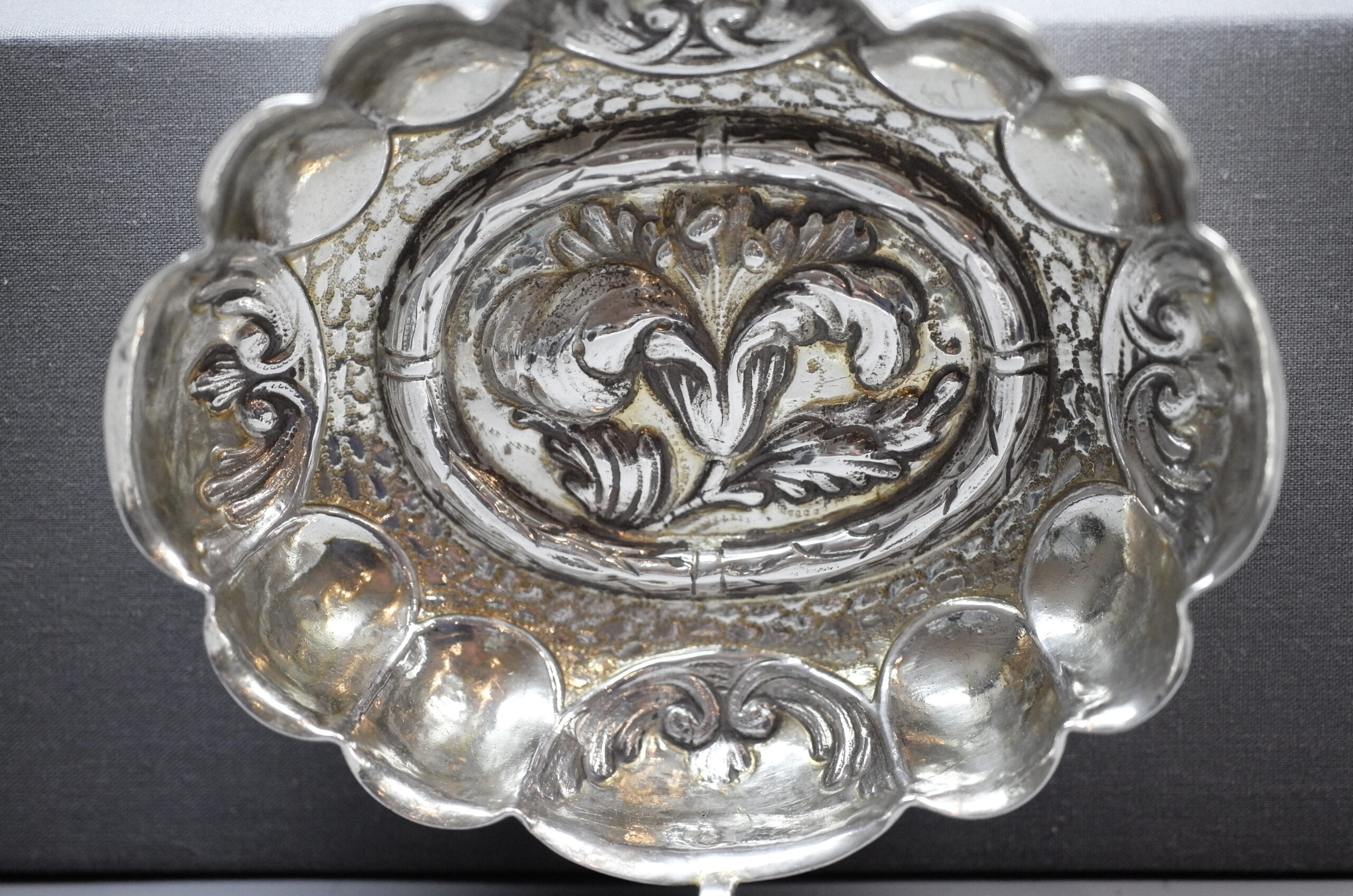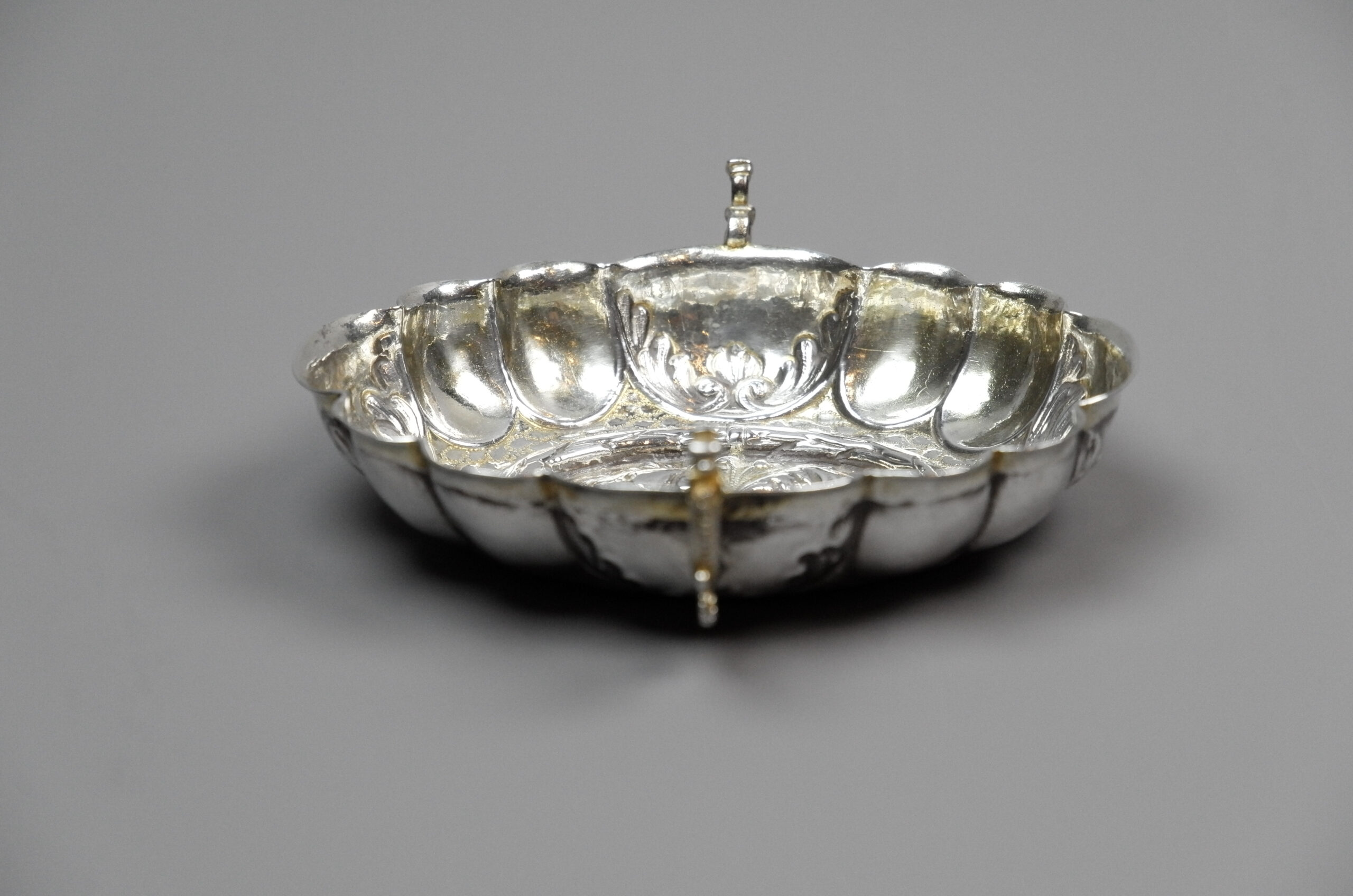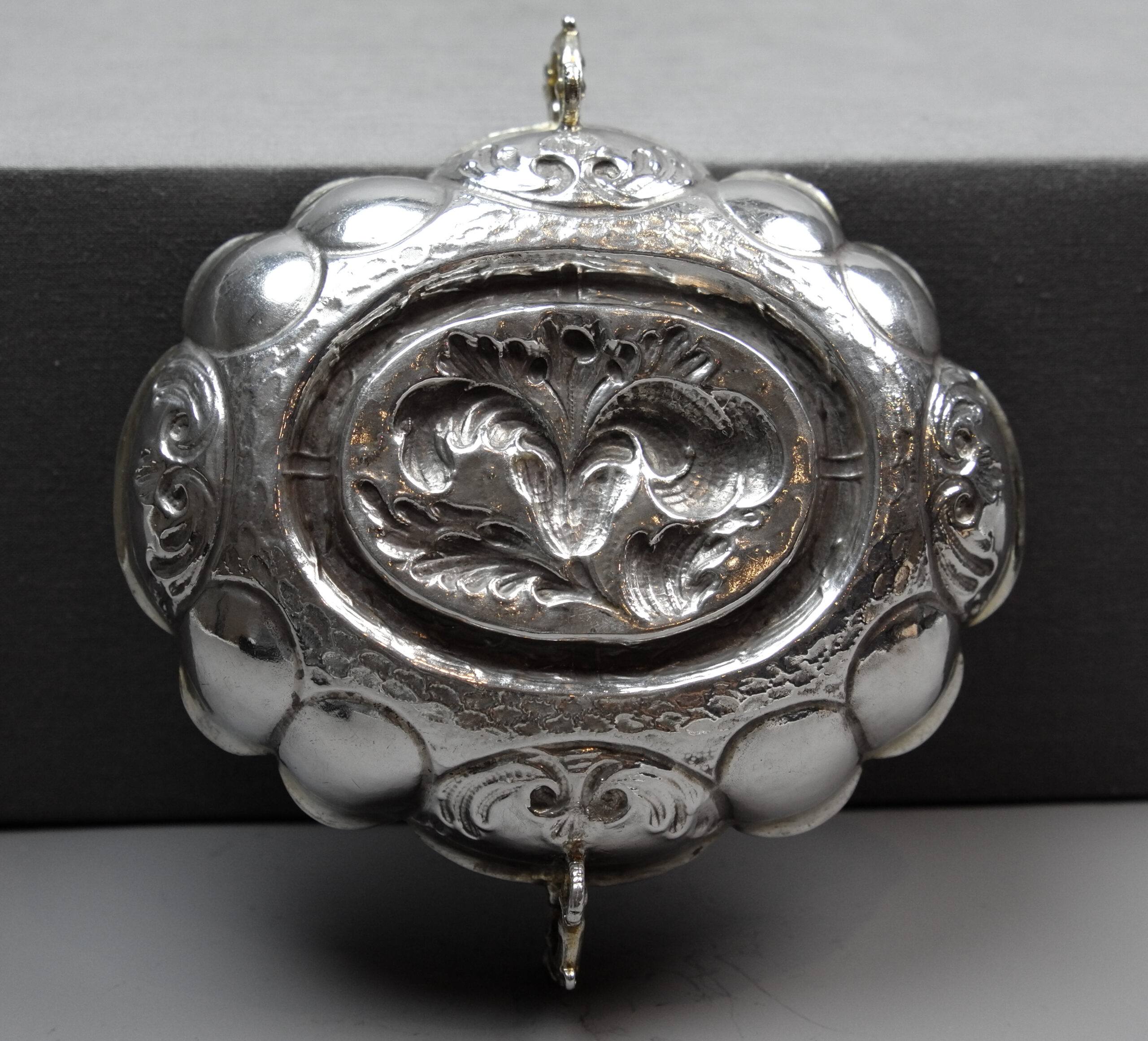 Markiert ist die Schale mit dem Beschauzeichen von Frankfurt am Main sowie mit der Meistermarke von Daniel Laurin, der 1673 zum Meister ernannt wurde.