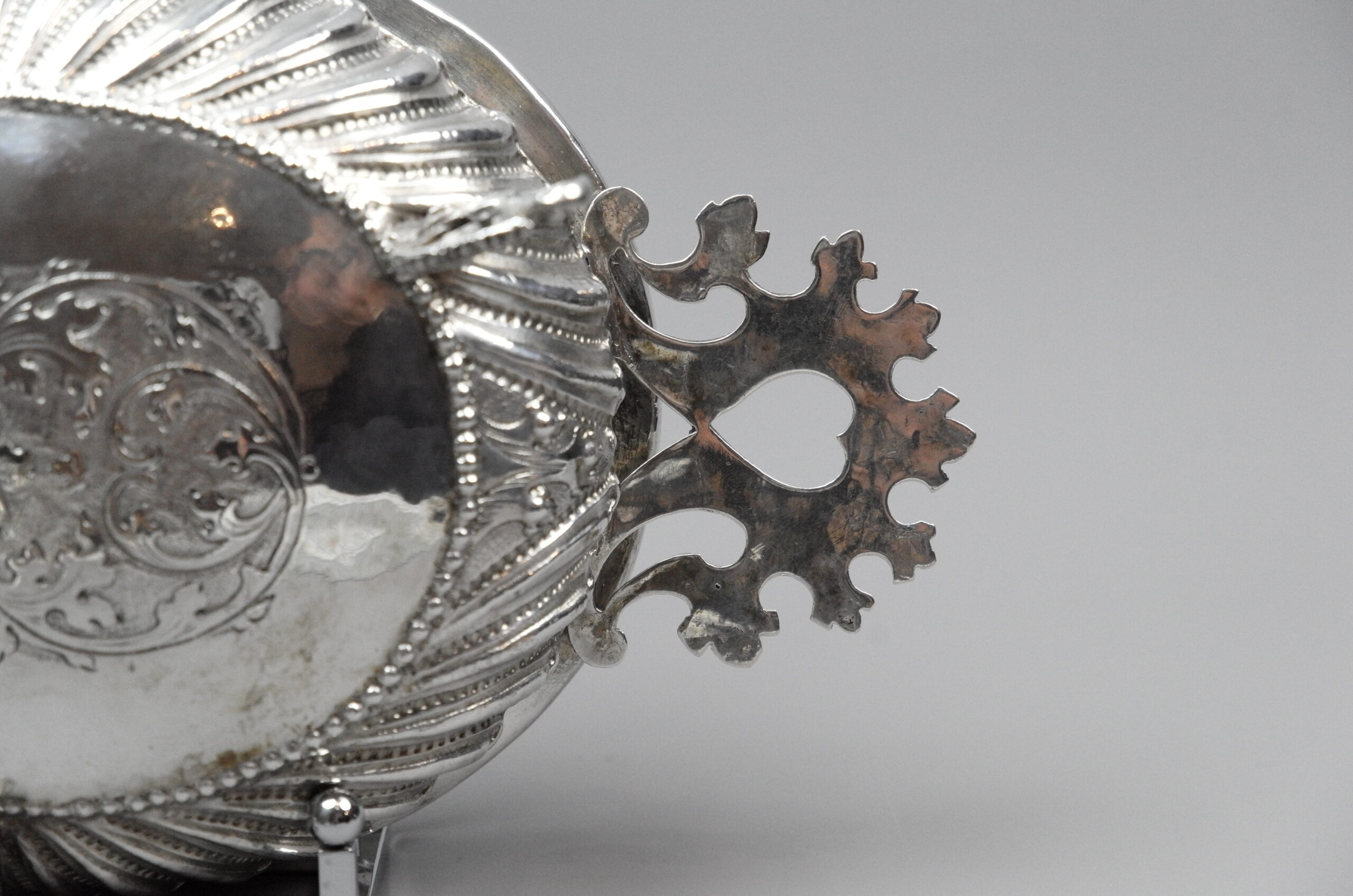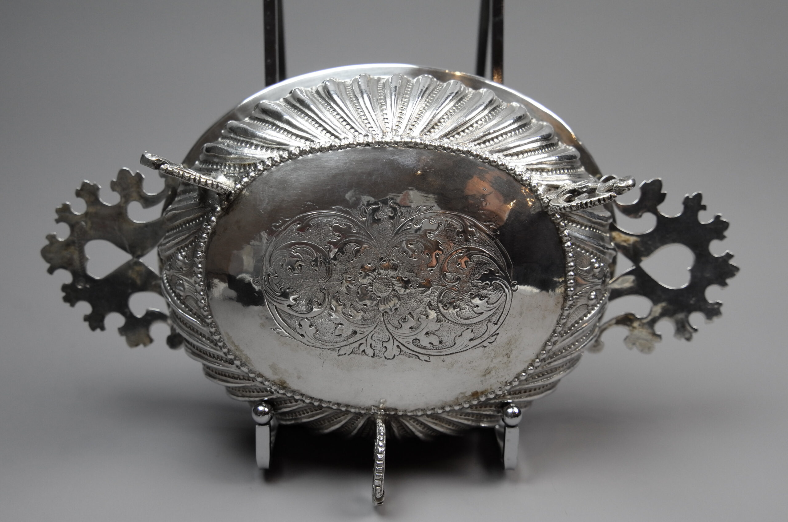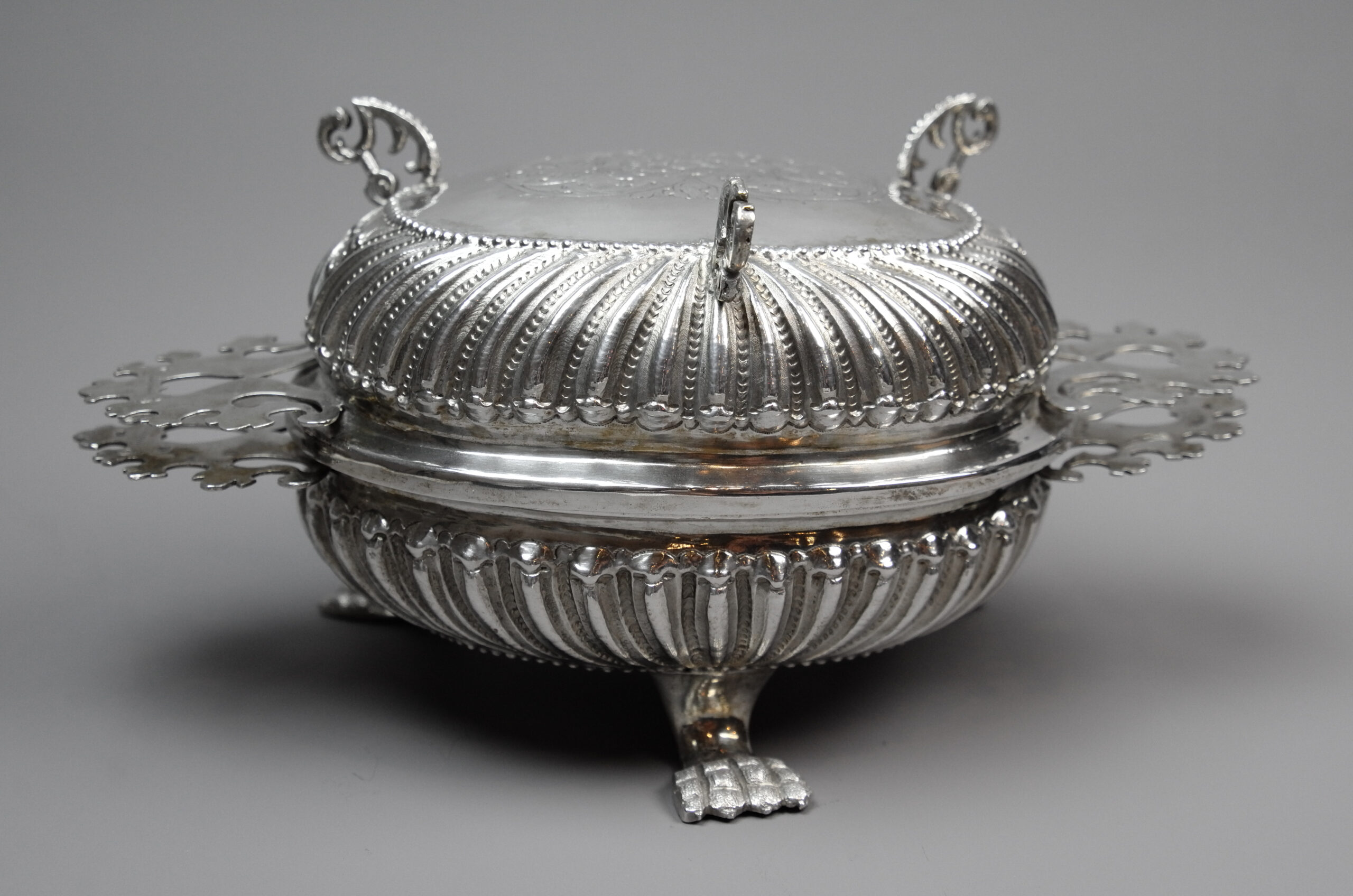 Eine Schale mit gedrückt bauchigem Korpus auf Klauenfüßen und geschweiften, reliefplastischen Rippen. Der Deckel ist mit drei Volutenfüßen ausgestattet. An Schale und Deckel sind flache, passige Griffe angebracht, den Deckel ziert ein geprägtes Blüten-und Blattmuster.