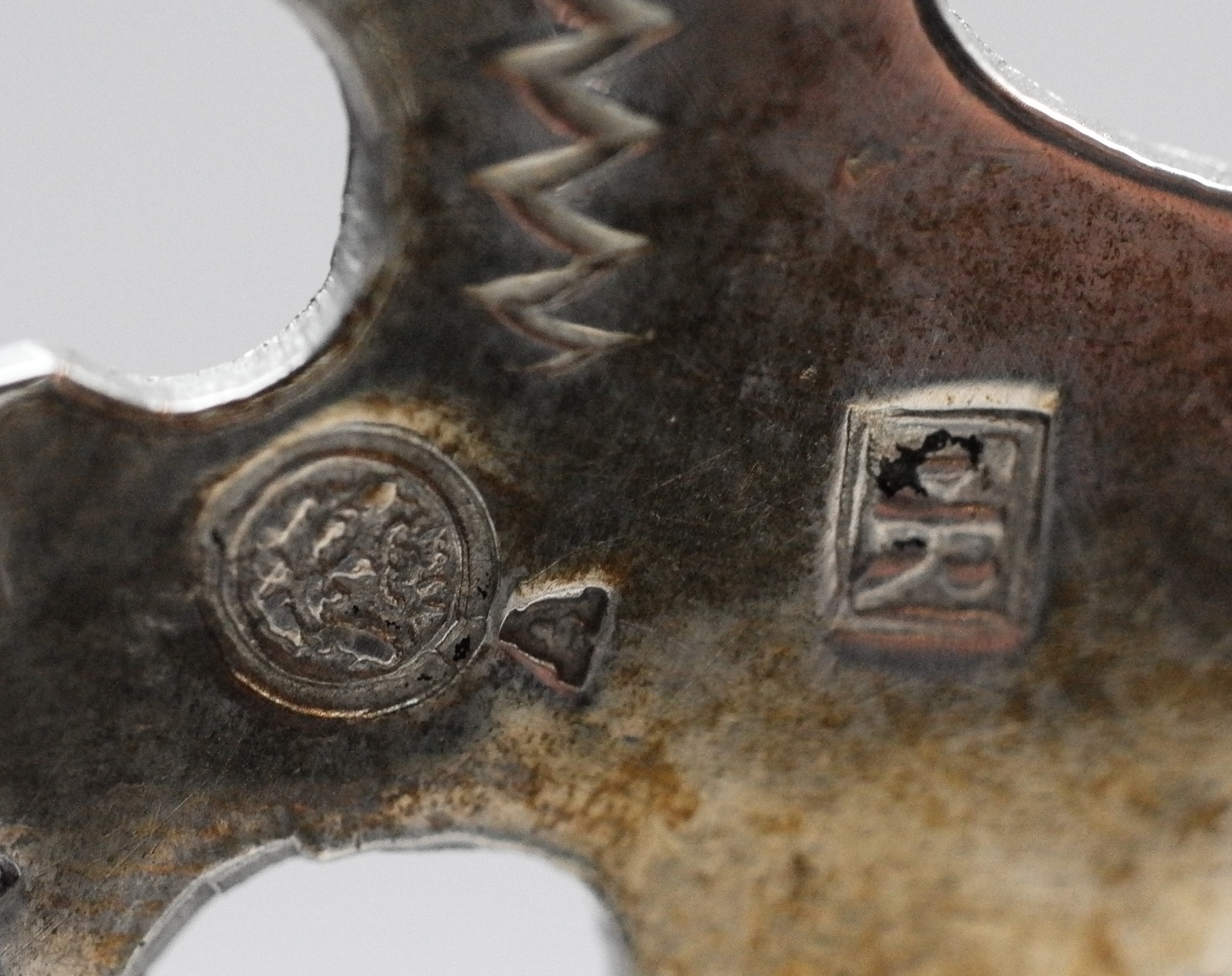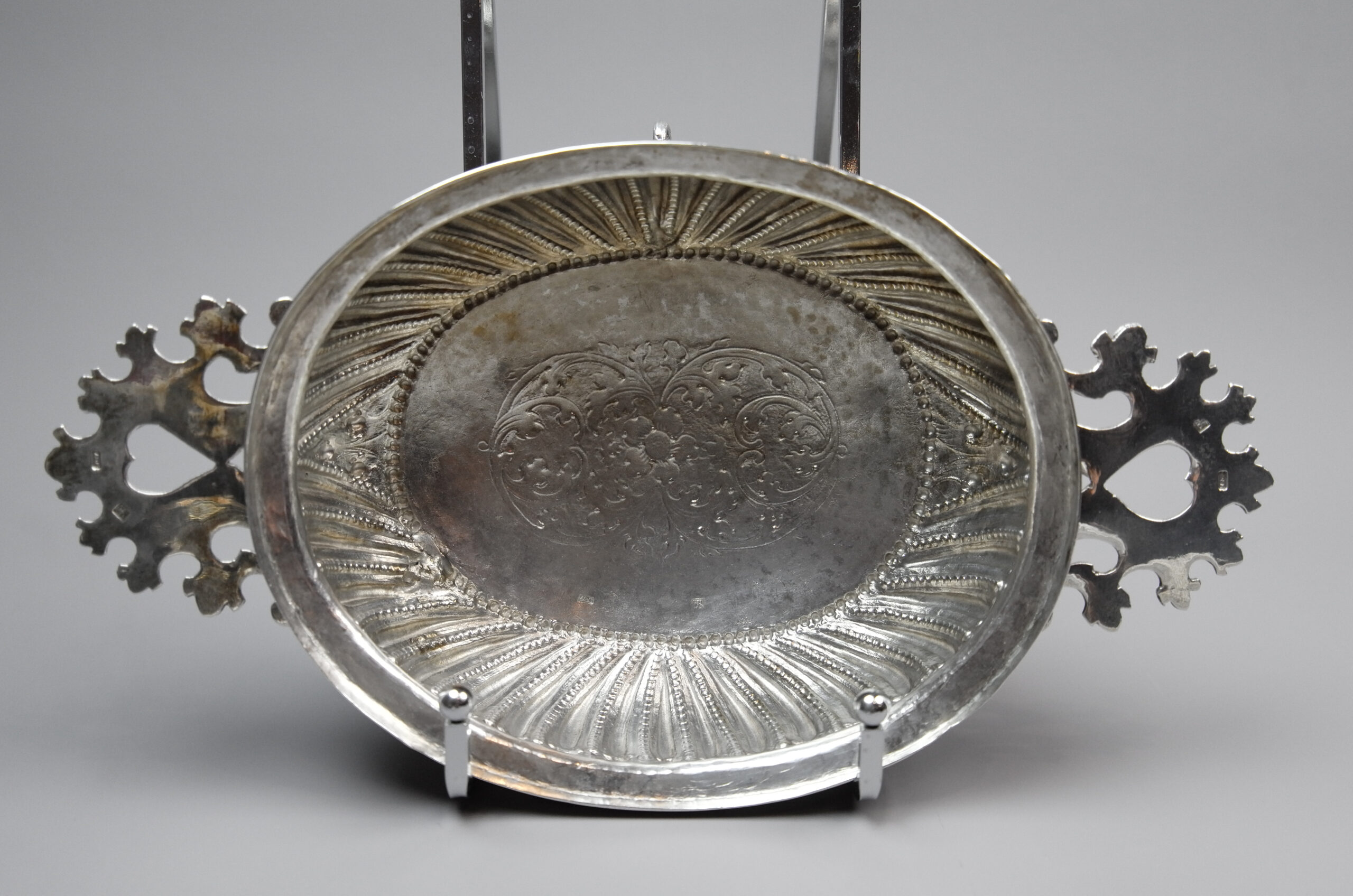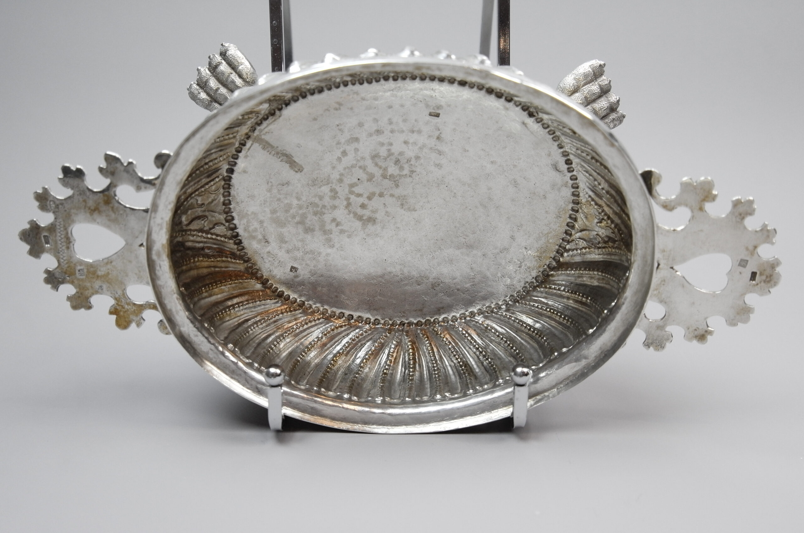 Gepunzt ist die Schale mit dem Johanneskopf im Kreis und dem Buchstaben A als Beschaumarke für Breslau 1710-1712 und mit den Initialen GK im Oval für Gottfried Körner (GNM Lf. Nr. 1430), der von 1685 bis 1722 in Breslau als Meister tätige war.