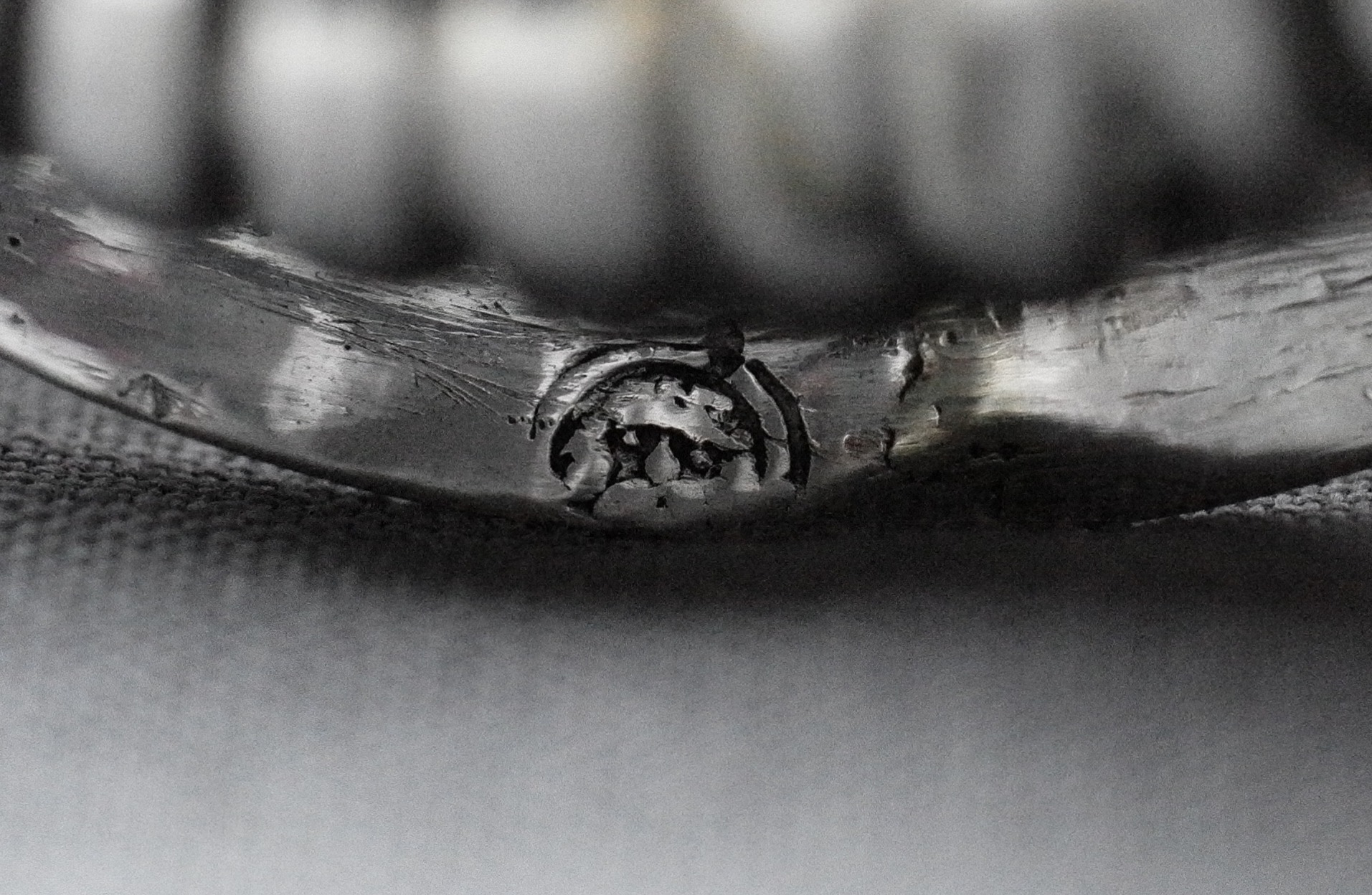 Der Johanneskopf im Kreis steht für die Beschaumarke von Breslau, die Initialen C·F im Herz stehen für den Meister Caspar Francke (Vgl. Die Breslauer Goldschmiede, Erwin Hinze, Meisterzeichen 131), der von 1711 bis 1735 in Breslau tätig war.
