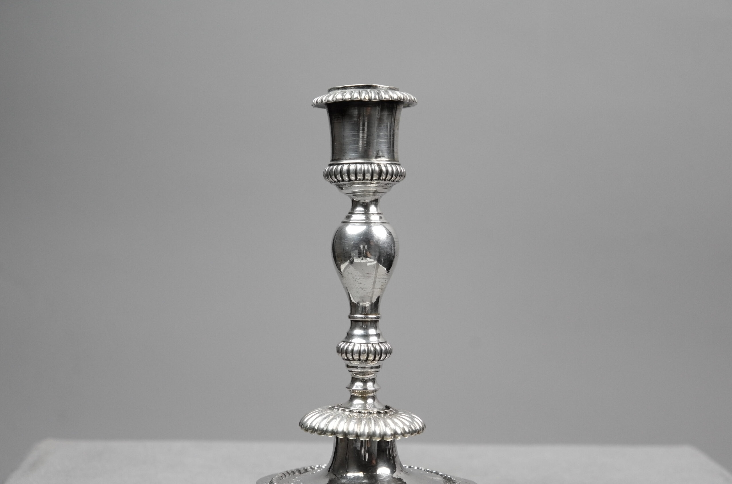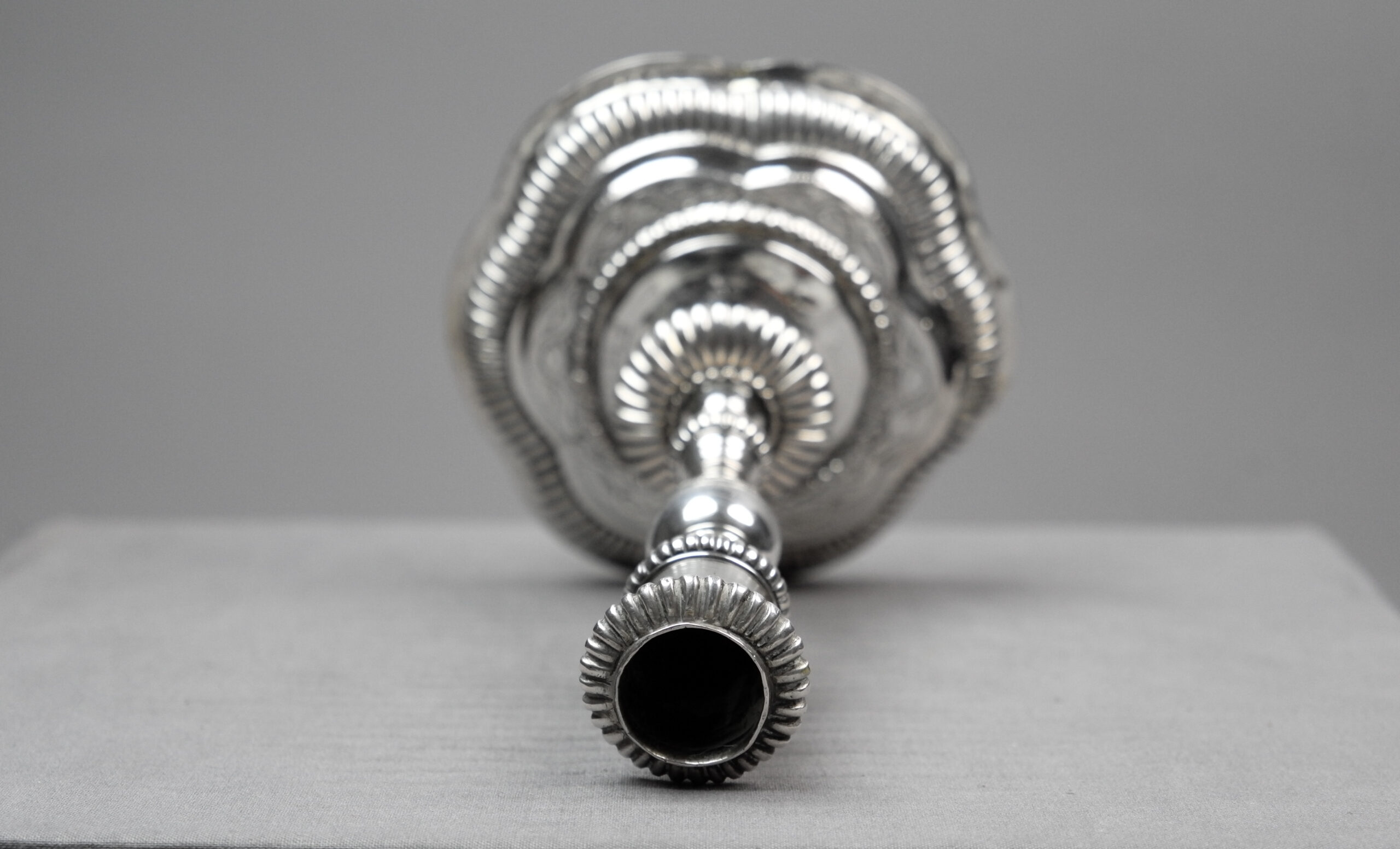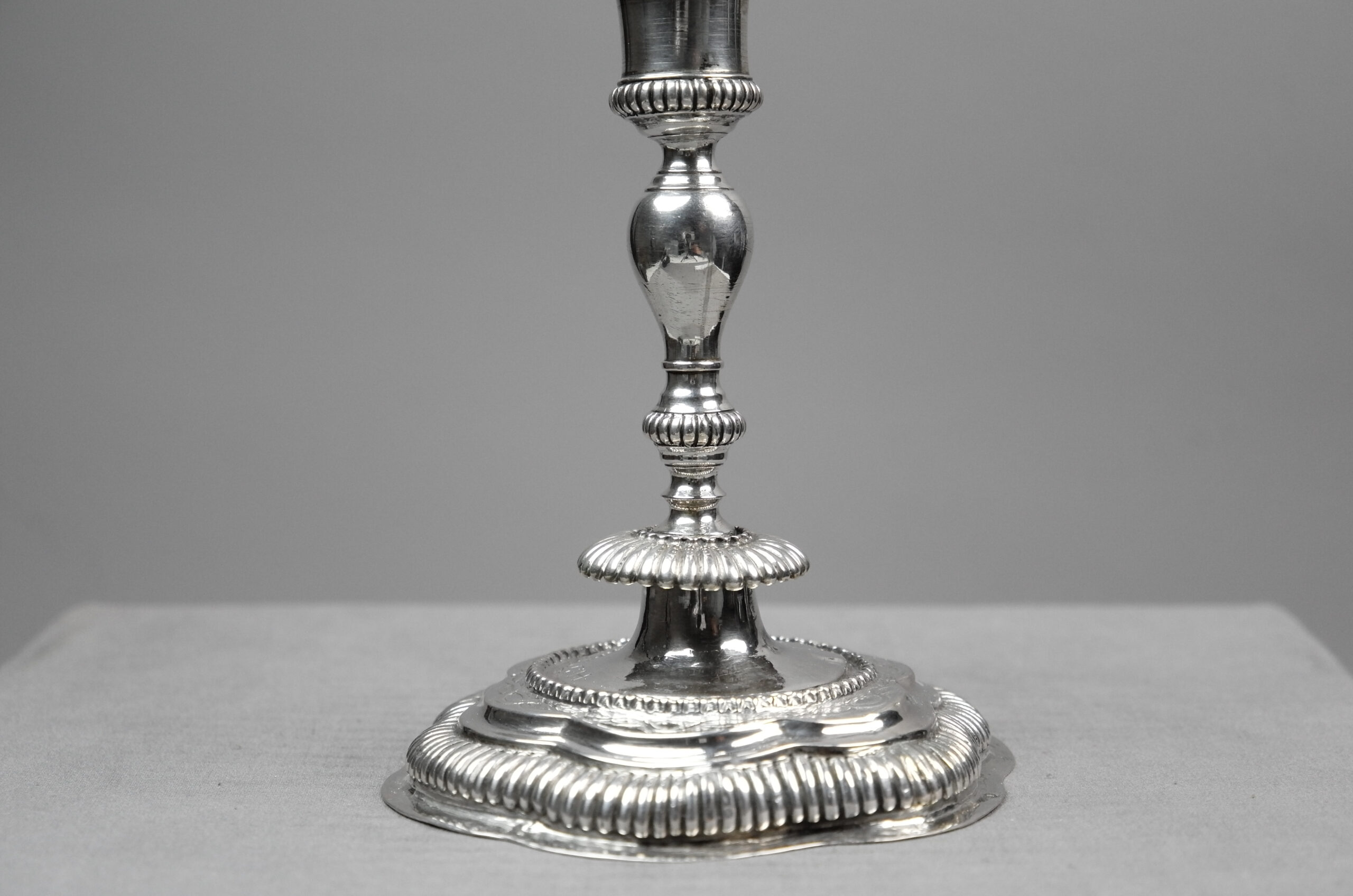 Der Breslauer Kerzenleuchter steht auf einem mehrpassigen Fuß, der Schaft ist balusterförmig aufgebaut und der Leuchter ist mit Blattmuster und Perlband dekoriert.