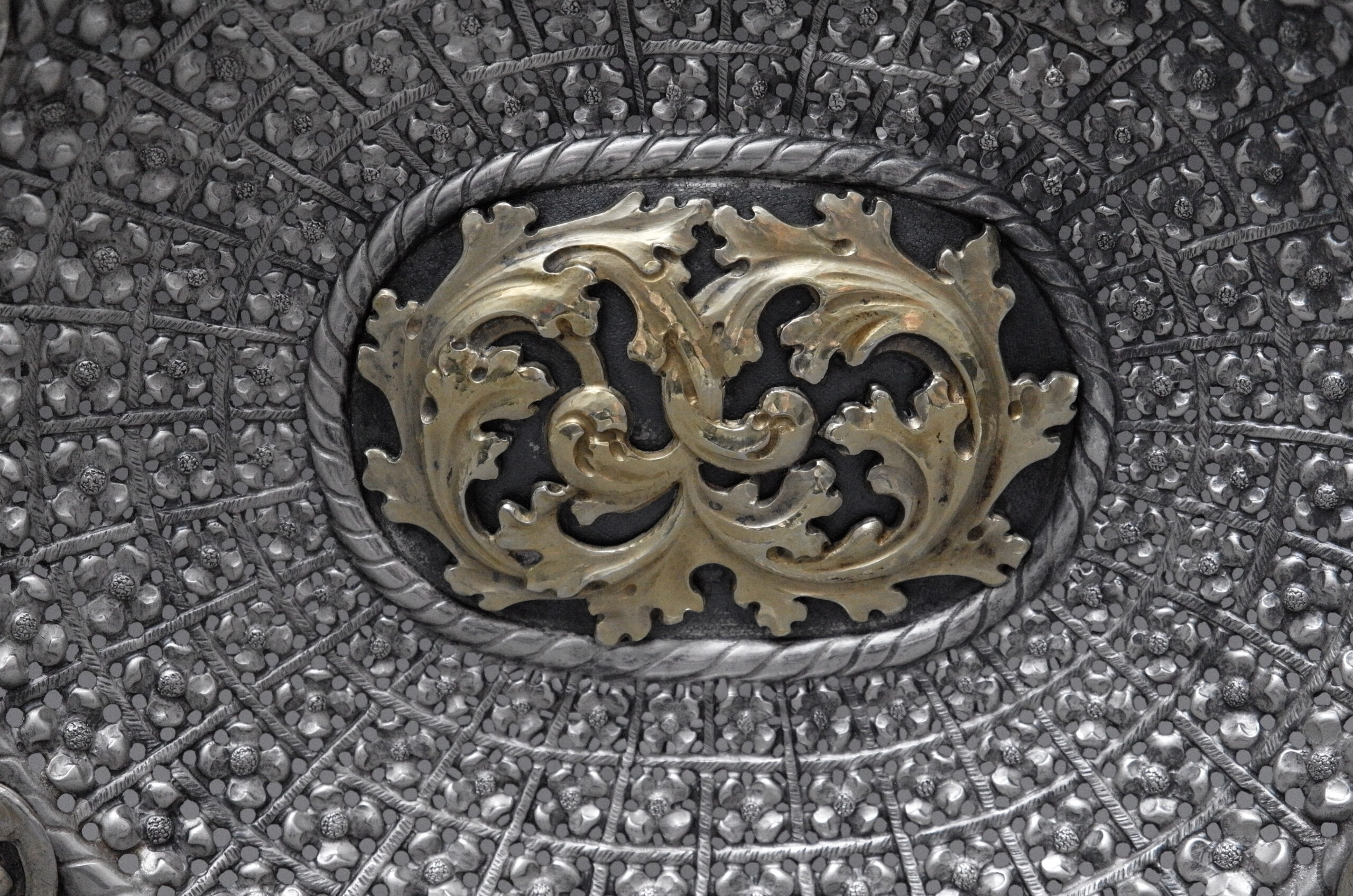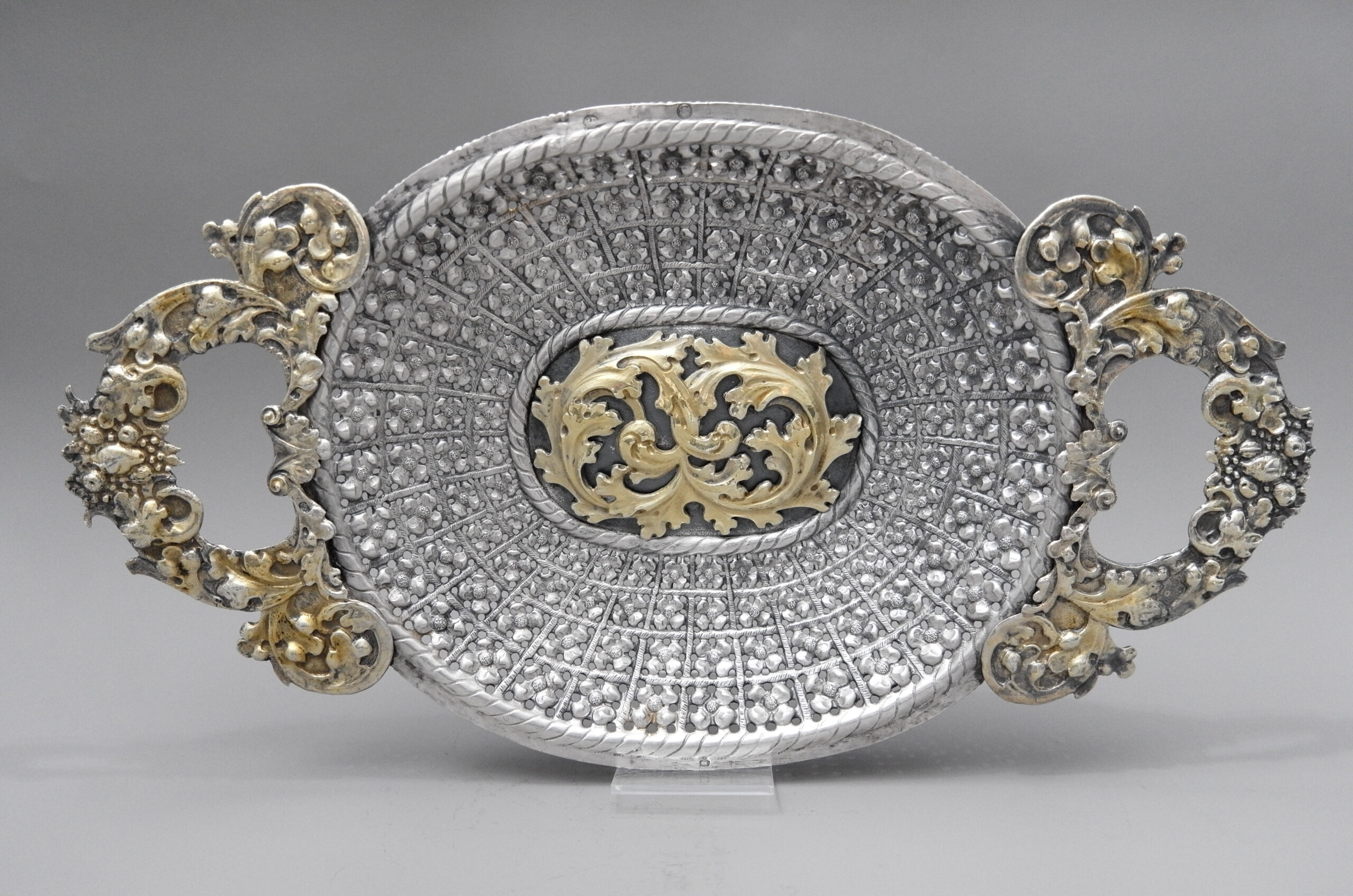 Eine prachtvoll gestaltete ovale Schauplatte mit gänzlich durchbrochenem Muster an der Fahne, das aus einzelnen und sich zum Spiegel verjüngenden plastischen und vierblättrigen Blüten besteht. Den Spiegel ziert ein vergoldetes und plastisches Akanthusbouquet. Die vergoldeten Handhaben bestehen aus legierten plastischen Blatt- und Fruchtmotiven