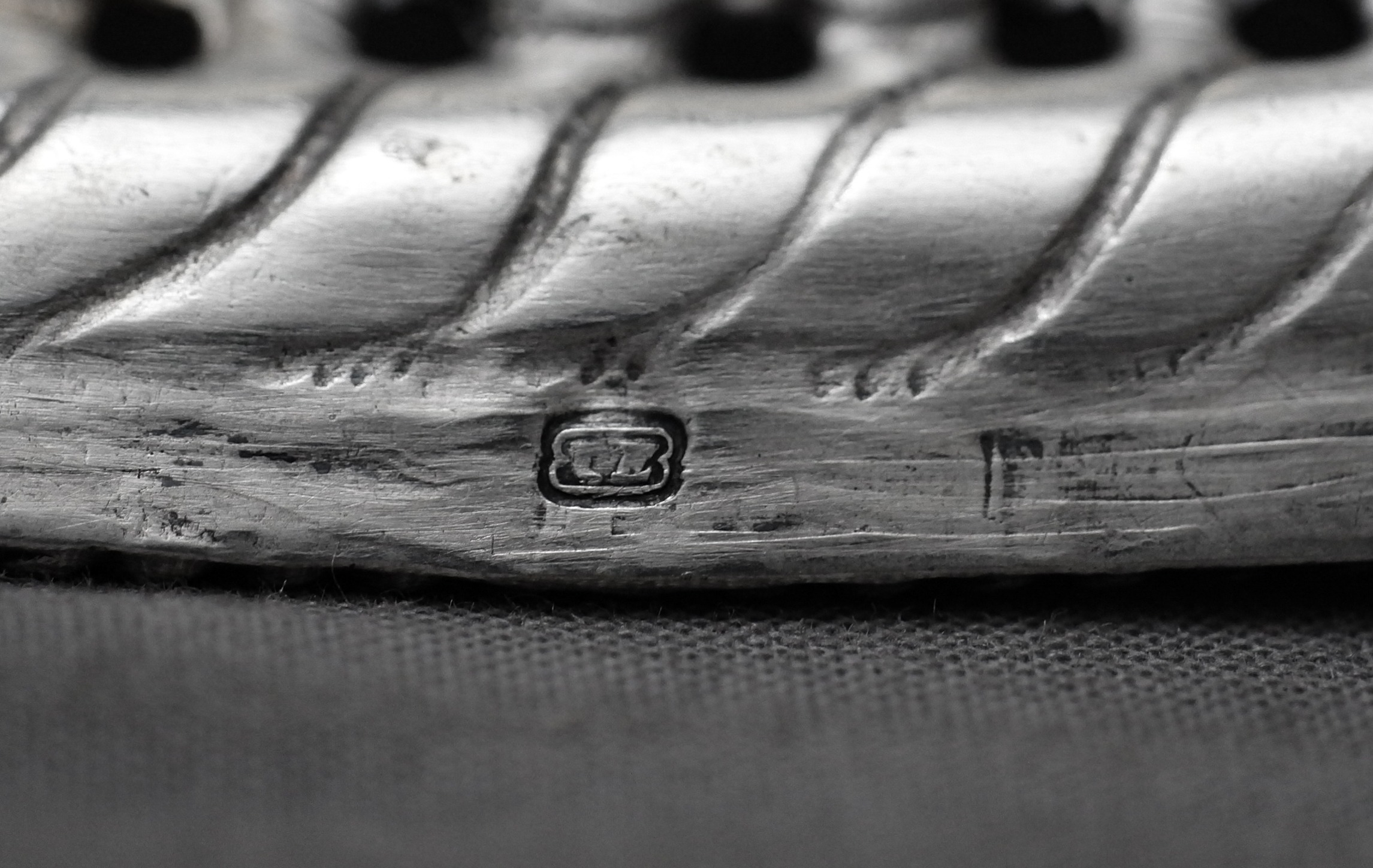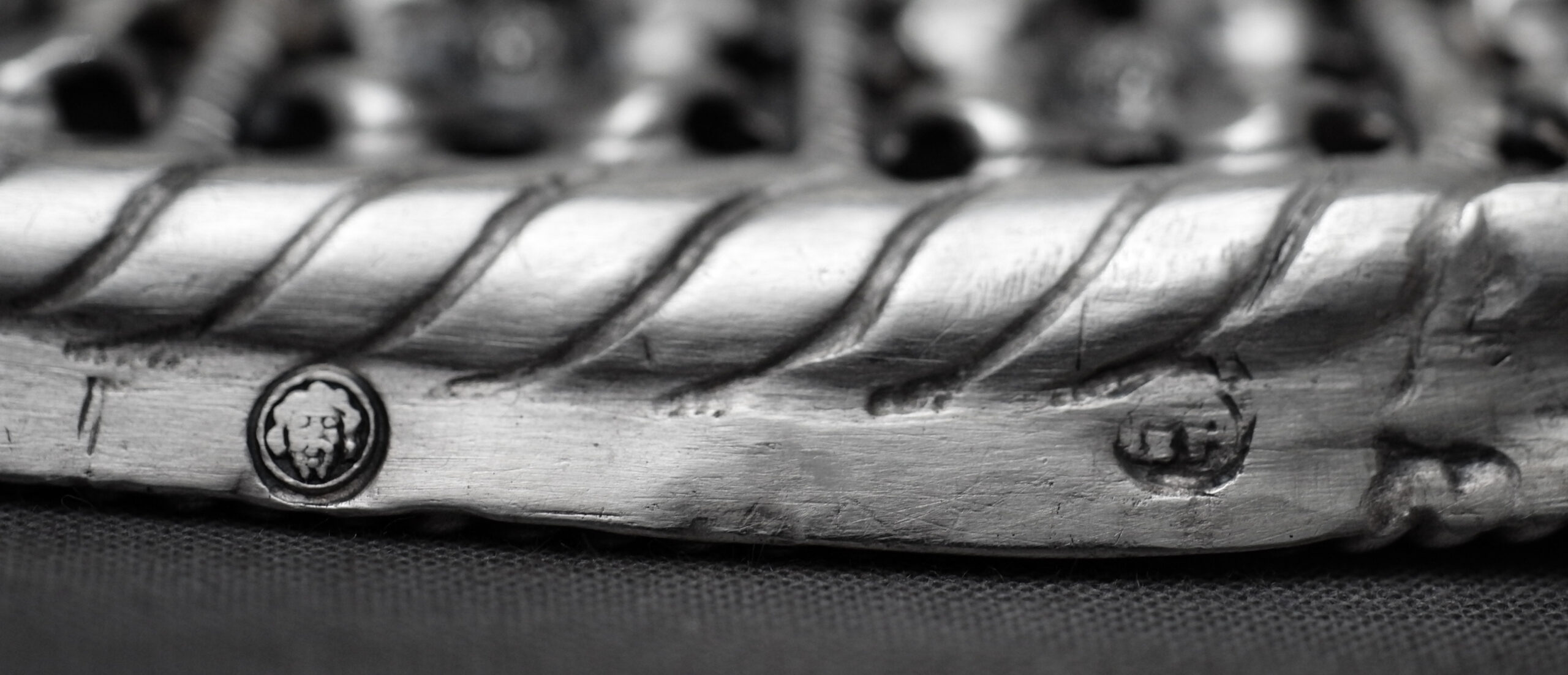 Gepunzt ist die Schauplatte mit dem Johanneskopf im Kreis als Stadtmarke für Breslau und mit den Initialen GH im Oval für den Breslauer Meister Gottfried Heintze, der 1673 Meister wurde und 1707 verstarb.