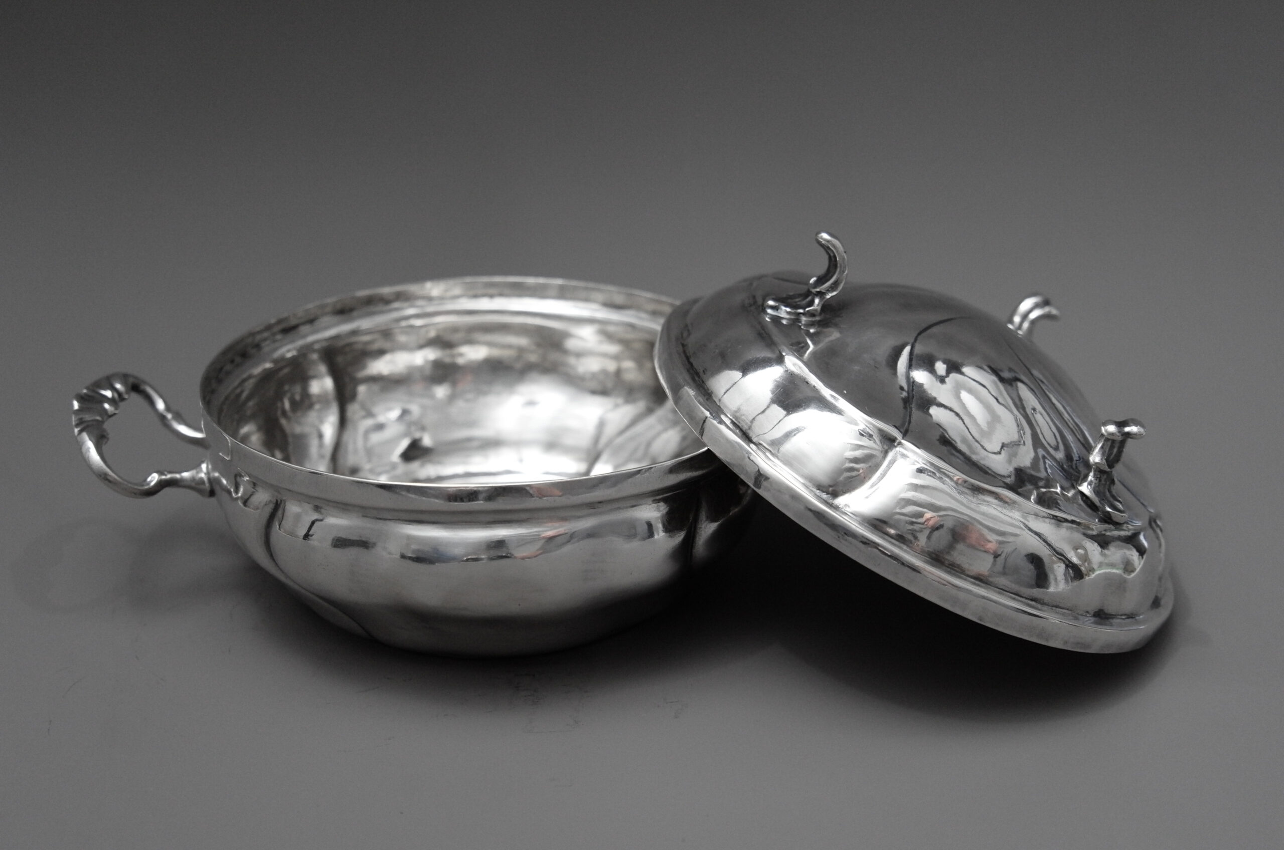 Gepunzt ist die Écuelle mit der Pyr mit dem Buchstaben O als Stadtmarke für Augsburg 1759-1761 sowie mit den Initialen CD im Oval für den Meister Christian Drentwett II (Seling 2427), der von 1754 bis 1801 in Augsburg als Meister tätig war.
