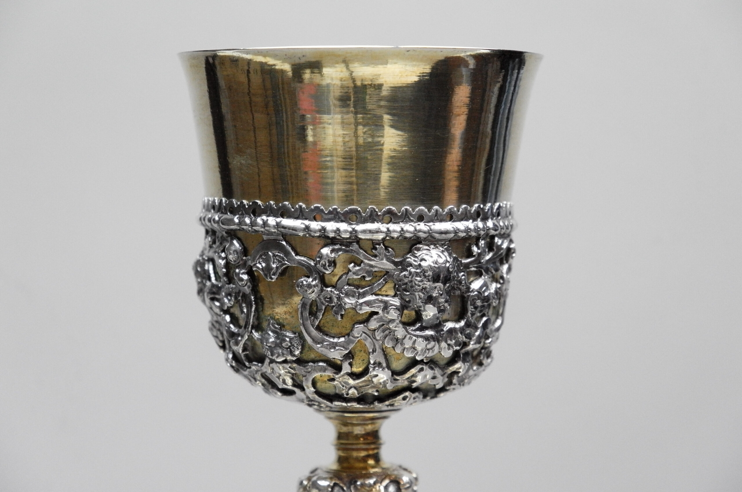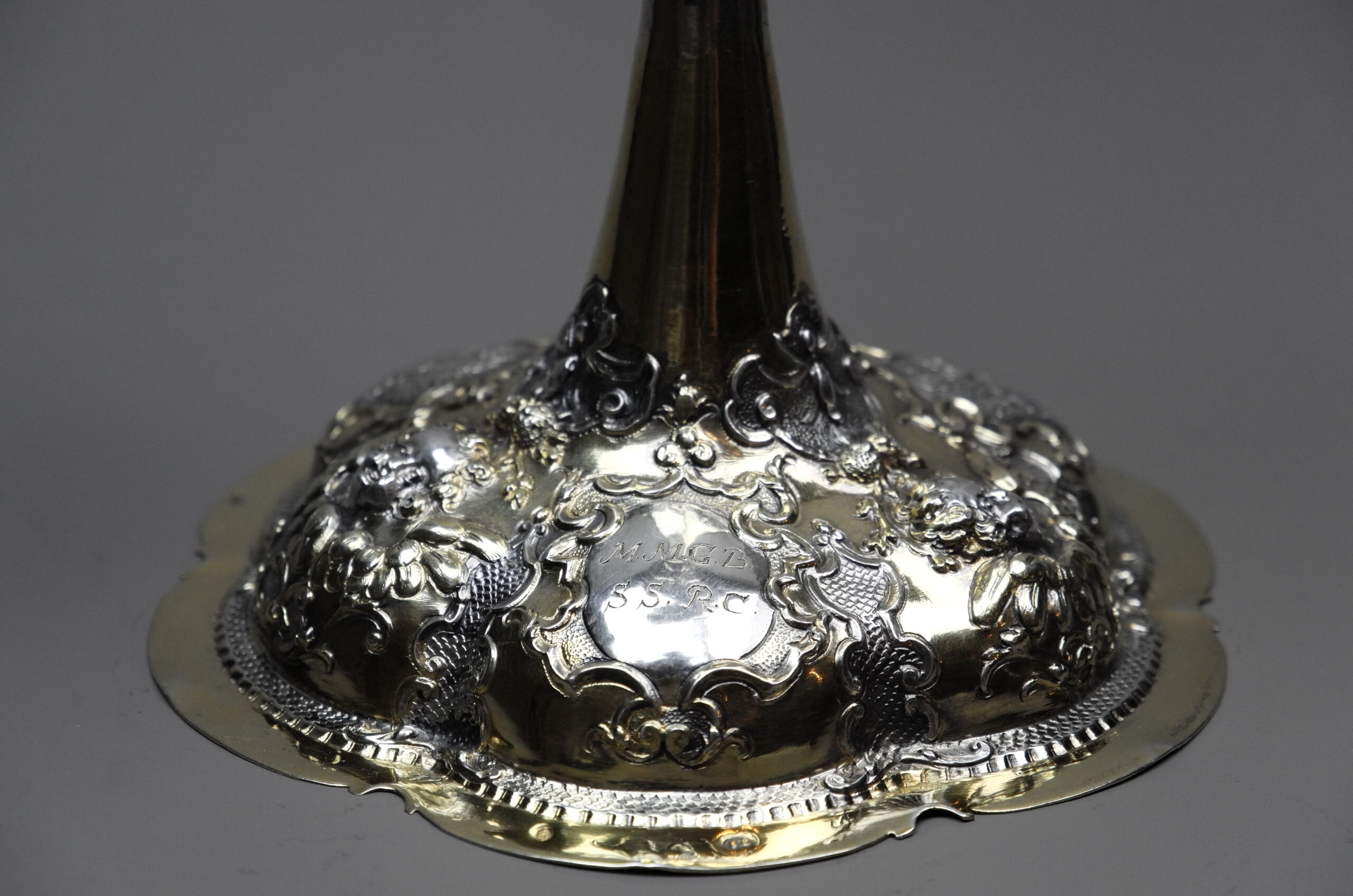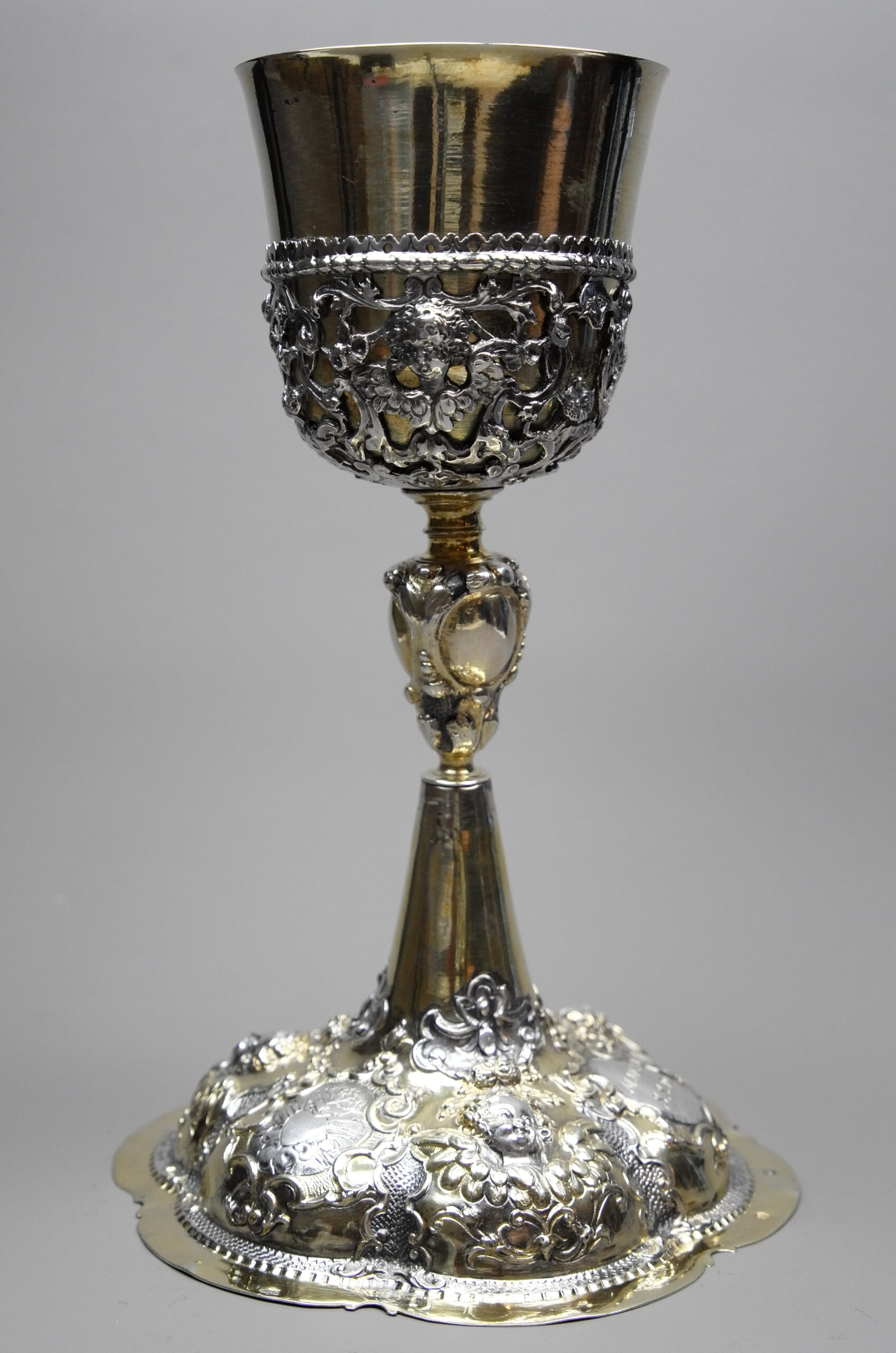 Dieser silberne Messkelch ist getrieben, gegossen und teilweise vergoldet. Der sechspassige, aufgewölbte Fuß ist mit getriebenen Cherubköpfen im Wechsel mit Flammenden Herzen dekoriert. Eine zentrale Kartusche ist mit dem Monogramm „M.M.G.B. S.S.R.C.“ graviert. Kuppakorb und Nodus entsprechen der Fußgestaltung, die konische Kuppa ist mit ausgestelltem Lippenrand geformt.