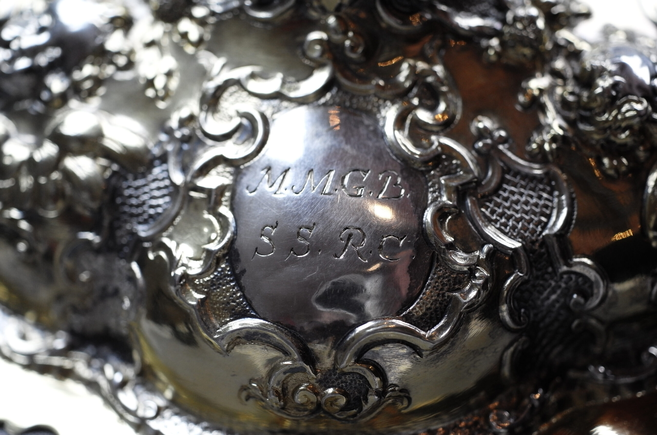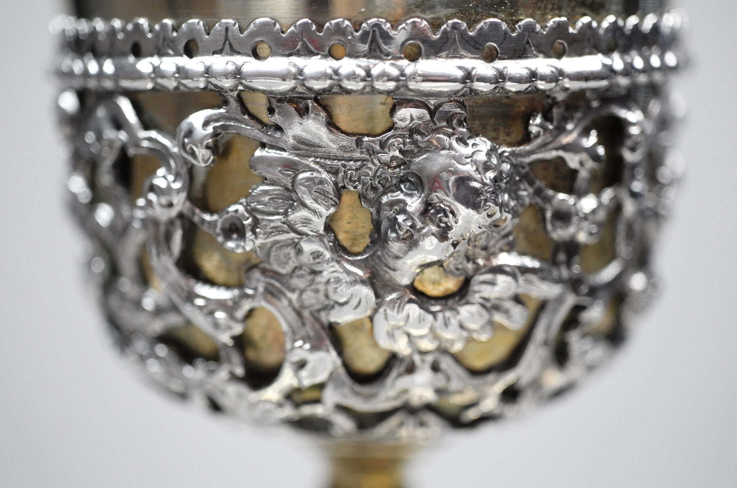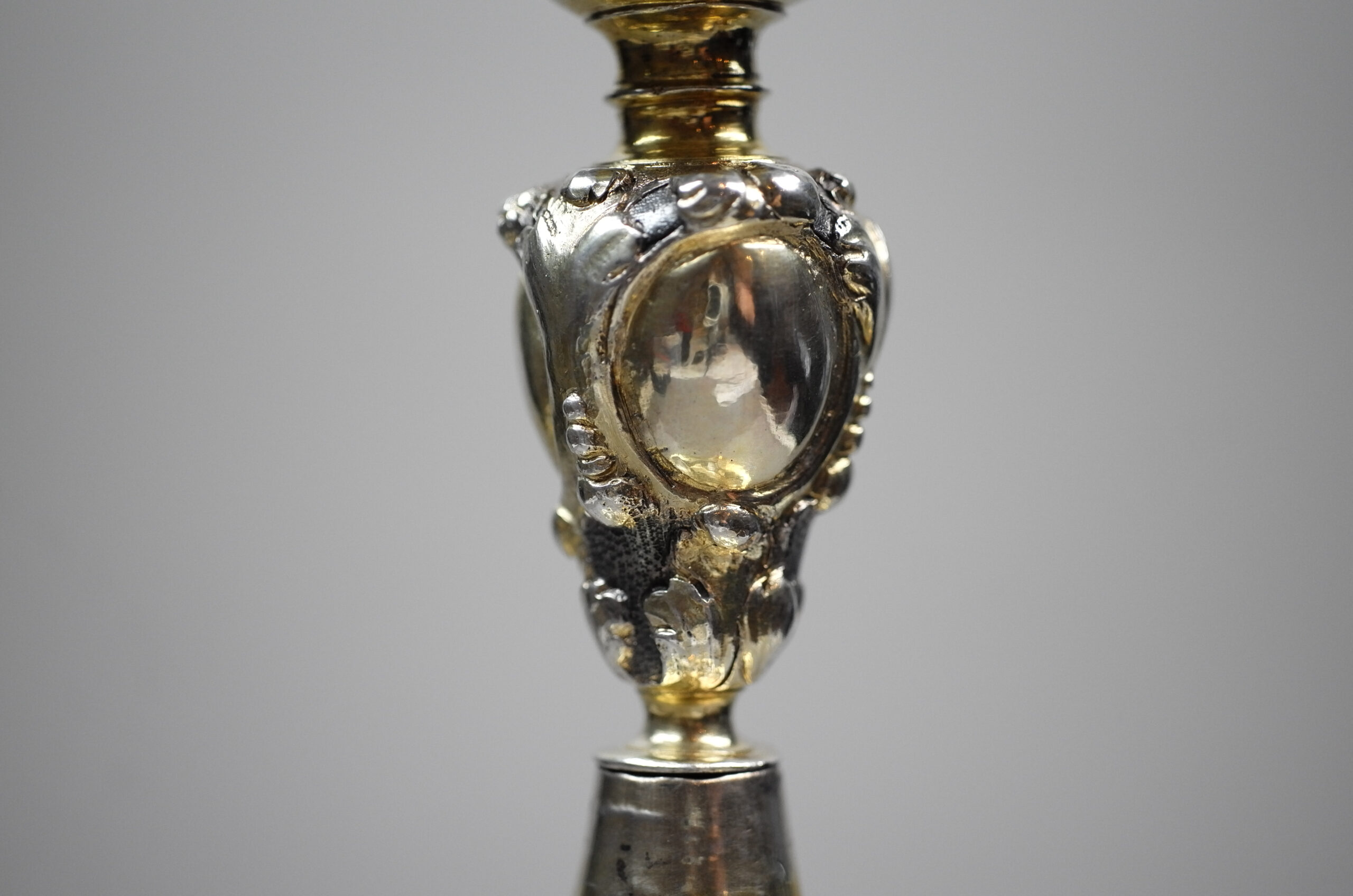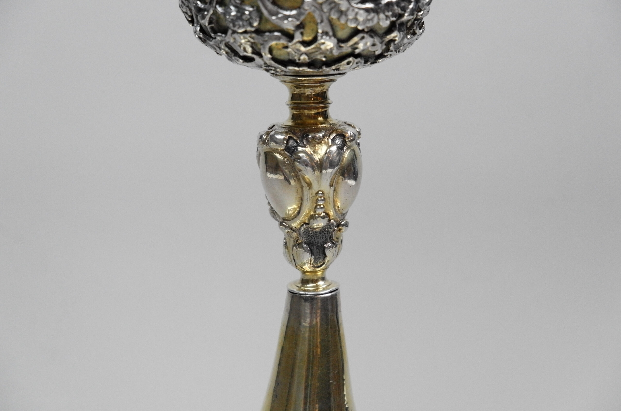 Dieser silberne Messkelch ist getrieben, gegossen und teilweise vergoldet. Der sechspassige, aufgewölbte Fuß ist mit getriebenen Cherubköpfen im Wechsel mit Flammenden Herzen dekoriert. Eine zentrale Kartusche ist mit dem Monogramm „M.M.G.B. S.S.R.C.“ graviert. Kuppakorb und Nodus entsprechen der Fußgestaltung, die konische Kuppa ist mit ausgestelltem Lippenrand geformt.