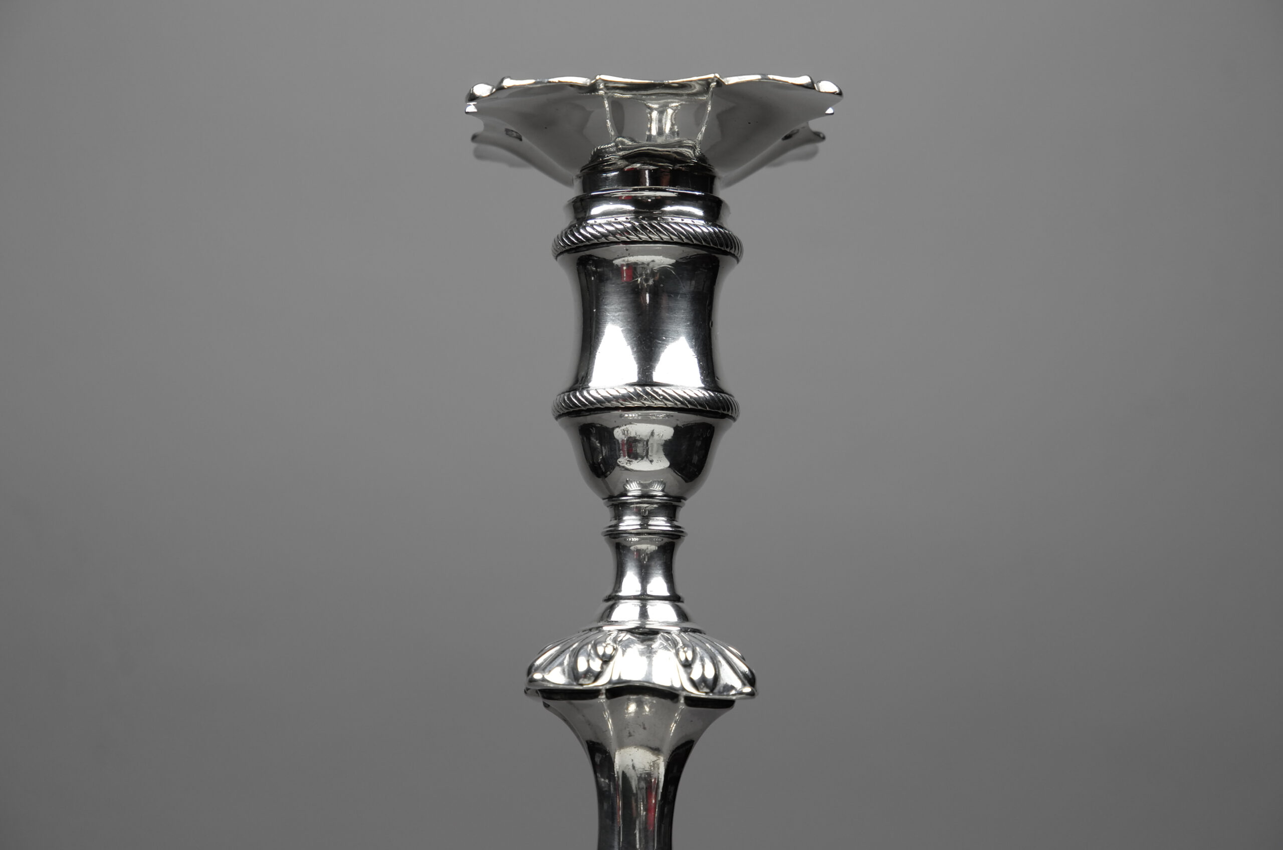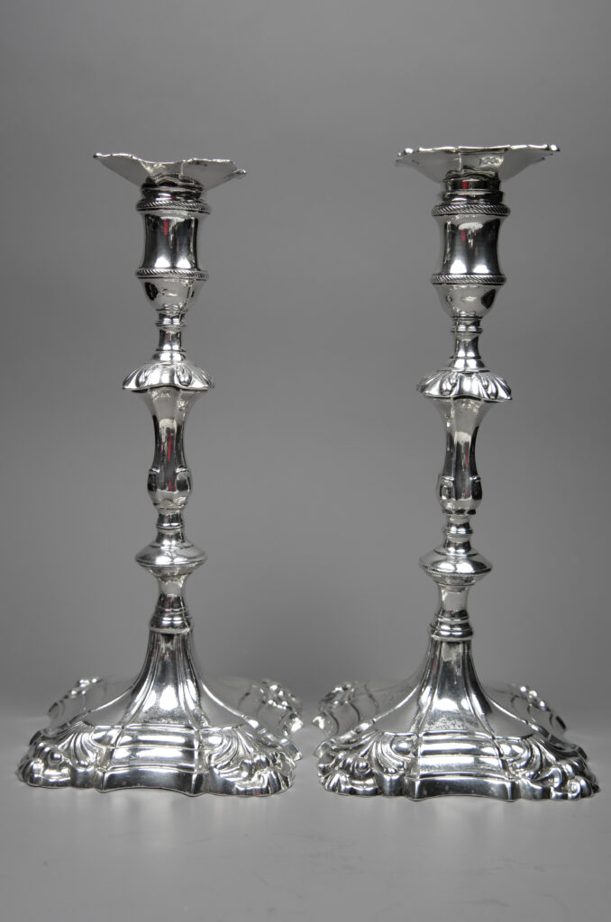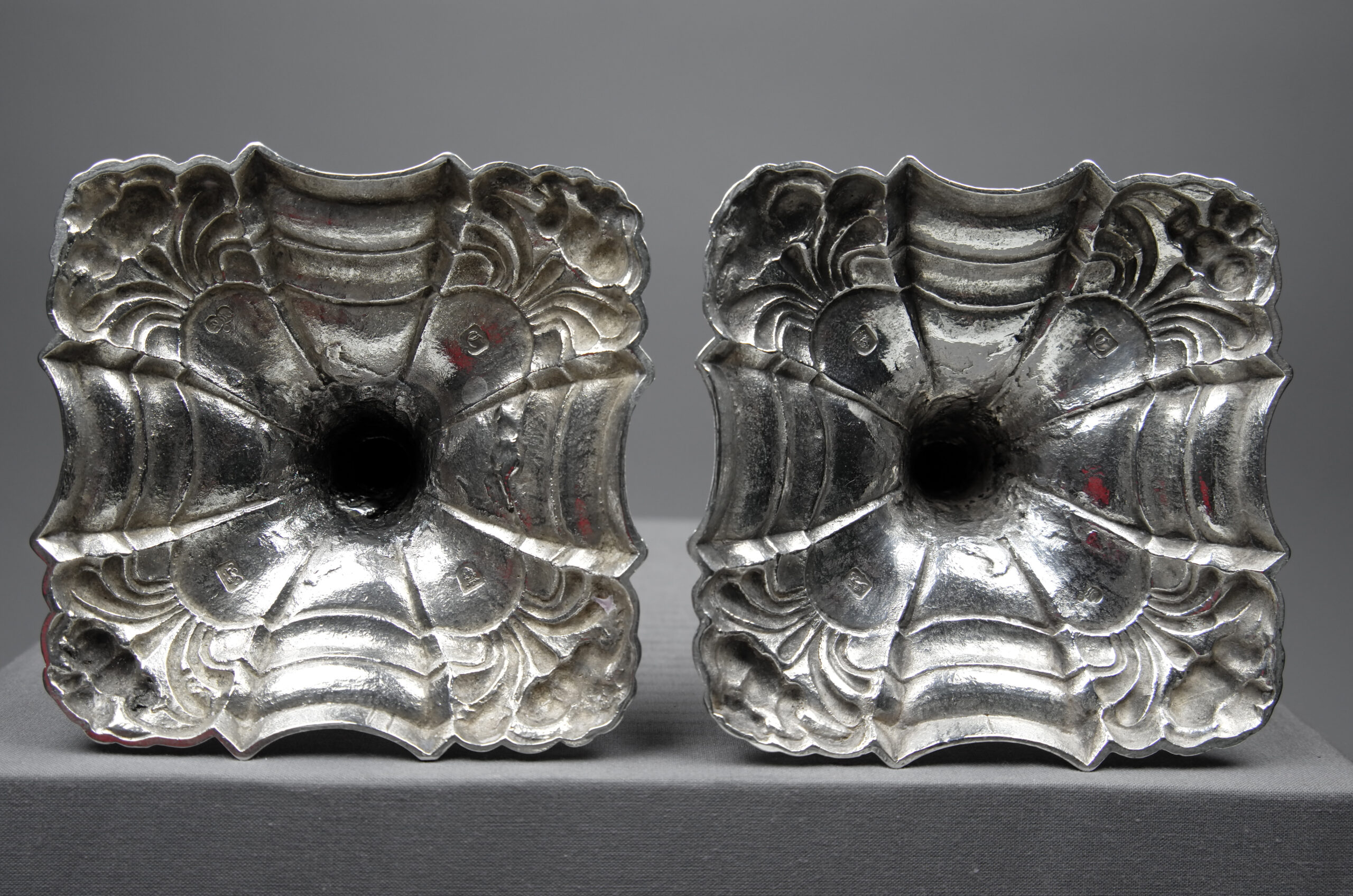 Gepunzt sind die Leuchter mit dem linksschreitenden Löwen für Sterlingsilber, mit dem gekrönten Leopardenkopf für London, mit WC unter Stern für den Meister William Cafe sowie mit dem Jahresbuchstaben C für das Jahr 1758.