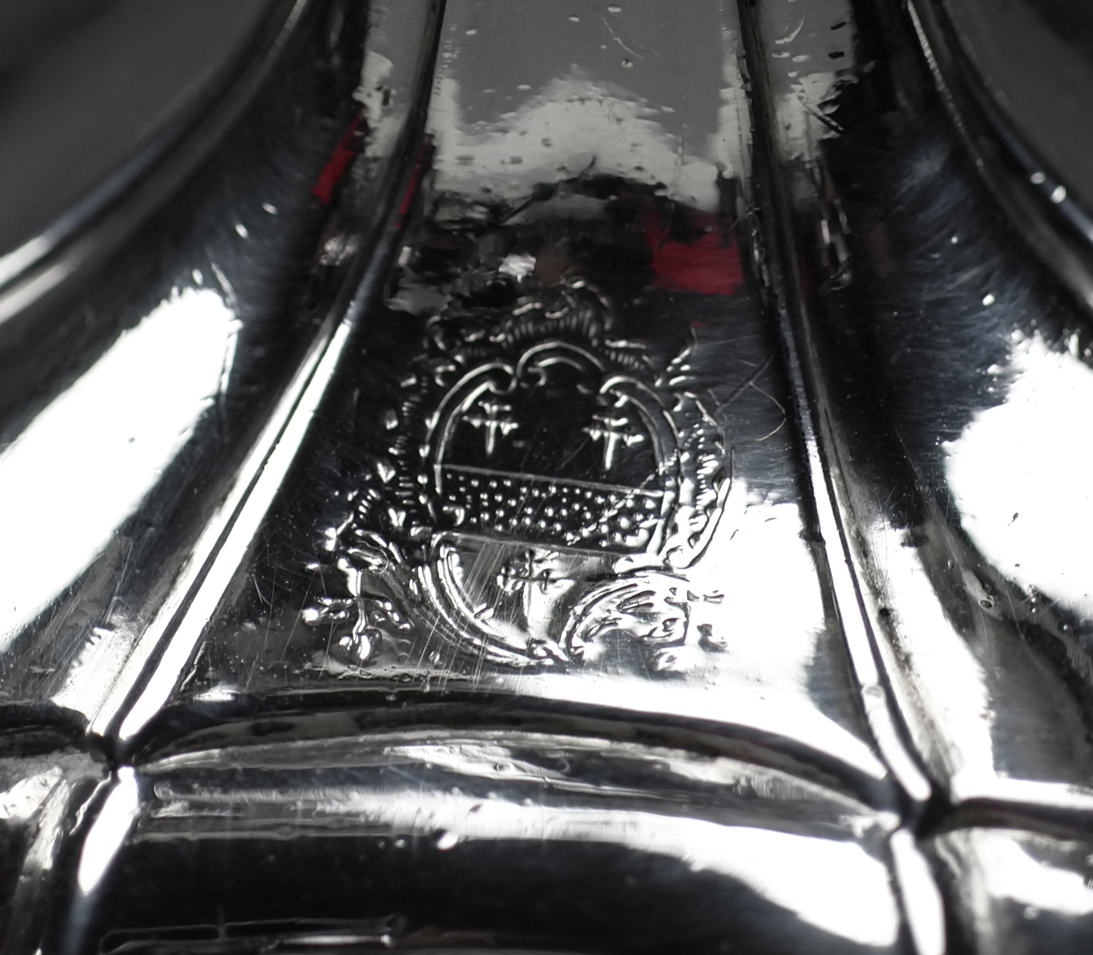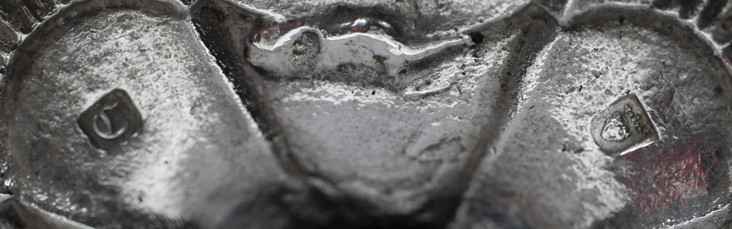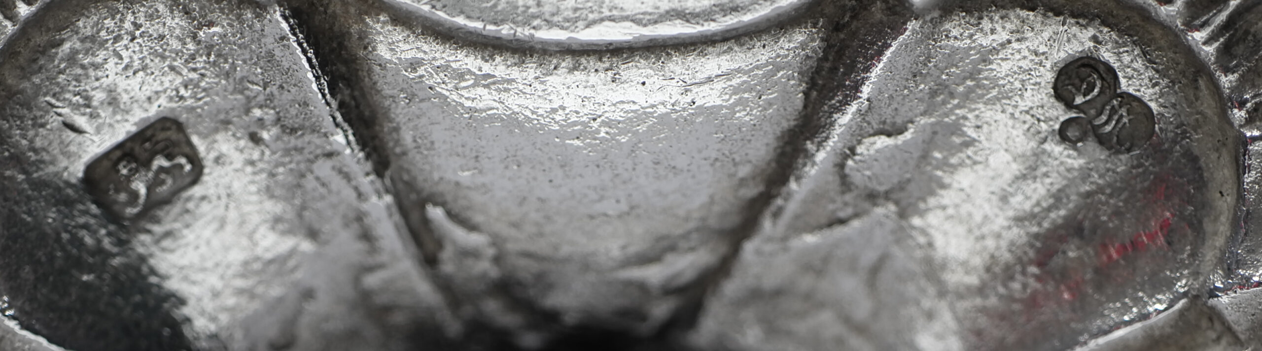 Gepunzt sind die Leuchter mit dem linksschreitenden Löwen für Sterlingsilber, mit dem gekrönten Leopardenkopf für London, mit WC unter Stern für den Meister William Cafe sowie mit dem Jahresbuchstaben C für das Jahr 1758.