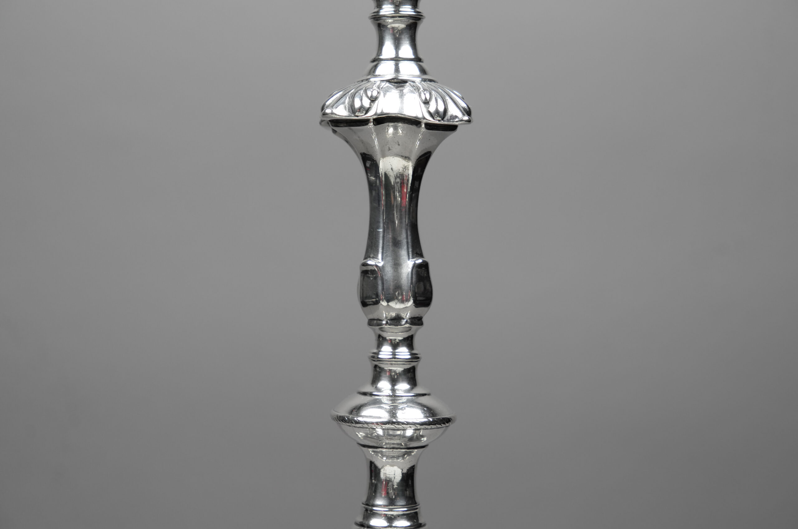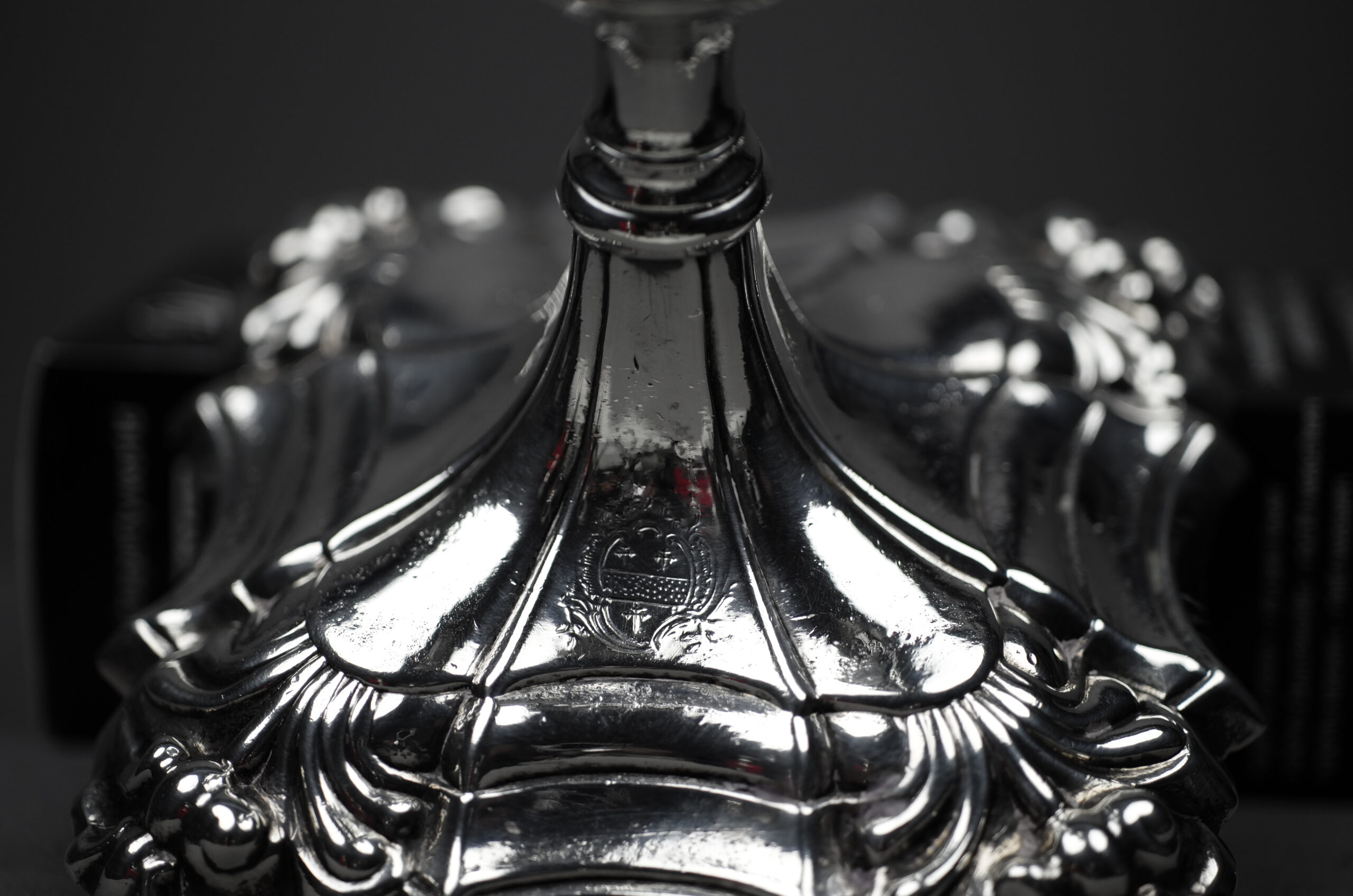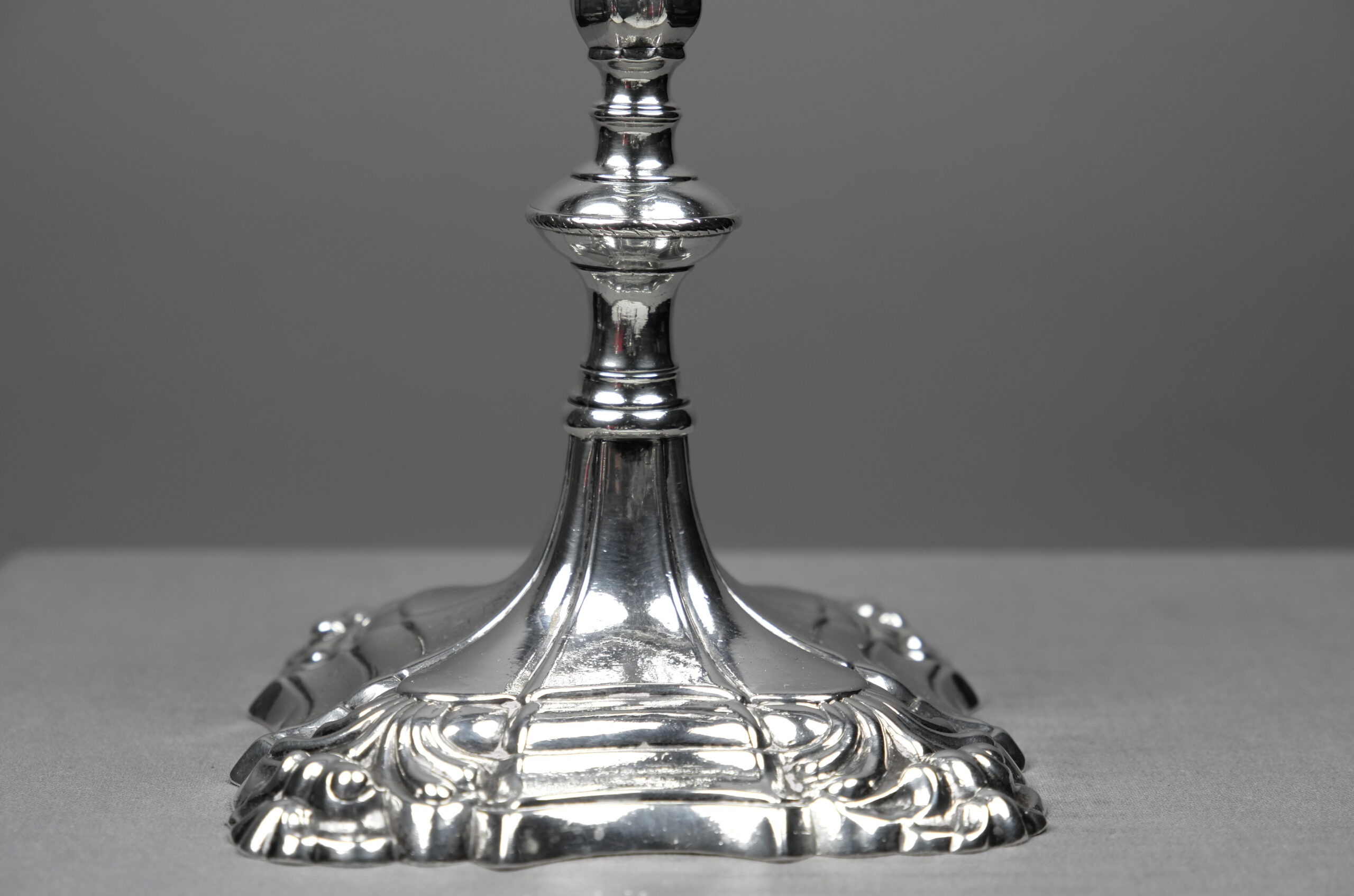 Der balusterförmige Schaft steht auf einem quadratischen, getreppten und mit Muschwelwerk verzierten Standfuß. Die Tülle ist abnehmbar, am Stand befindet sich jeweils eine Wappengravur. Die Leuchter sind sehr massiv gefertigt und ungefüllt.