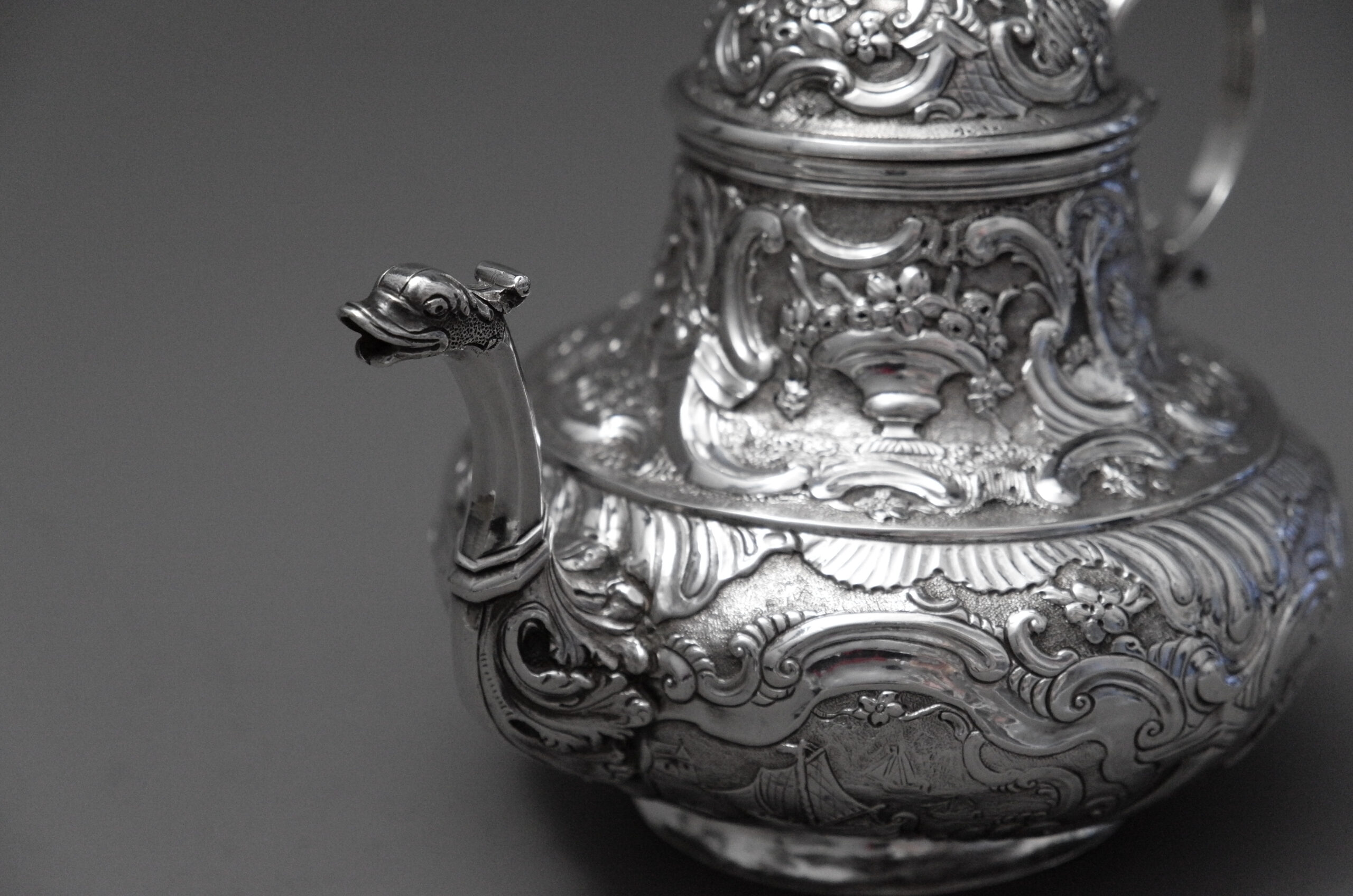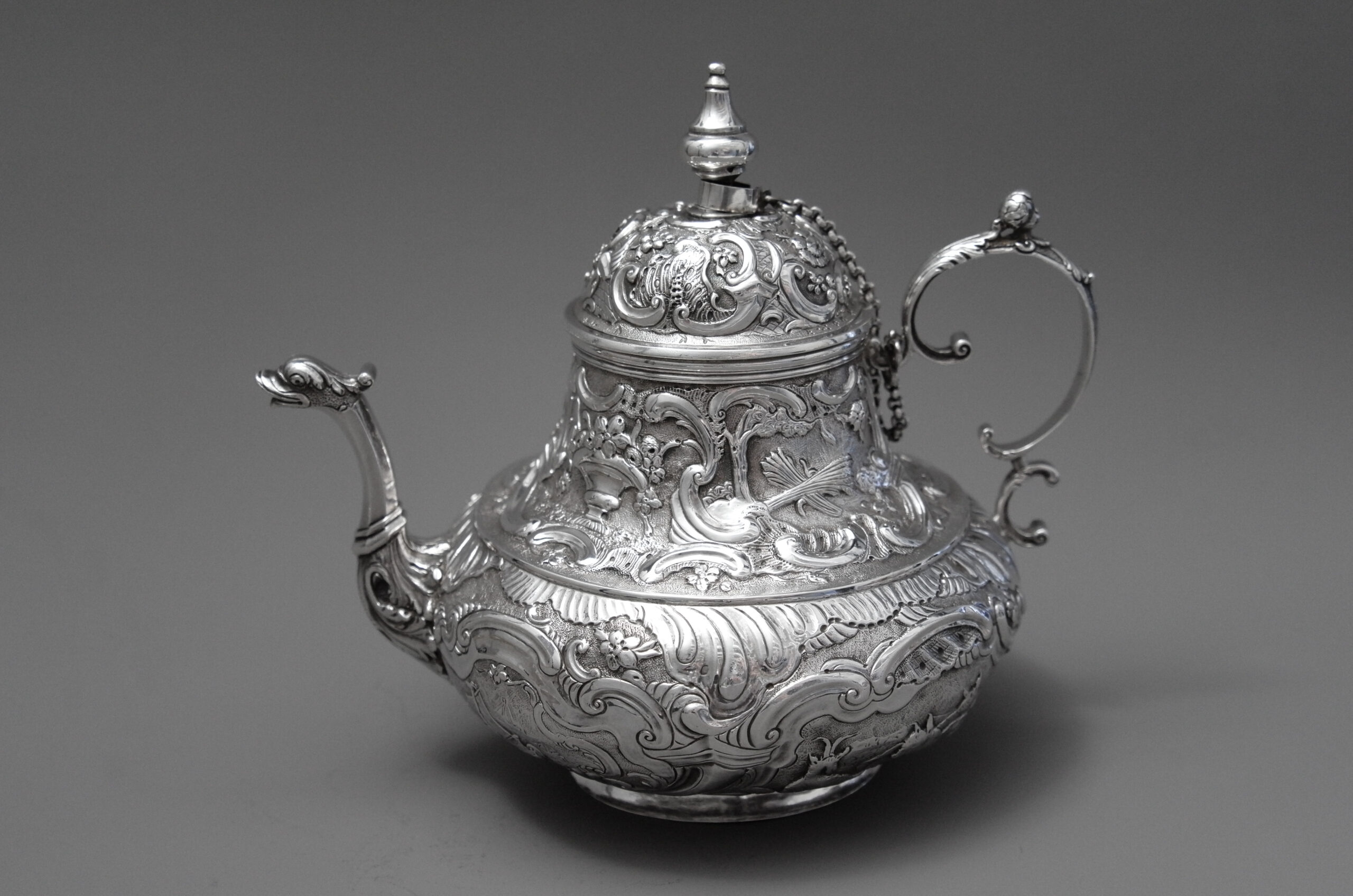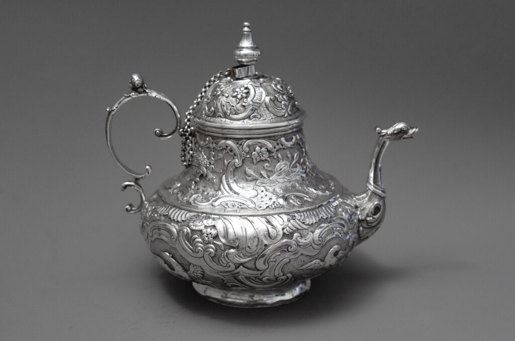 Dieses typisch friesische Teekännchen ist dekoriert mit Tier- und Fruchtdarstellungen sowie Rocaillen, der Ausguss ist in Form eines Fabeltierkopfes und die Silberhandhabe in C-Schwüngen mit plastischem Kopf- und Blattbesatz gestaltet. Ein Kettchen verbindet den abnehmbaren Deckel mit dem Korpus.