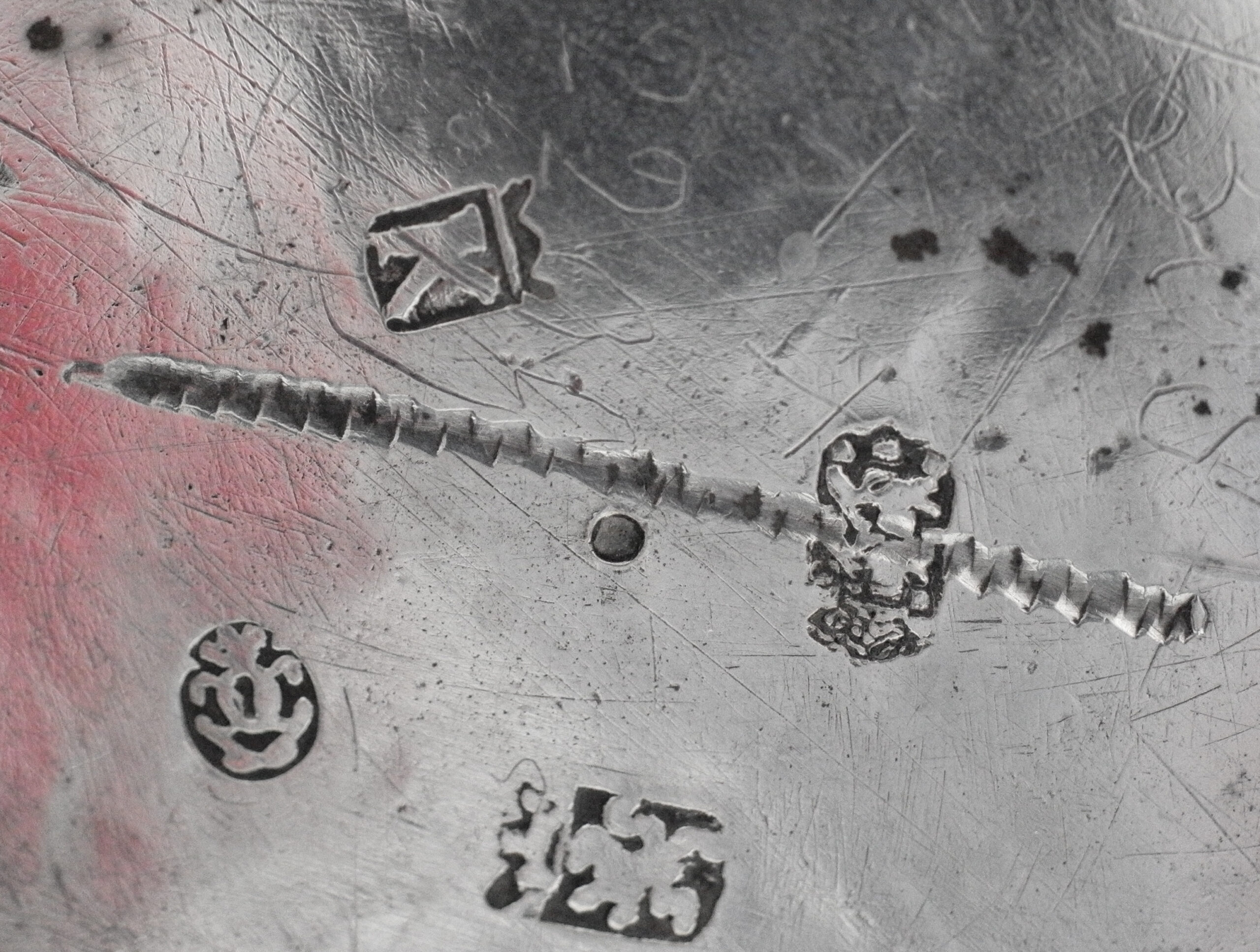 Als Punzen sind zu finden die Beschaumarke für Leeuwarden/Friesland, der gekrönte Löwe für den Silberfeingehalt 875, der Jahresbuchstabe K für das Jahr 1762 sowie die Meistermarke von Gosse Oenes Gorter, der von 1762 bis 1765 in Leeuwarden tätig war.