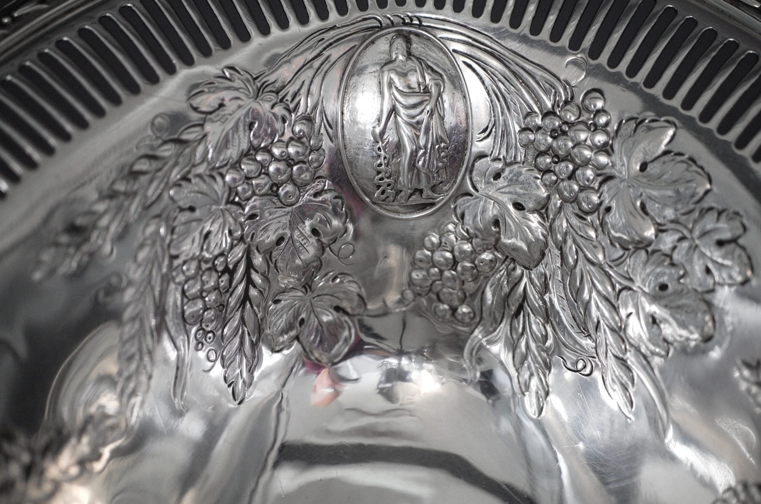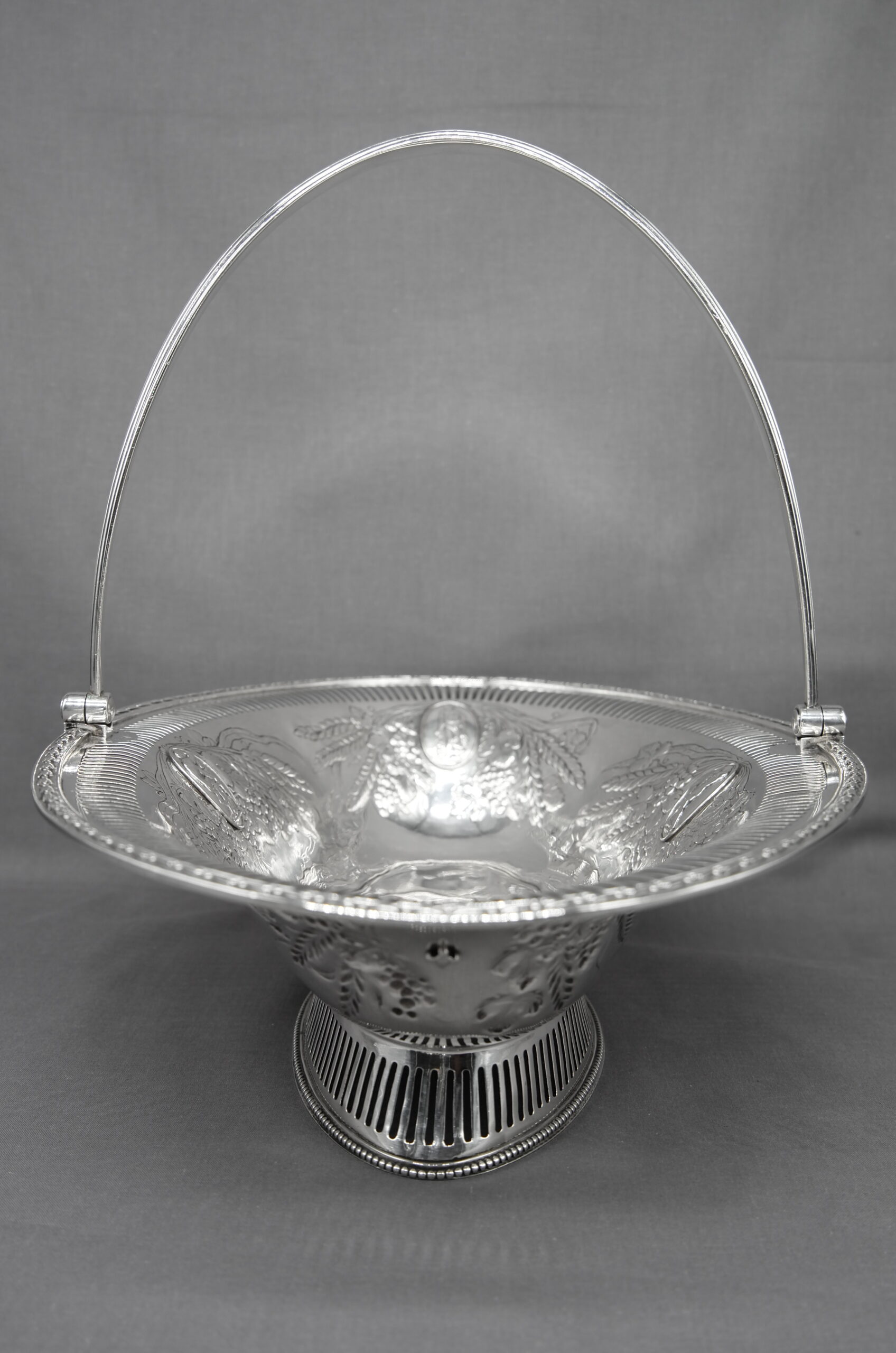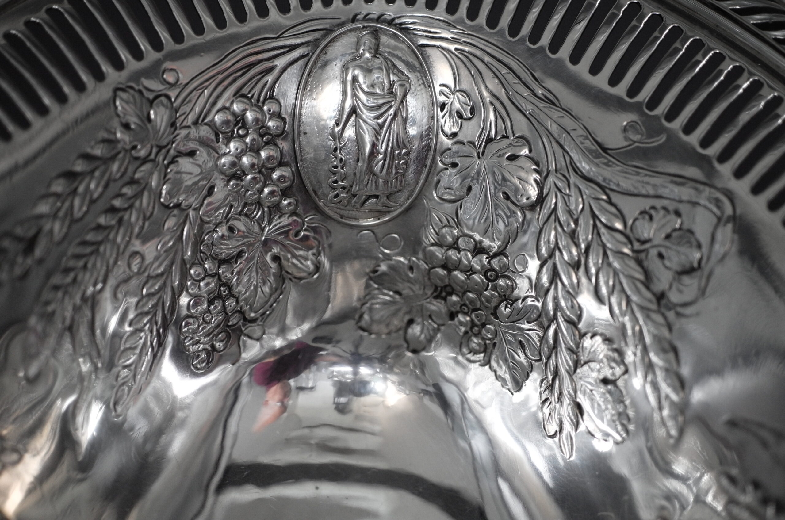 Diese Fruchtschale mit Henkel, die auch aufgrund der Dekoration als Brotkorb genutzt werden kann, ist oval geformt und steht auf einem ovalen Standfuß. Die Wandung ist mit geprägten Wein- und Getreidemotiven sowie vier Kartuschen mit figürlichen Darstellungen verziert. Ein Blatt- sowie ausgesägtes Lochmuster dekorieren den Rand.