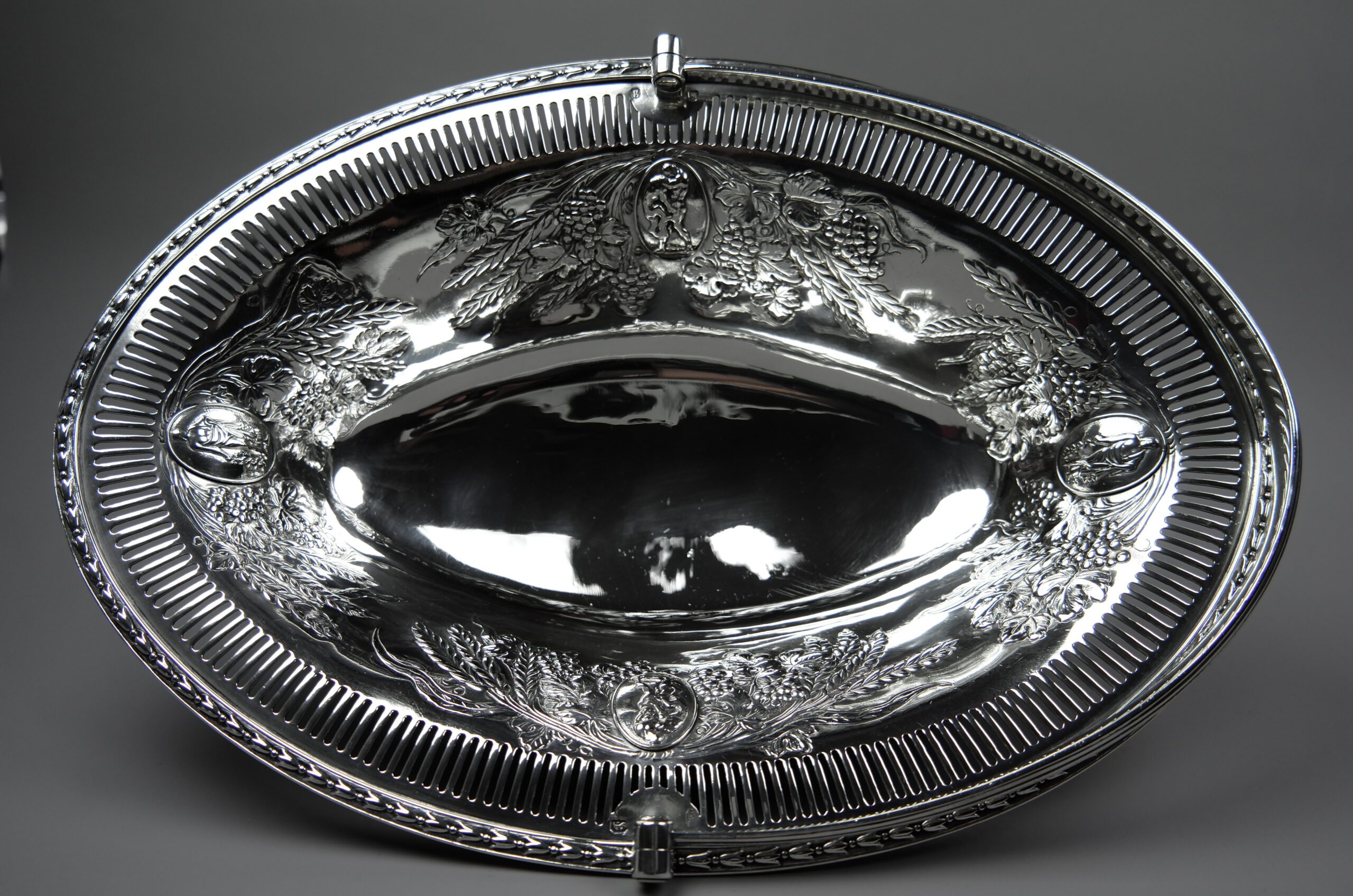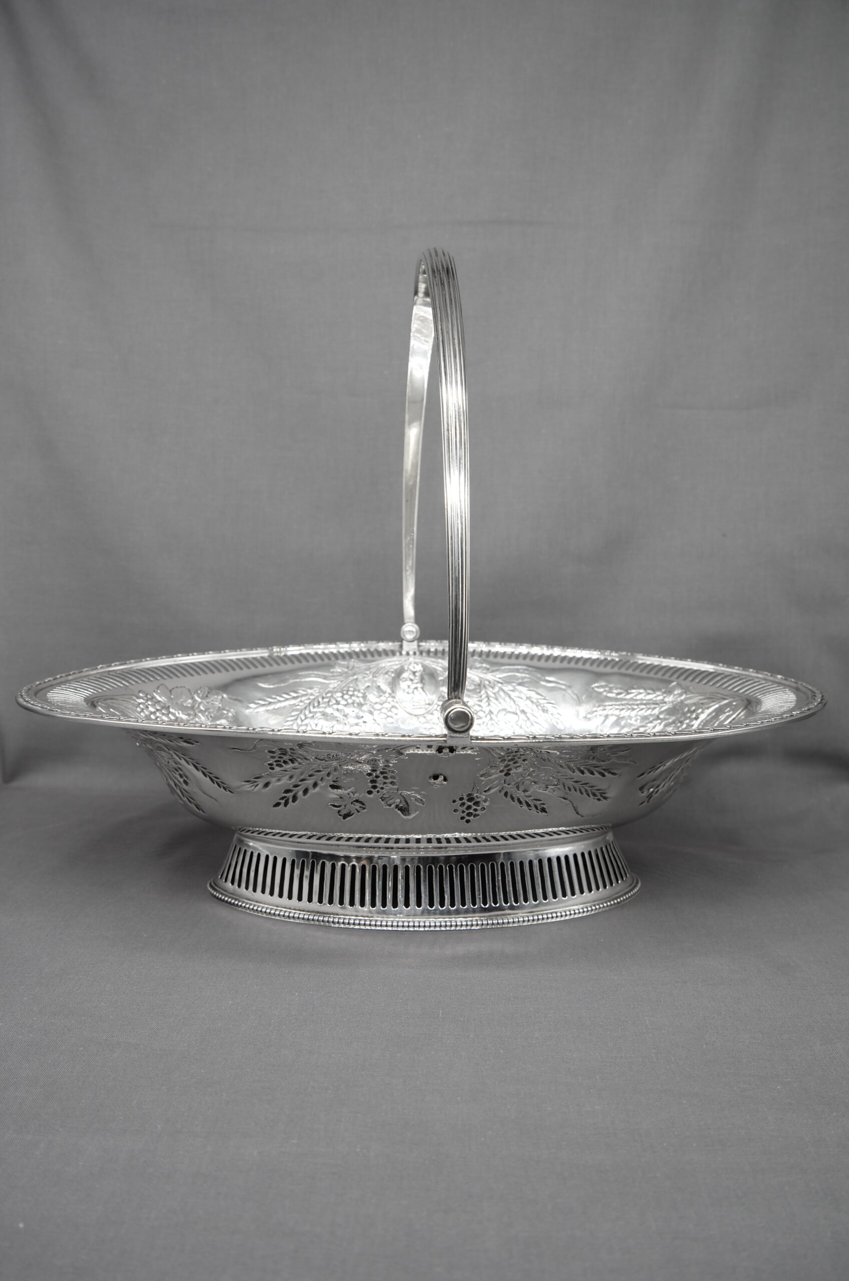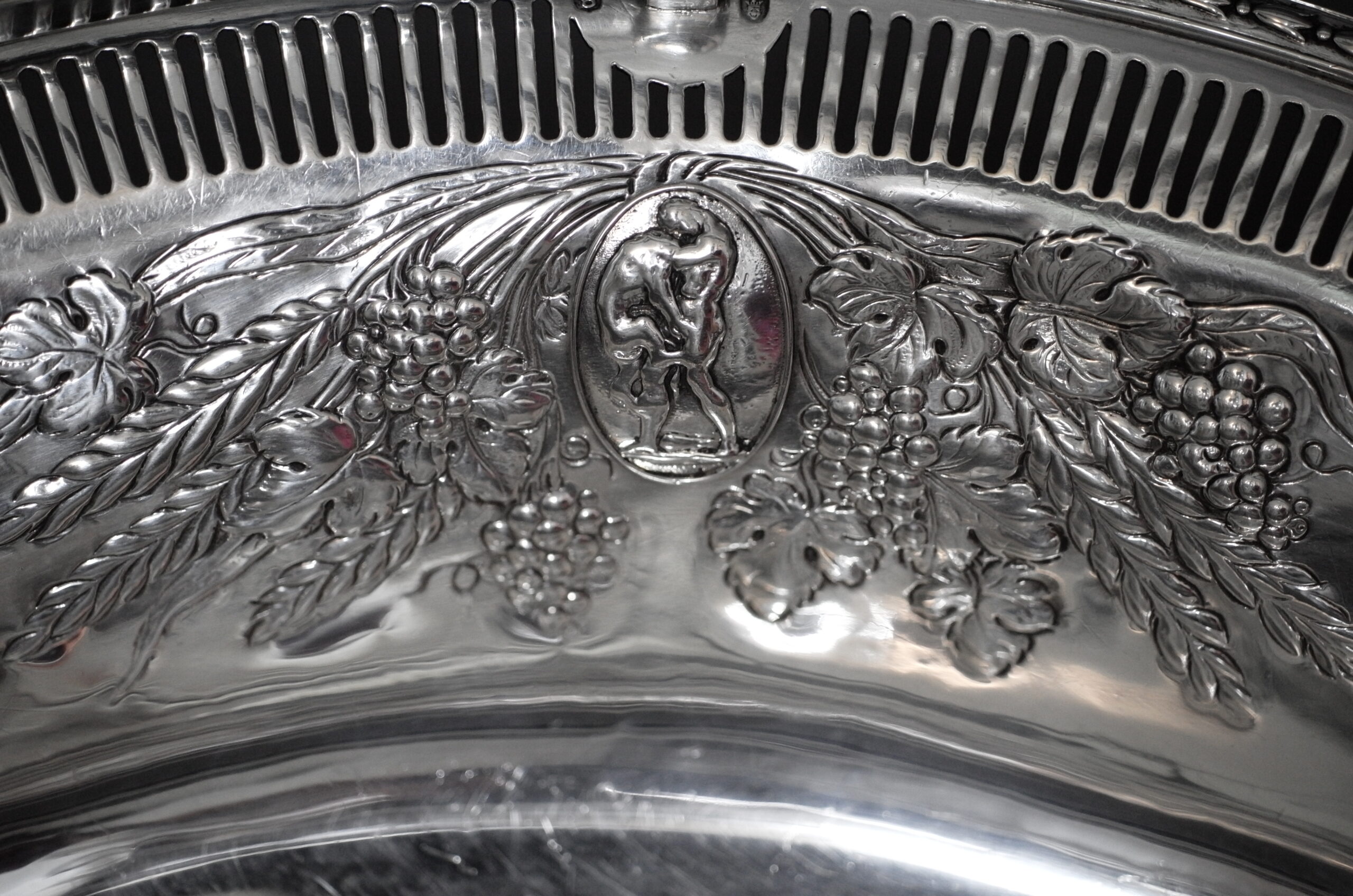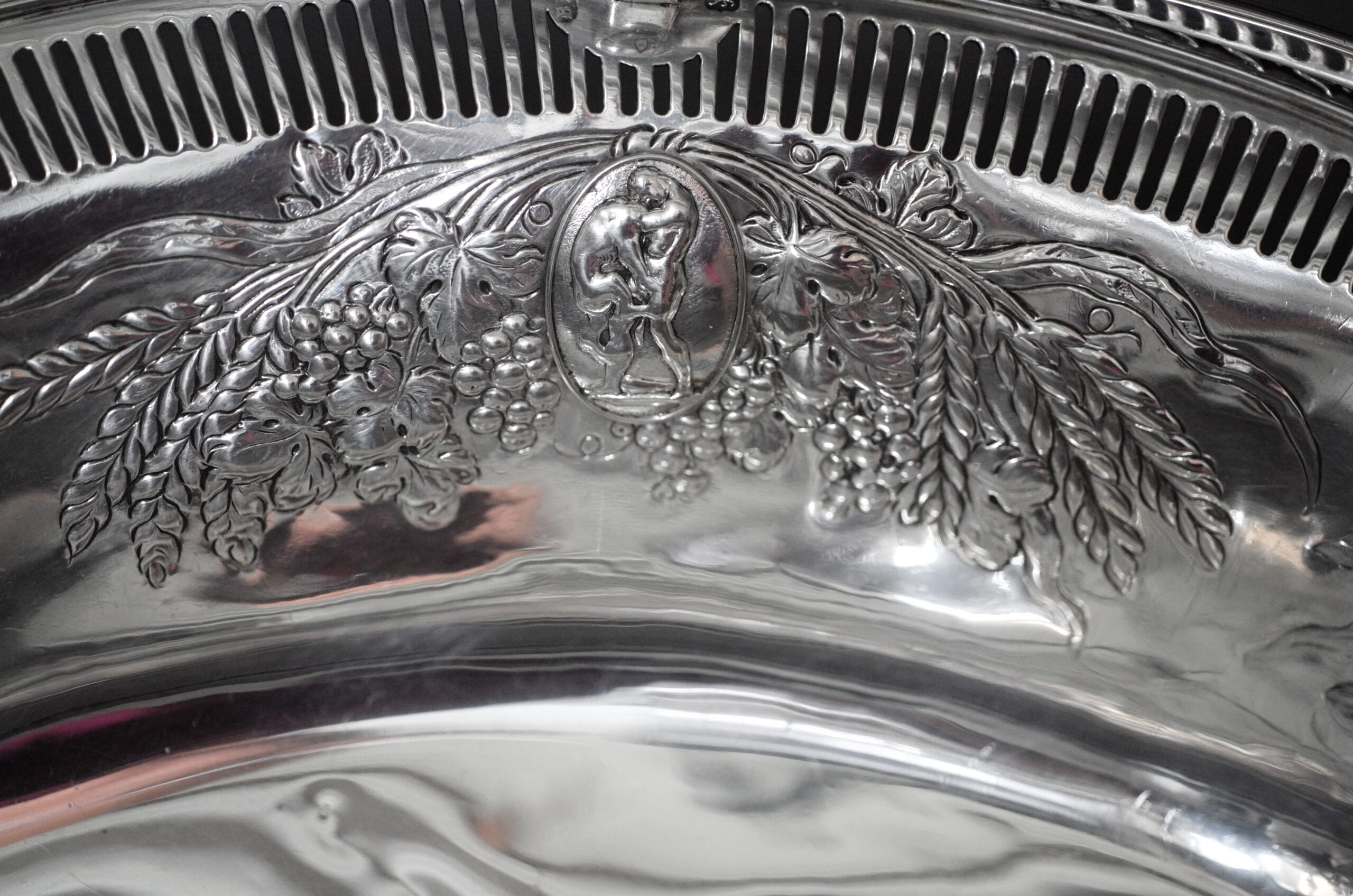 Diese Fruchtschale mit Henkel, die auch aufgrund der Dekoration als Brotkorb genutzt werden kann, ist oval geformt und steht auf einem ovalen Standfuß. Die Wandung ist mit geprägten Wein- und Getreidemotiven sowie vier Kartuschen mit figürlichen Darstellungen verziert. Ein Blatt- sowie ausgesägtes Lochmuster dekorieren den Rand.