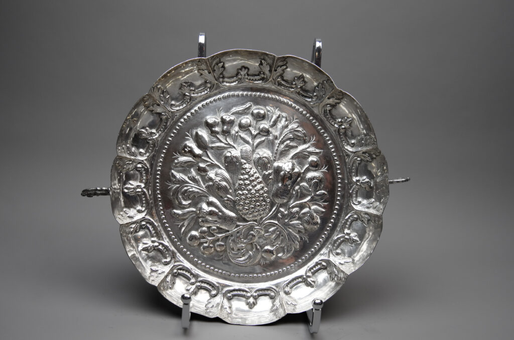 Eine runde, mehrpassige Fruchtschale mit Blattmotiven an der Fahne sowie mit Punkteband umrandete Frucht-, Blüten- und Blattmotiven im Spiegel und zwei seitliche Henkel als Handhaben.