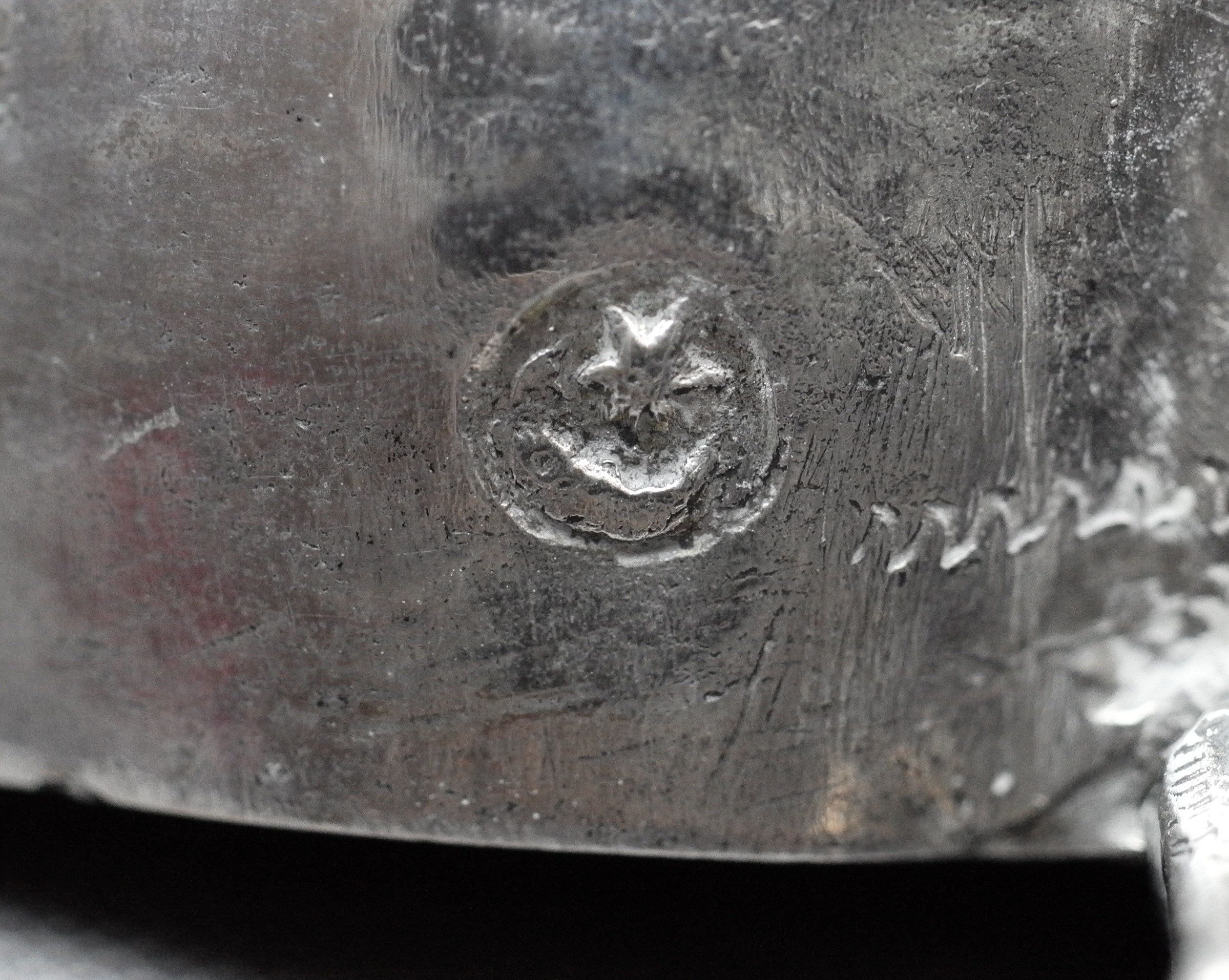 Punziert ist mit der Pyr als Beschaumarke für Augsburg sowie einem Stern und Halbmond als Meisterzeichen für Hans Petrus (Peters) III (Seling 1360), der von 1621 bis 1672 in Augsburg tätig war.