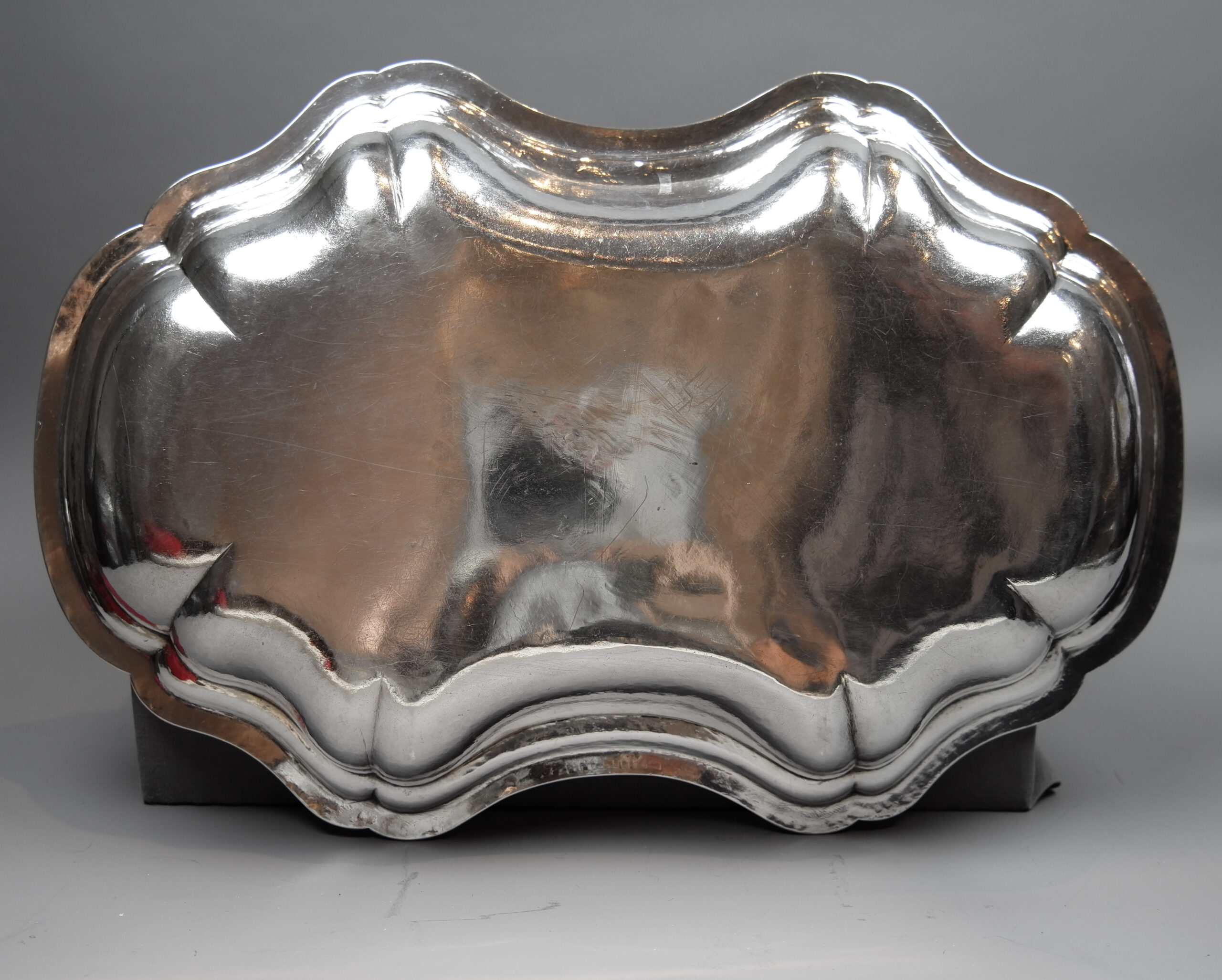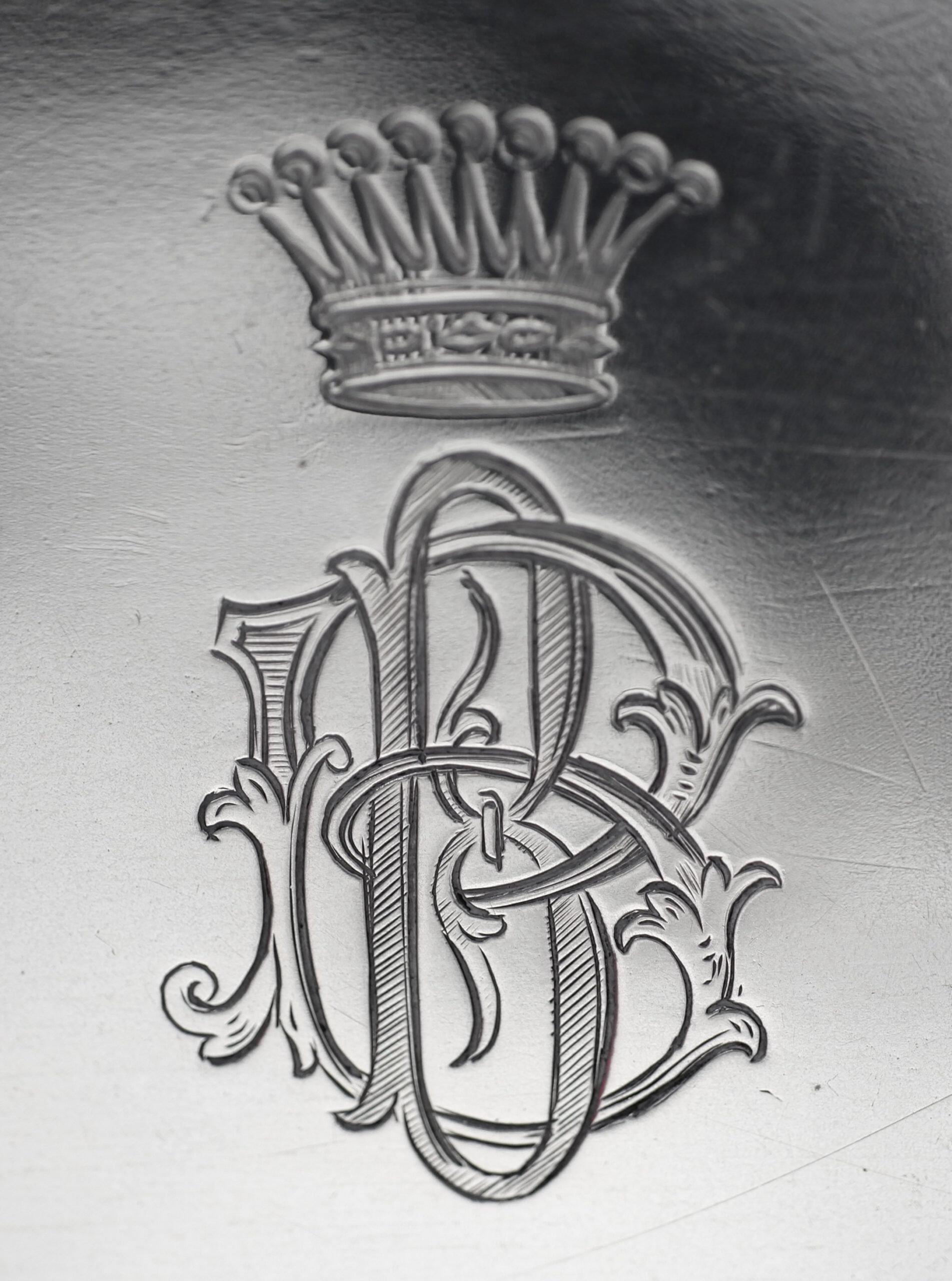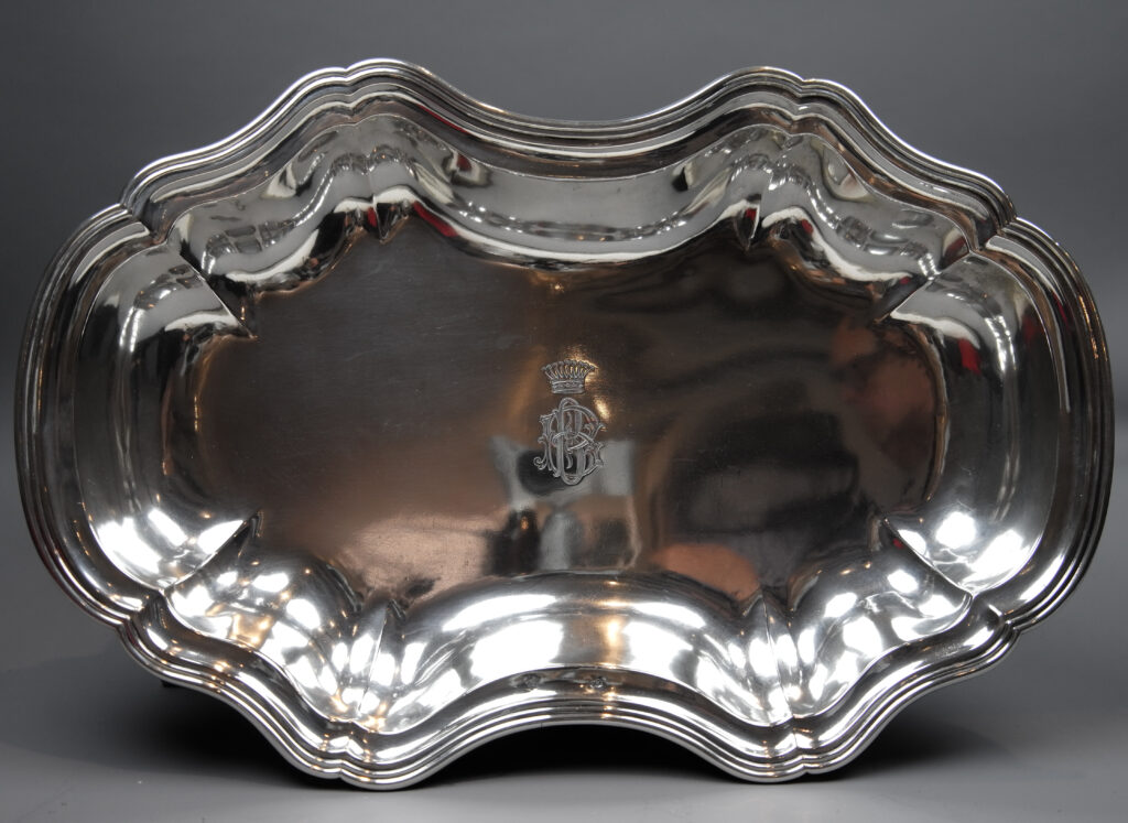 Ein prominentes Barock-Becken in achtpassiger, ovaler Form mit Linienrand, glattem Spiegel und Monogrammgravur mit Krone.