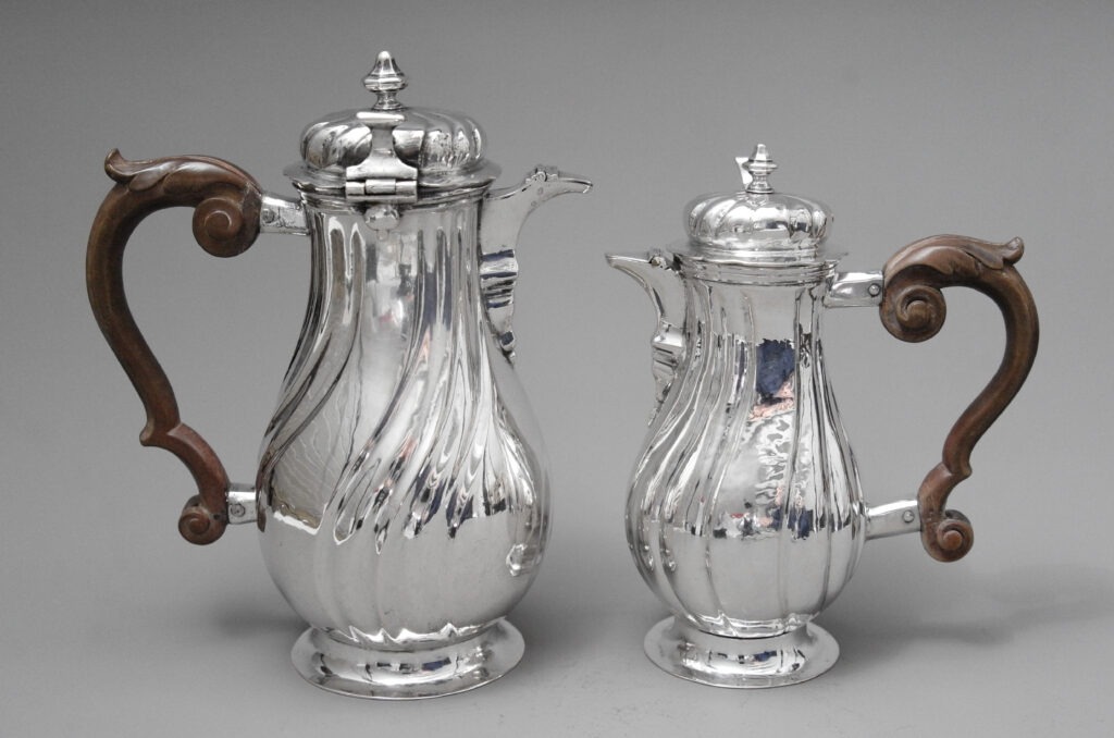 Ein zusammengehörendes Kannenpärchen für Kaffee und Mokka. Der birnenförmige Korpus steht auf einem runden Standfuß, gewundenes Liniendekor ziert den Korpus, die Haubenklappdeckel mit Silberknauf öffnen sich von der Seite und die Holzhandhaben sind ebonisiert.