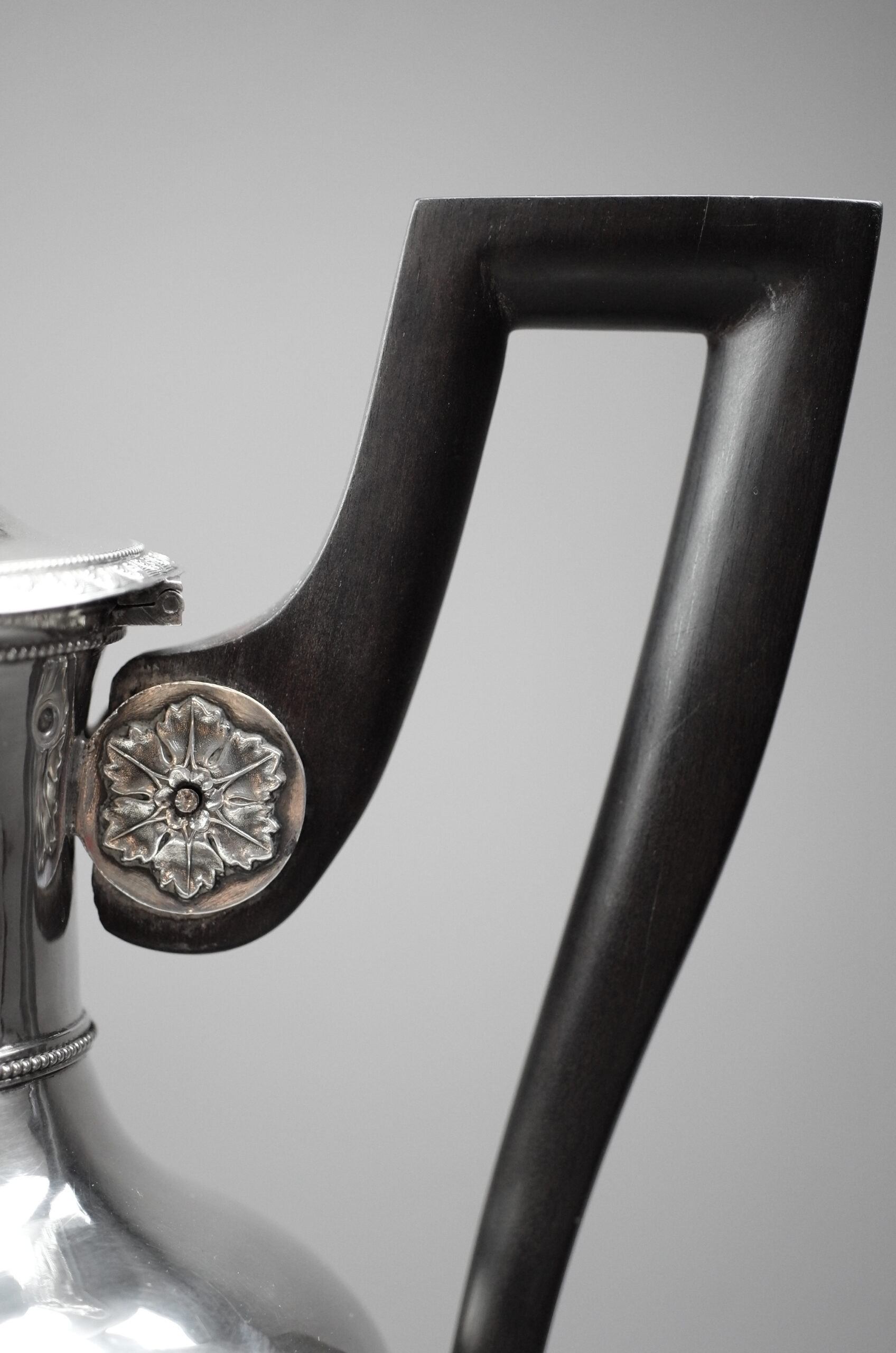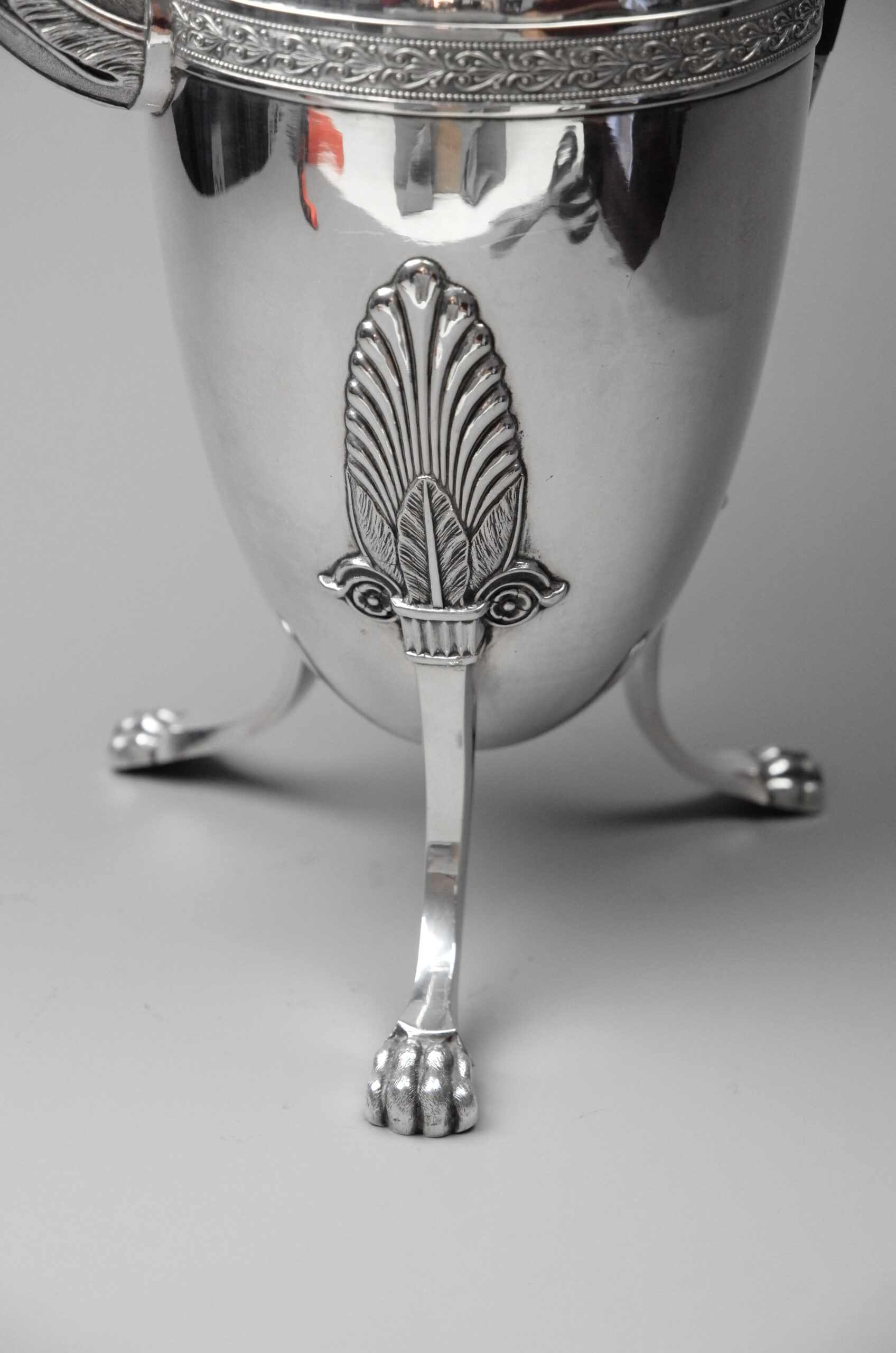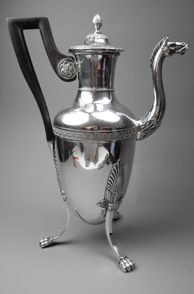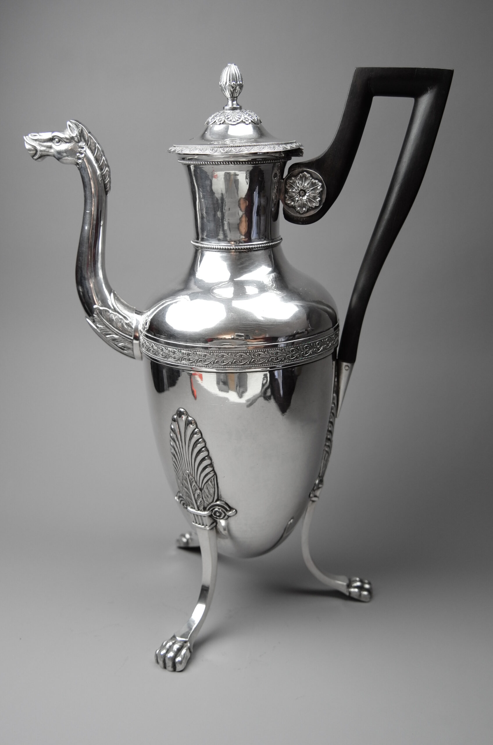Diese sehr große Pariser Tripode Kaffeekanne in Urnenform steht klassisch auf drei Tatzenfüßen mit Palmettenbefestigung. Sie ist ebenfalls klassisch mit Blattfriesband an Schulter und Deckel sowie einem Klappdeckel mit plastischer Blütenknospe und unterlegtem Blattwerk ausgestattet. Der Ausguss ist als Pferdekopf modelliert, die Holzhandhabe ist ebonisiert.