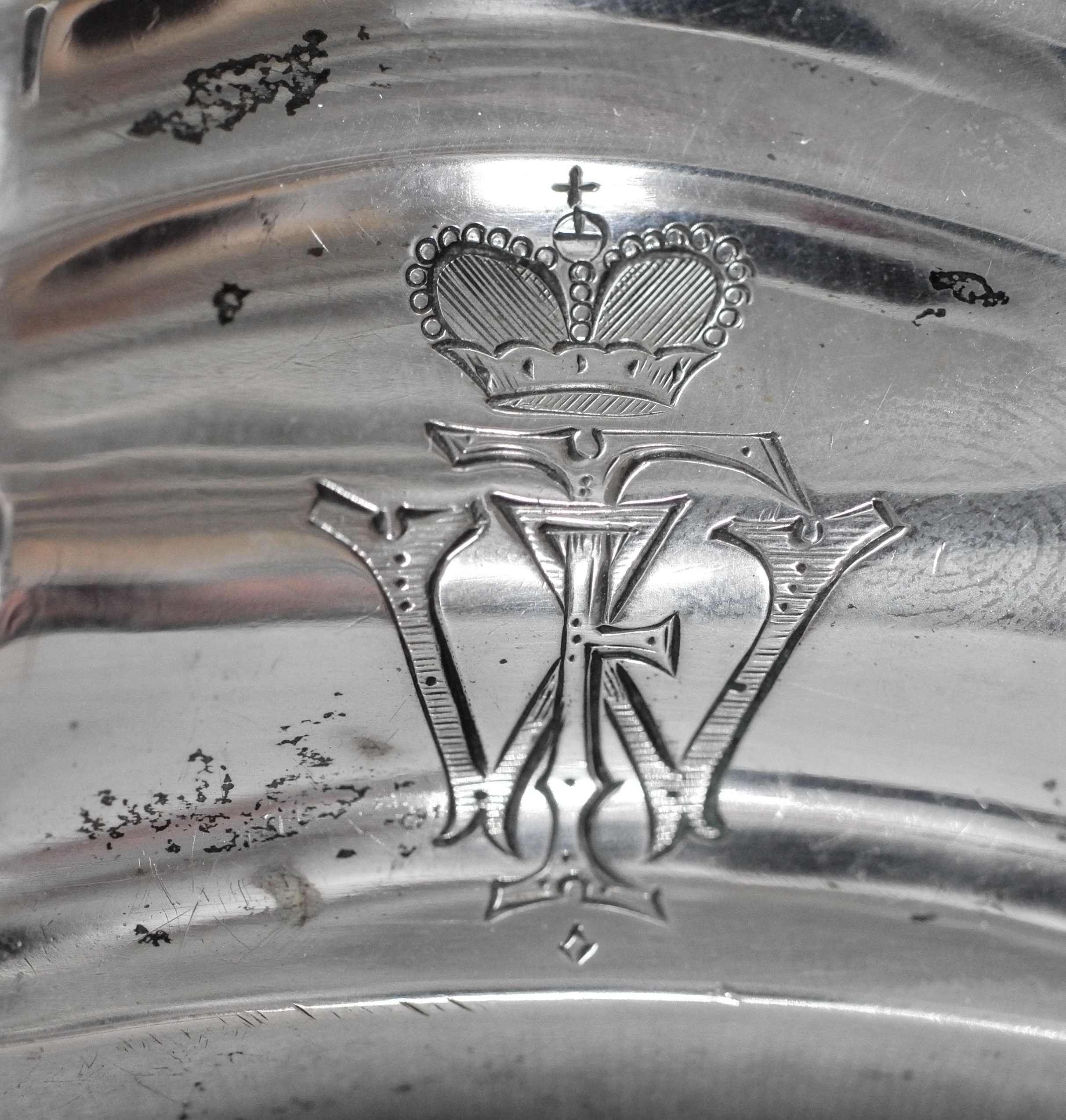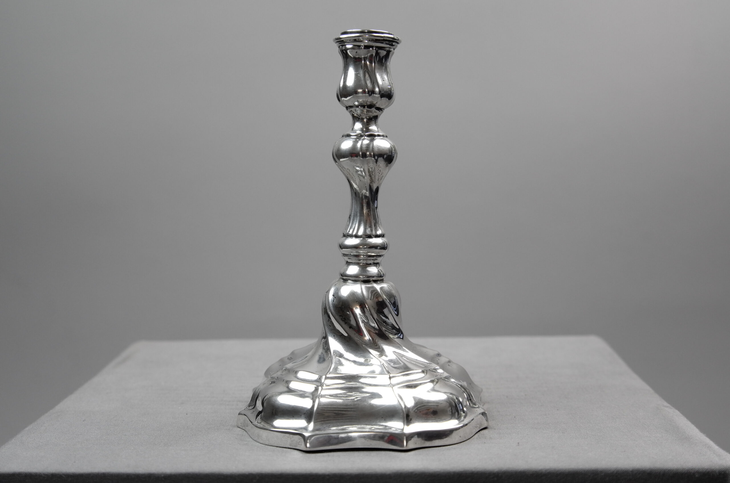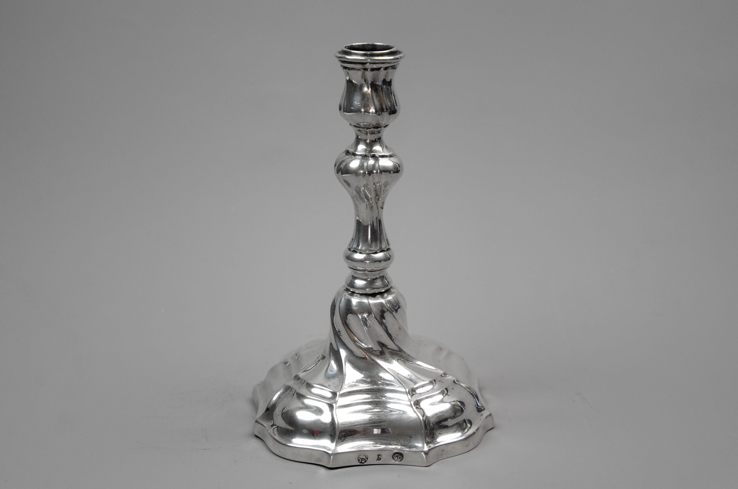 Ein Leuchter mit gewundenem Balusterschaft und Stand sowie tulpenförmiger Tülle ohne Traufschale. Auf dem Stand befindet sich ein graviertes Monogramm „WF“ unter Krone.