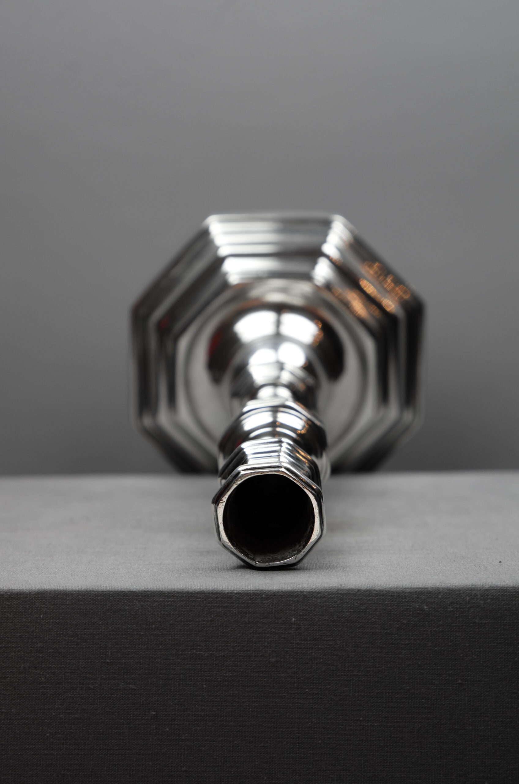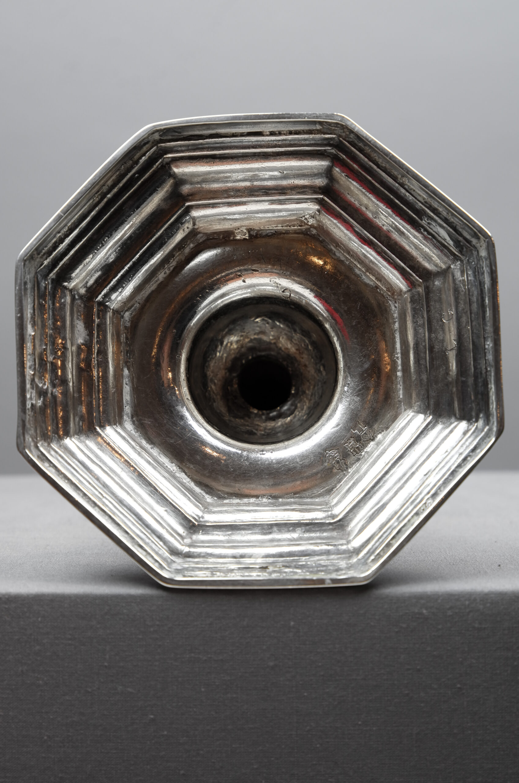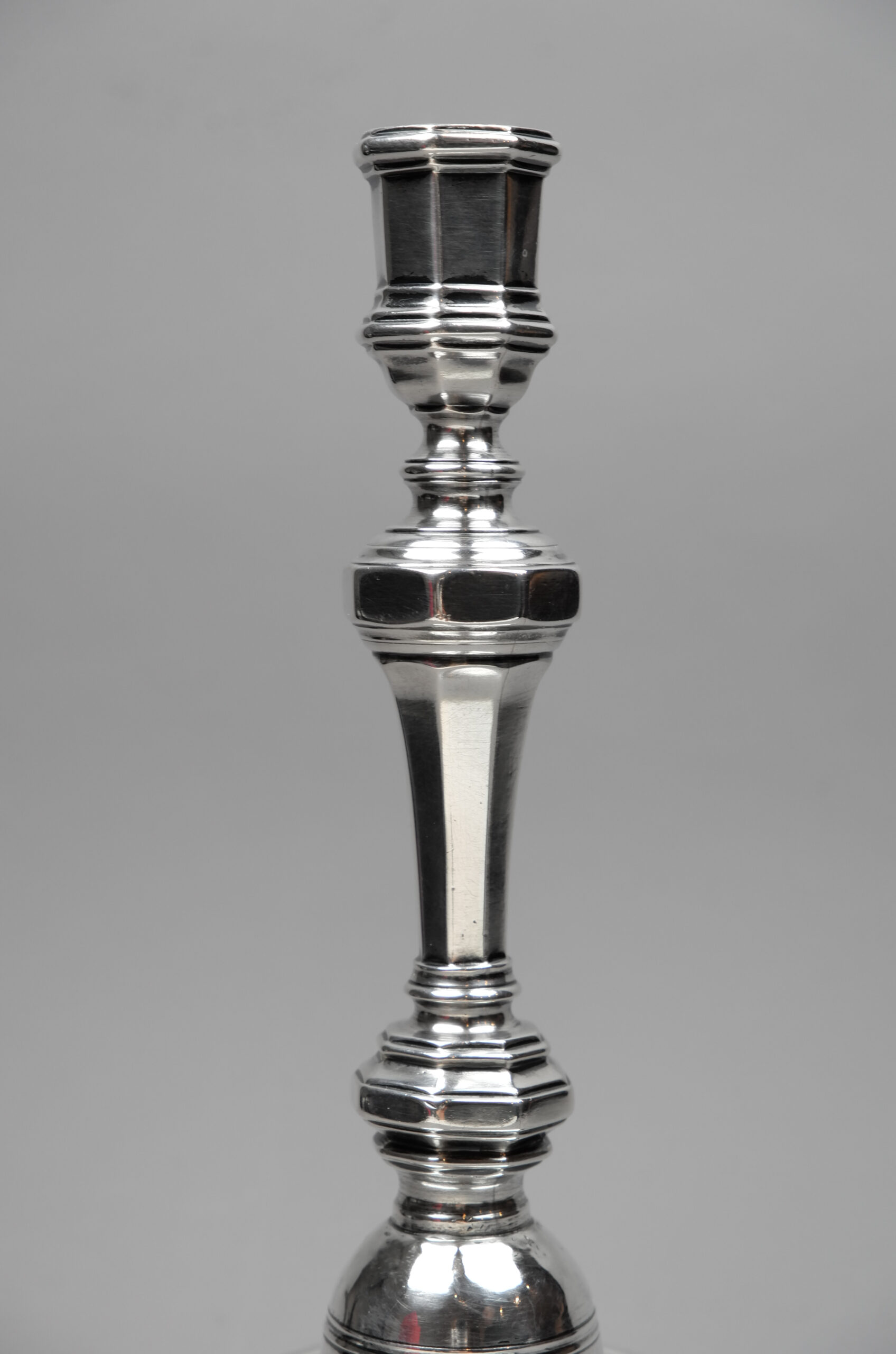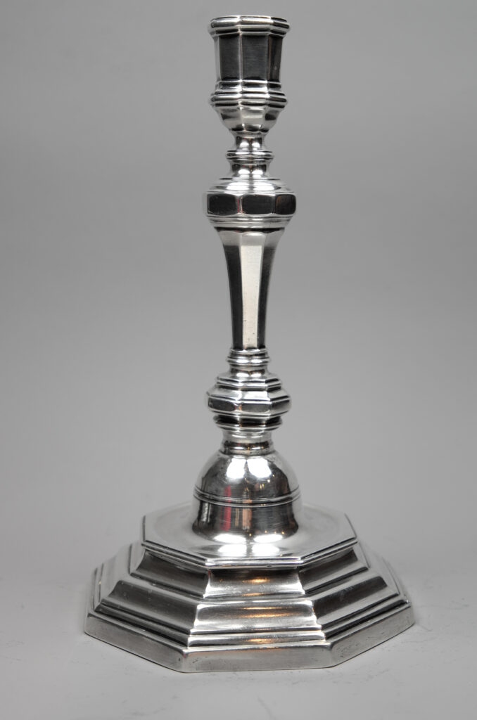 Ein Leuchter mit oktagonal geformtem und getrepptem Stand, mit balusterförmigem Schaftaufbau mit Nodus und ohne Traufschale.