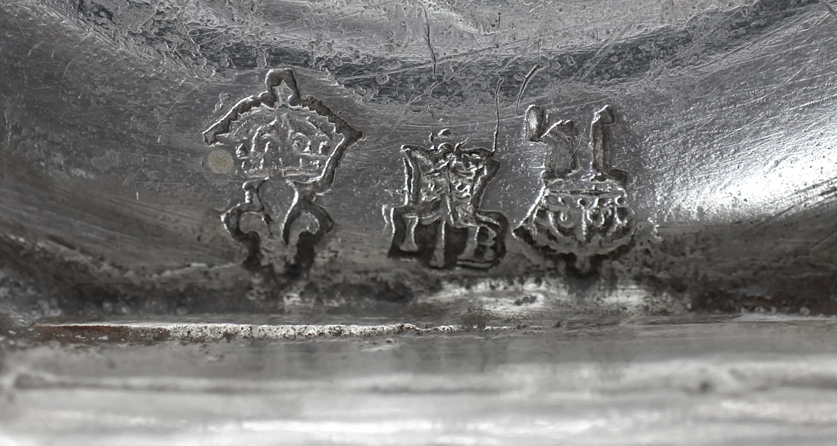 Gepunzt ist mit der Beschaumarke von Lille, mit der Meistermarke IB sowie mit dem Jahresbuchstaben L für die Mitte des 18. Jahrhundert.