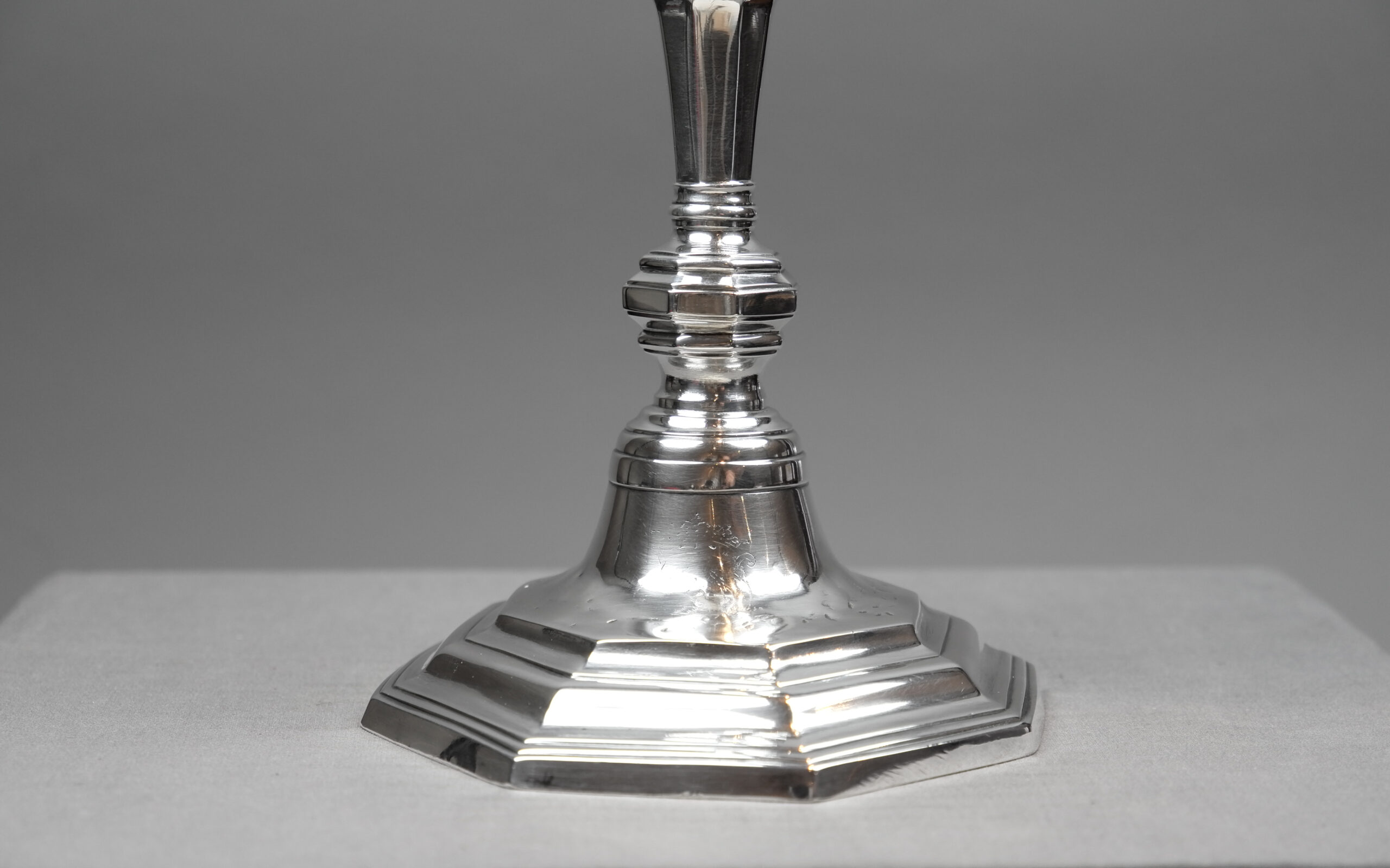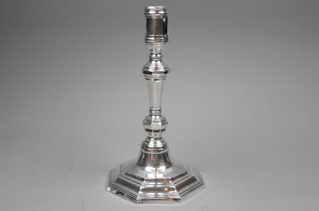 Ein Kerzenleuchter mit achtpassigem Standfuß und Balusterschaft.