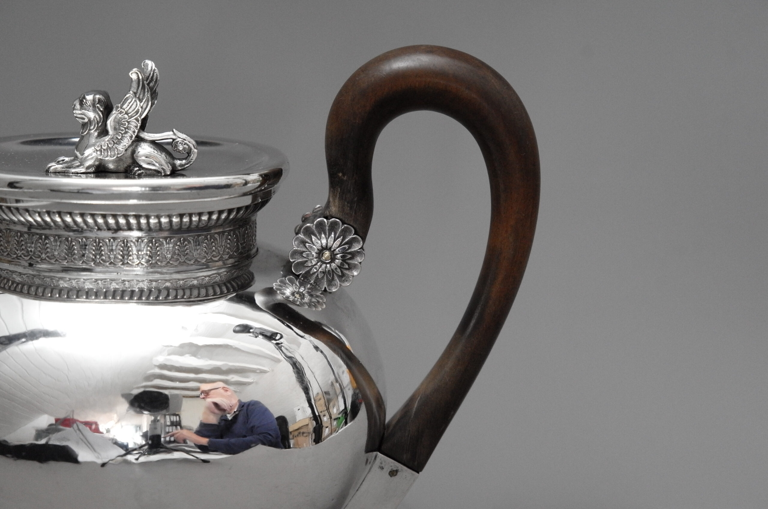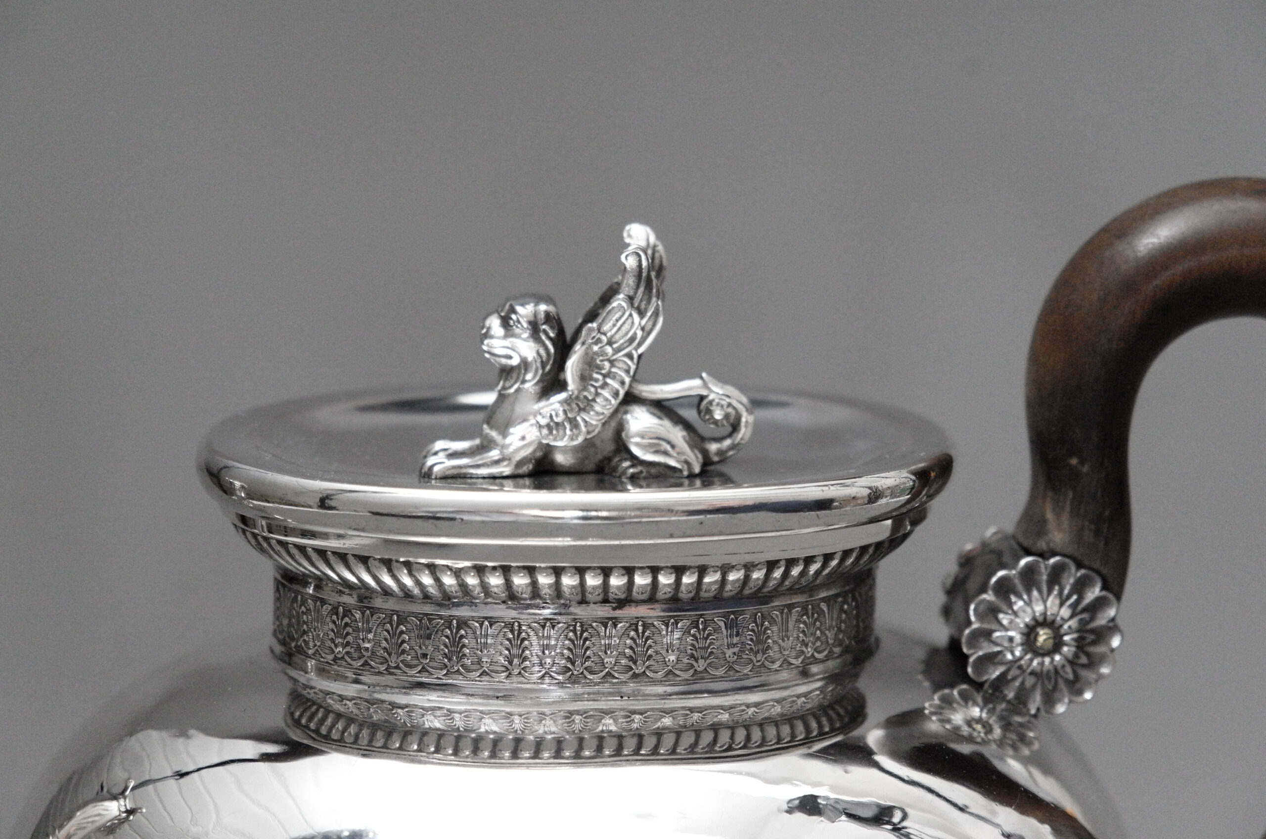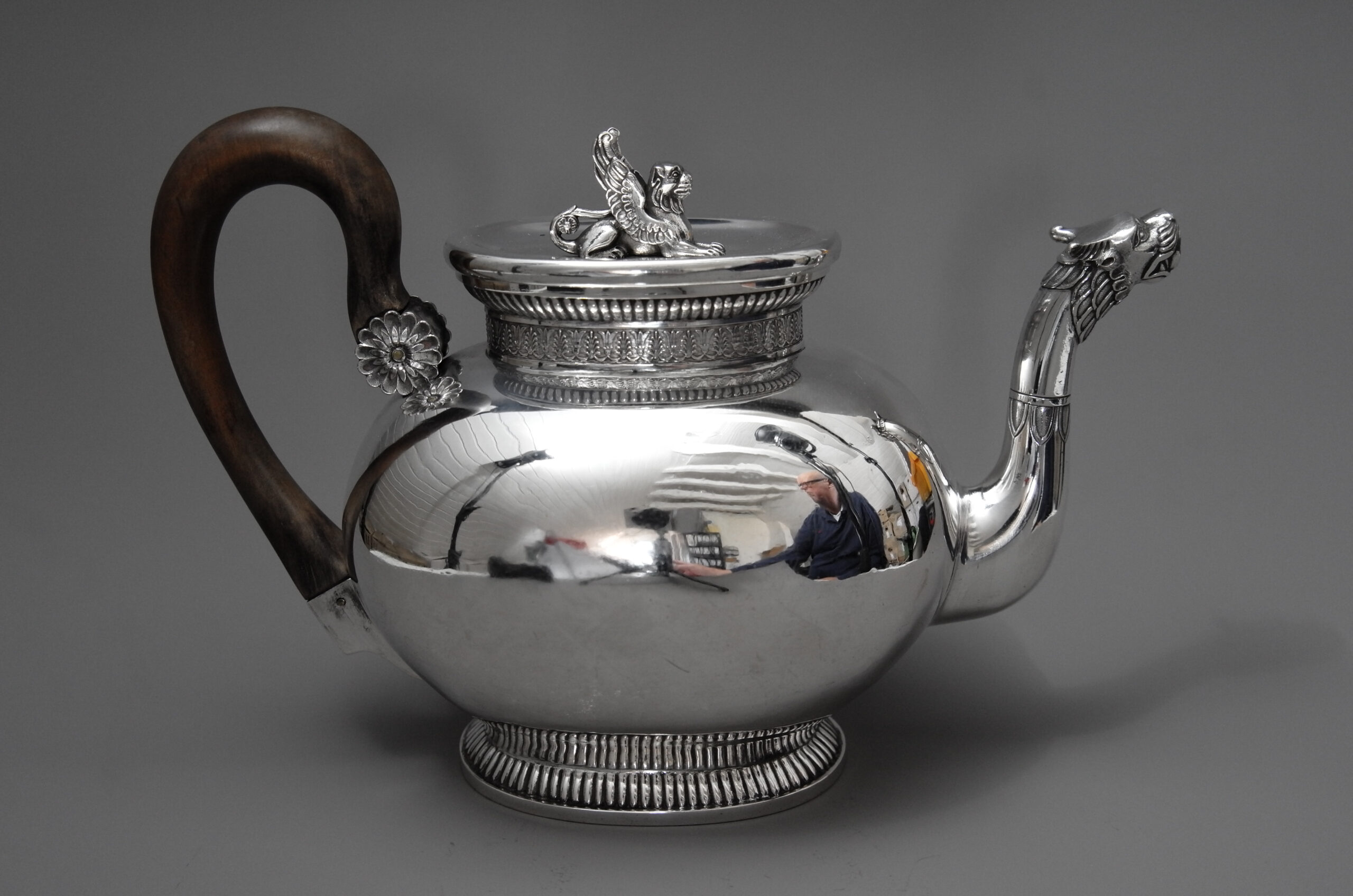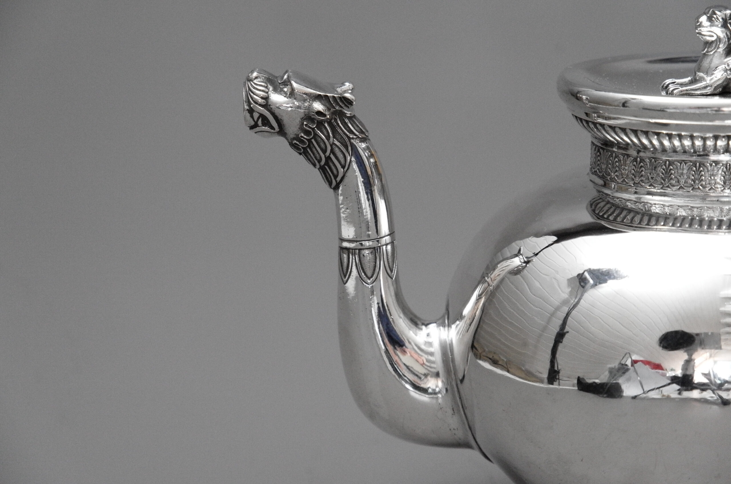 Eine oval geformte Teekanne mit glattem Korpus auf einem ovalen Standfuß und mit Blattmusterband am Kragen. Die ohrenförmige Holzhandhabe ist ebonisiert, der Ausguss ist als plastischer Fabeltierkopf gestaltet und ein liegender, geflügelter und plastischer Löwe dient als Knauf für den abnehmbaren Deckel.