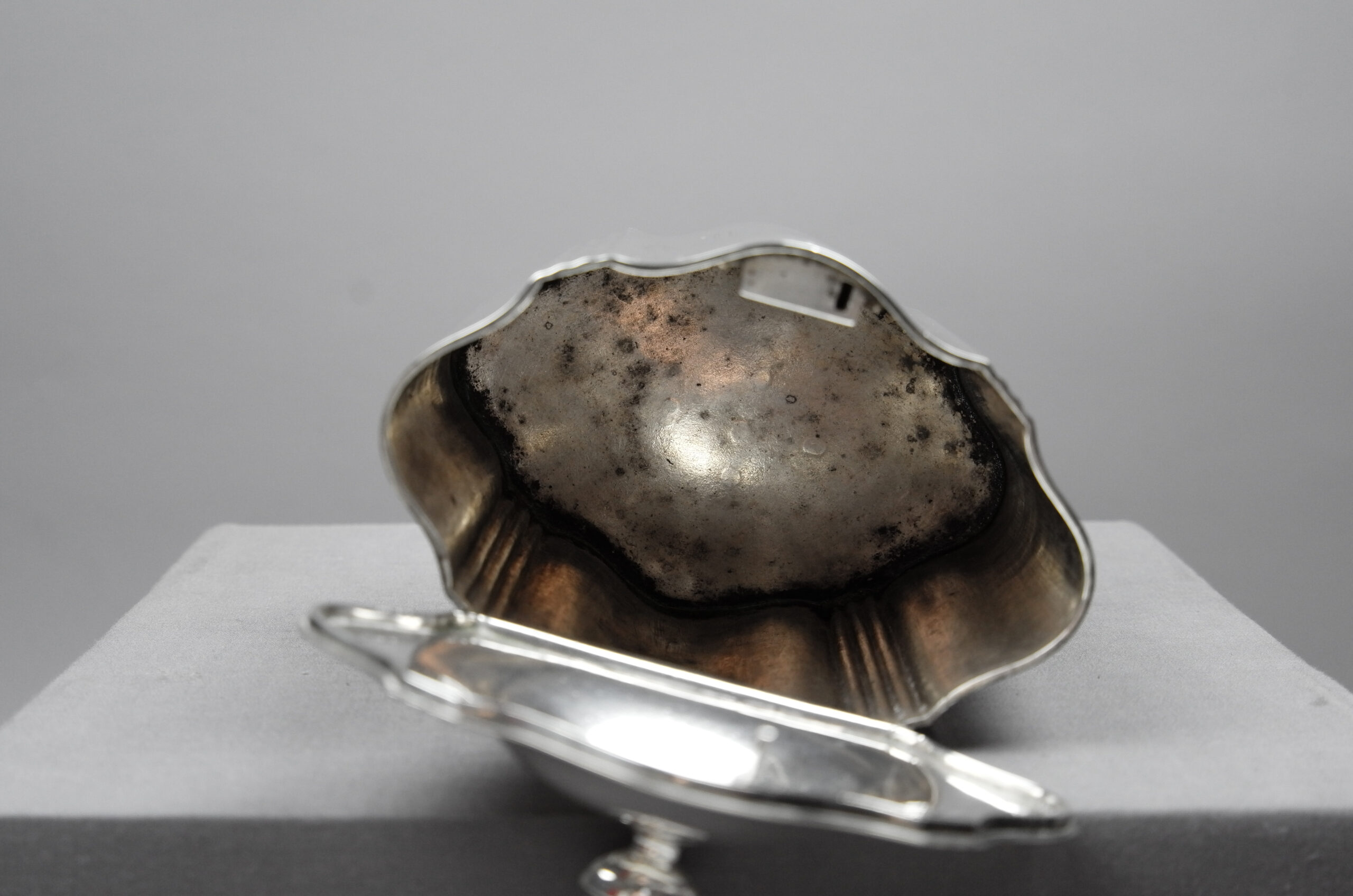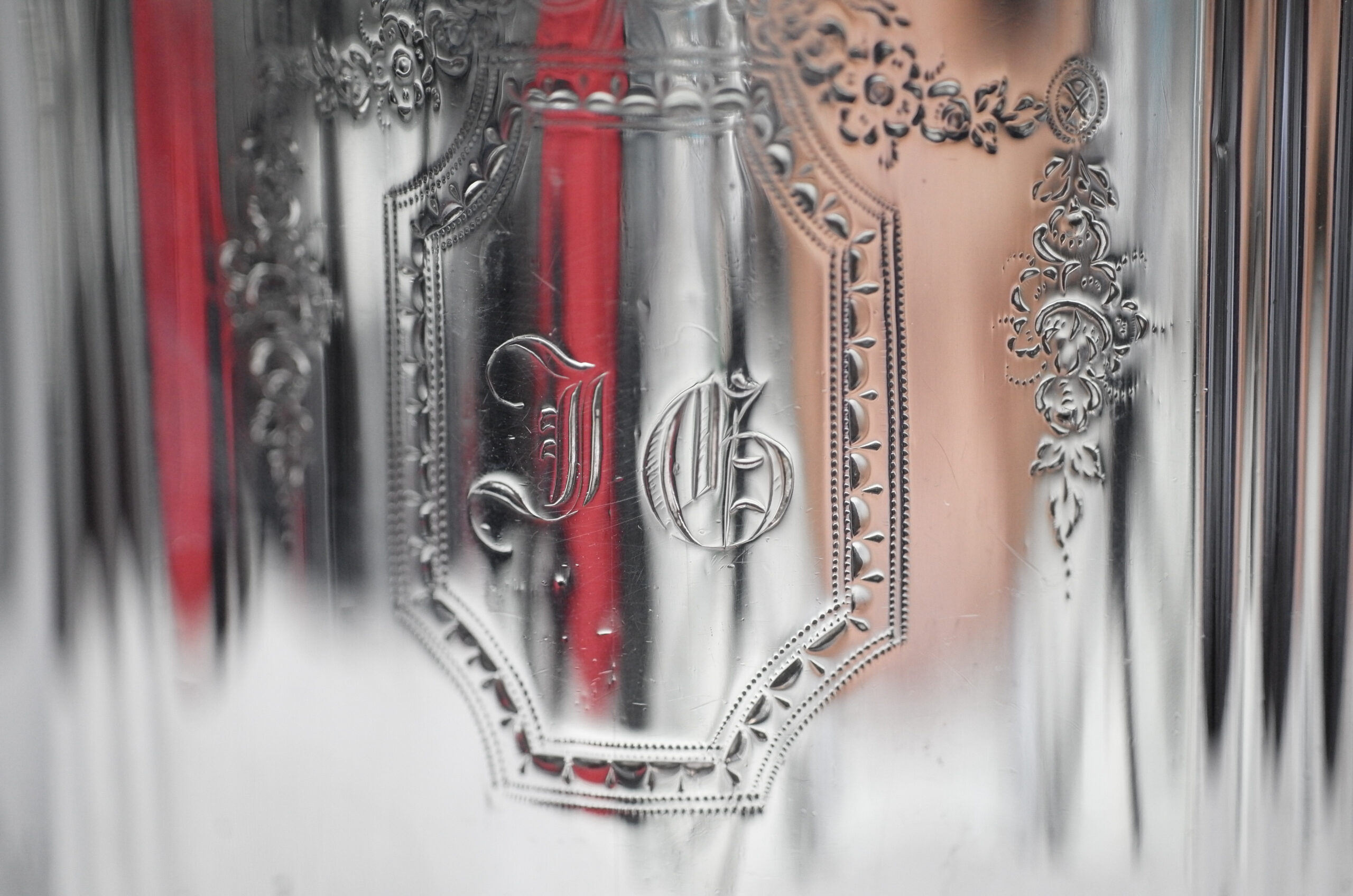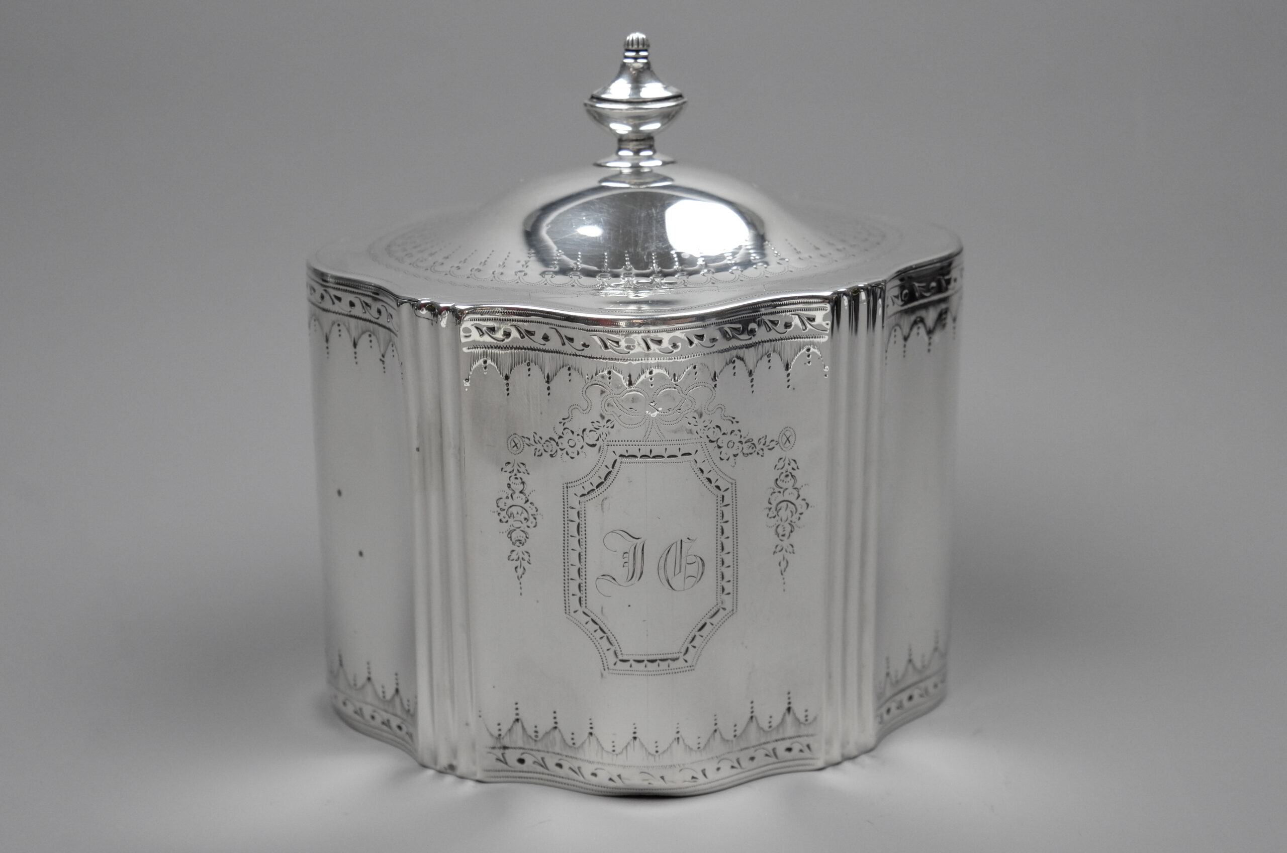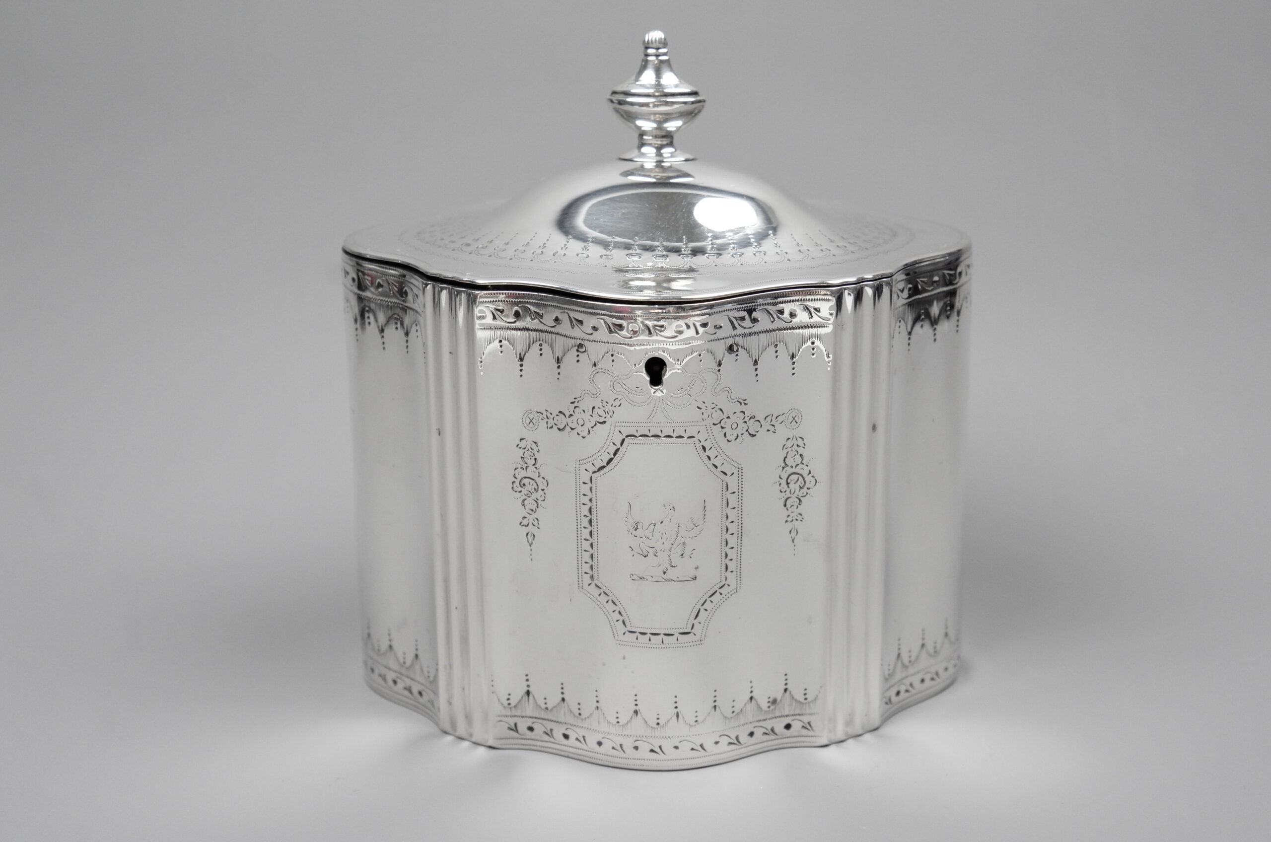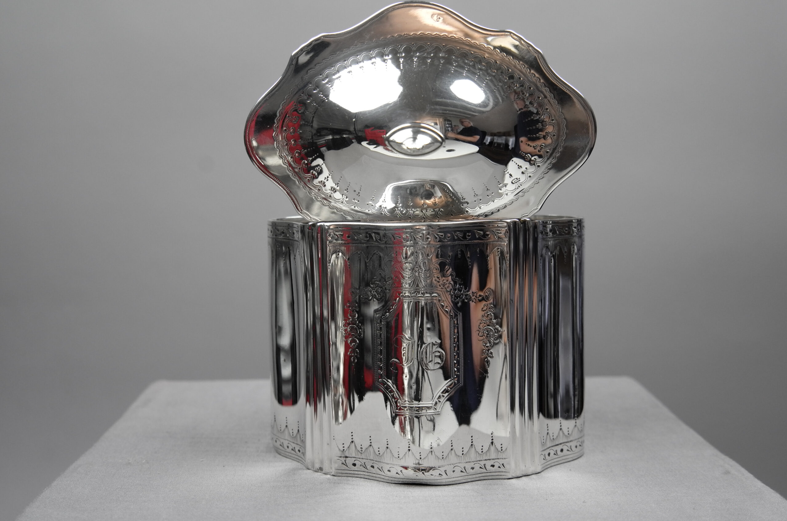 Eine Teedose in oval gewellter Form mit senkrechtem Liniendekor und gravierten Blatt- und Blütenmuster sowie zwei gravierten Kartuschen, die mit einem Monogramm bzw. einem Phönix belegt sind. Den Klappdeckel krönt ein Silberknauf, die Dose ist mit Schloss ausgestattet, allerdings fehlt der Schlüssel.