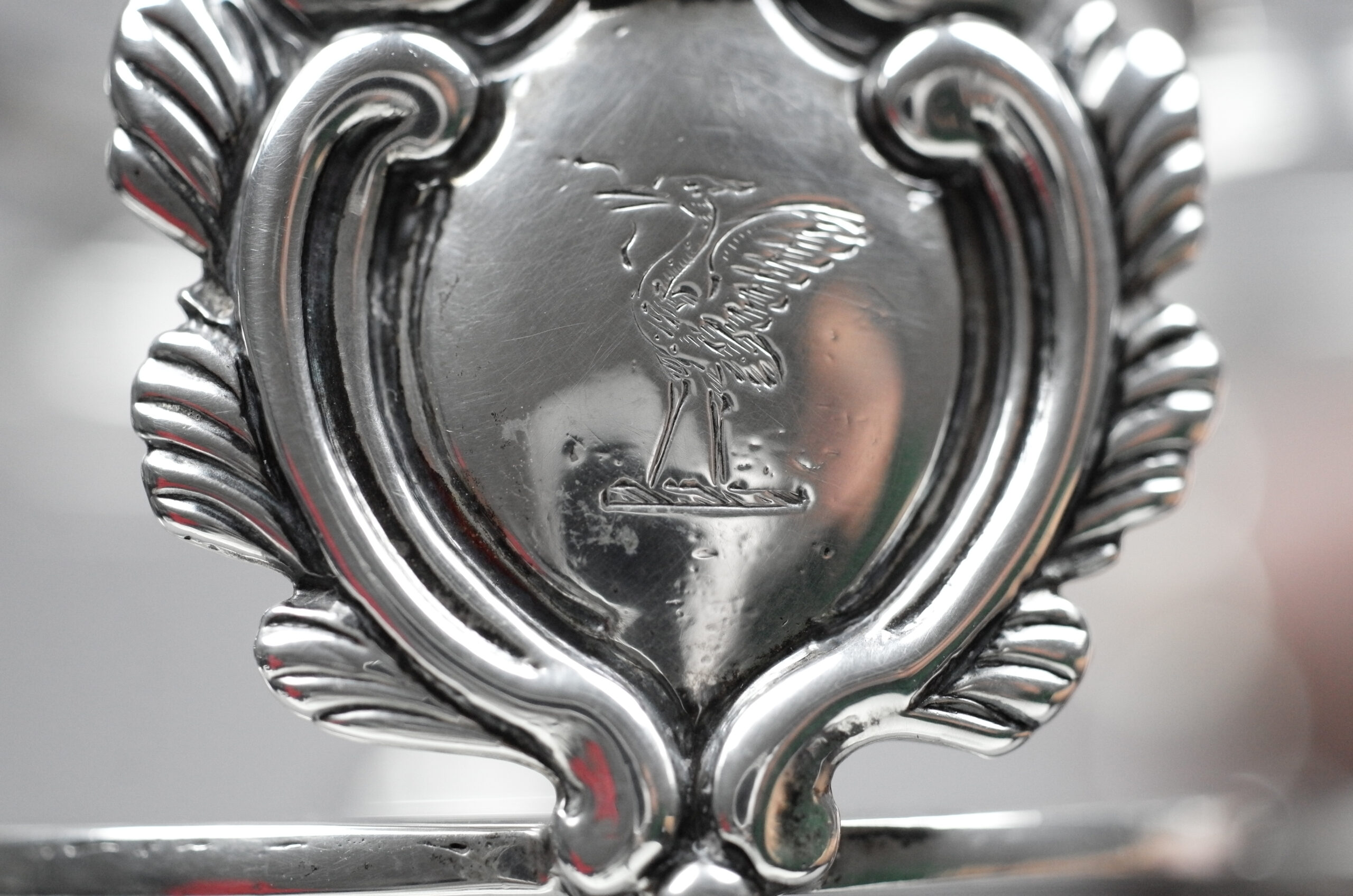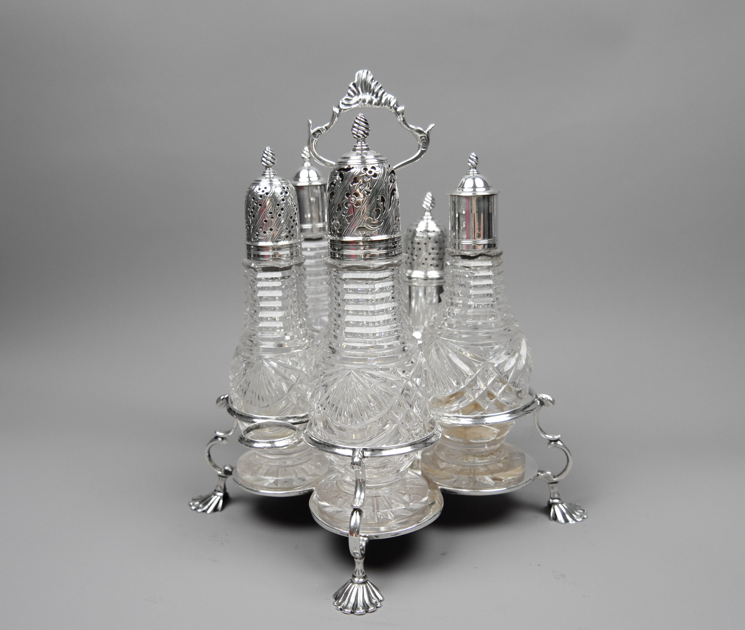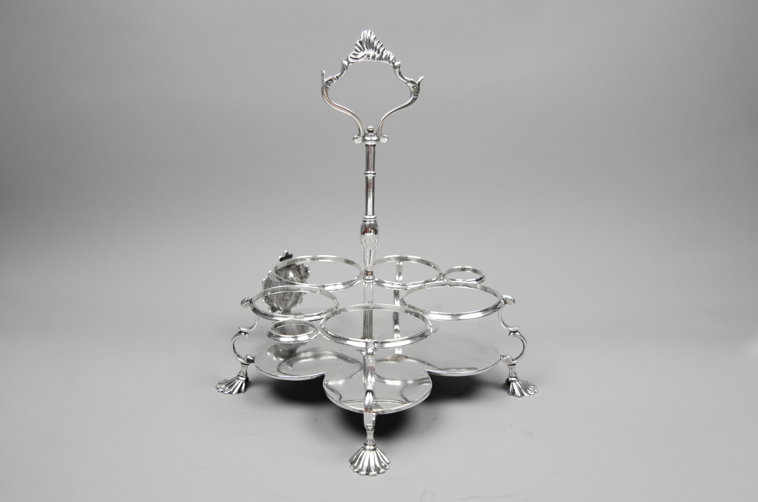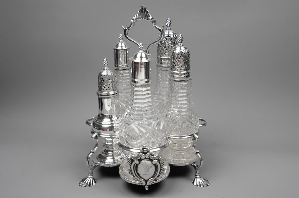 Dieses Tischgestell mit Gefäßen für Salz, Pfeffer, Essig und Öl steht auf vier Muschelfüßen und bietet fünf Ringe zum Platzieren von vier geschliffenen Glasgefäßen sowie von einem silbernen Streugefäß. Zwei weitere, kleine Ringe können die Flaschenverschlüsse während der Nutzung aufnehmen. Mittig ist ein prominenter Tragegriff angebracht, seitlich befindet sich eine gravierte Kartusche.