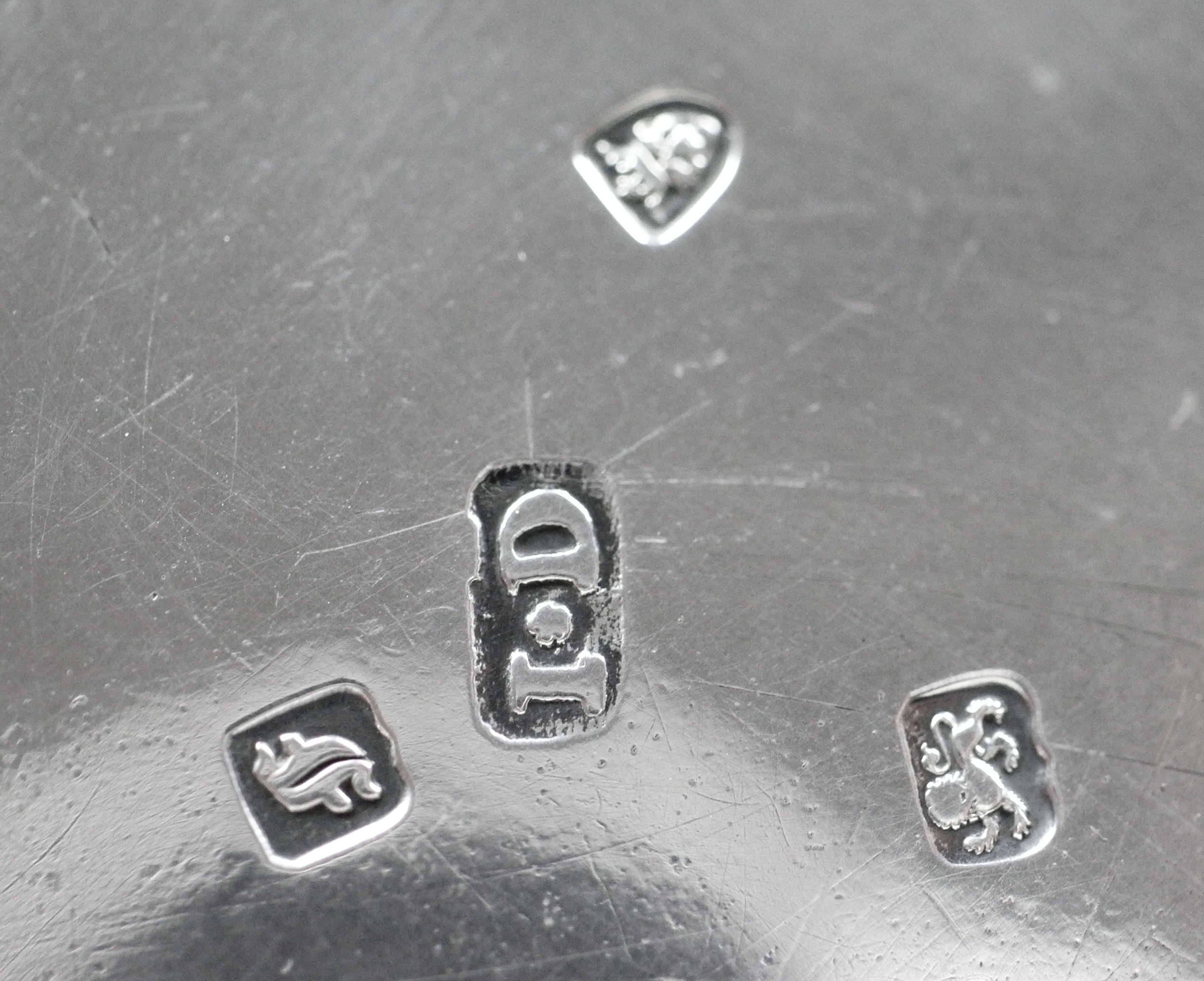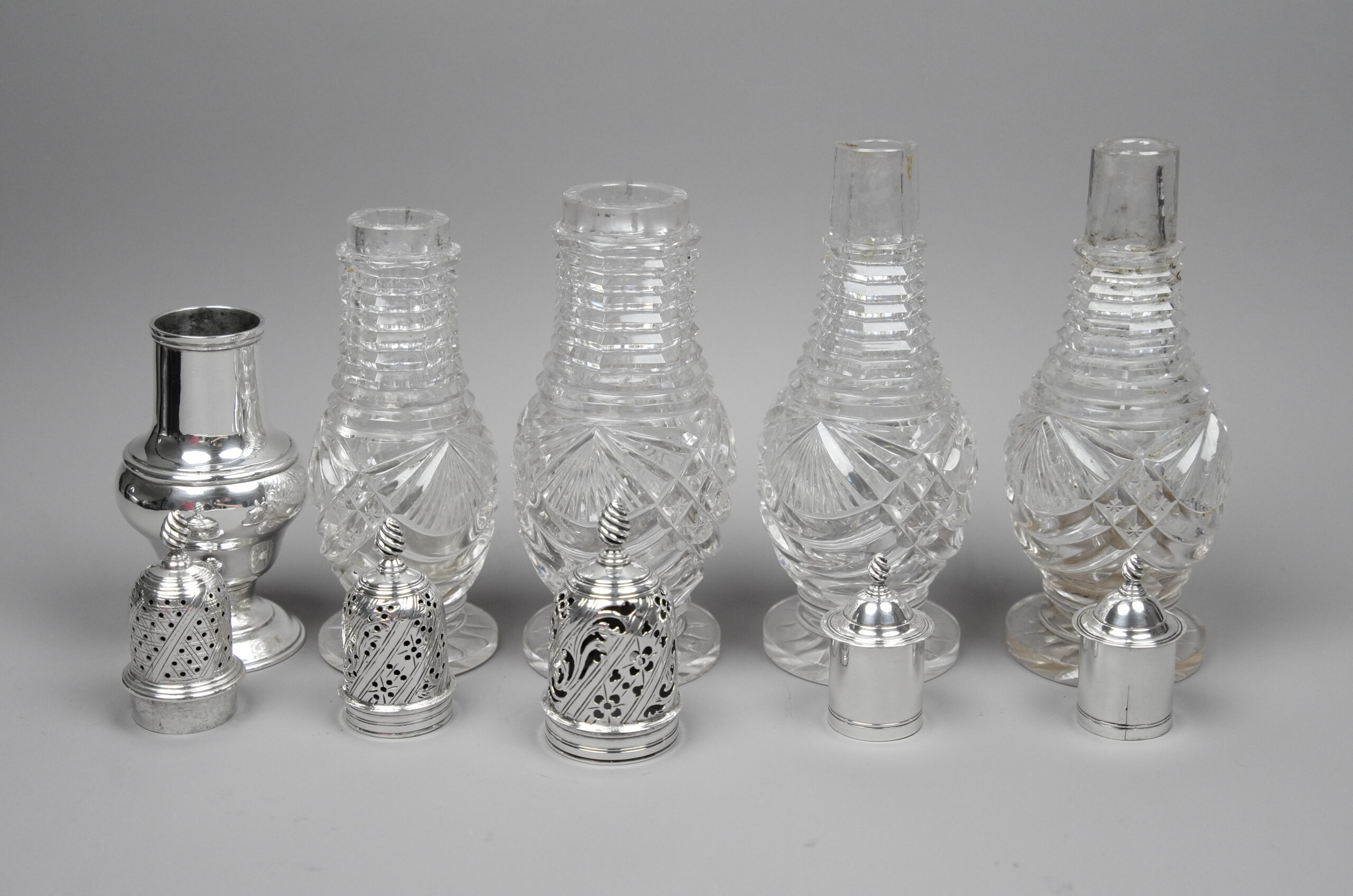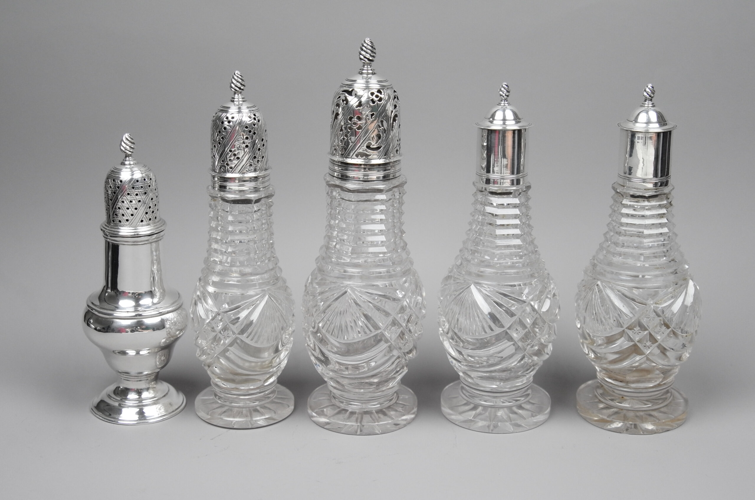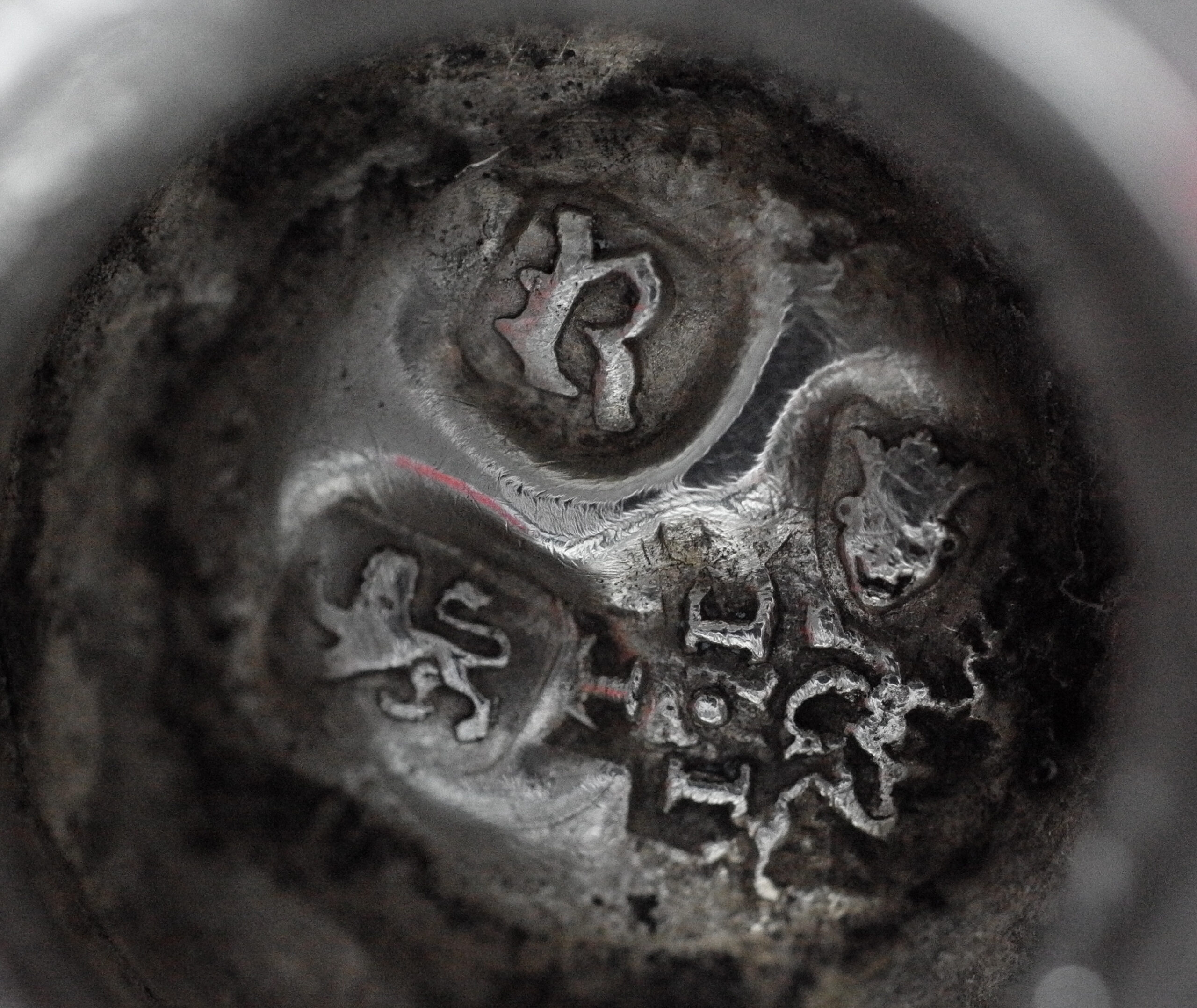 Gepunzt ist mit dem linksschreitenden Löwen für Sterlingsilber, mit dem gekrönten Leopardenkopf für London, mit dem Jahresbuchstaben F für 1761 sowie mit den Initialen I·D für den Meister John Delmester. Der silberne Streuer weist ein R für das Jahr 1772 sowie T über I·D über D für die Meister Thomas & Jabez Daniel auf.