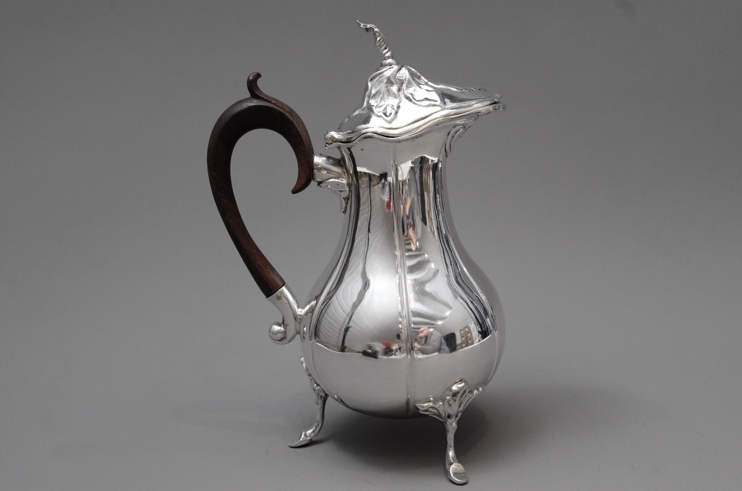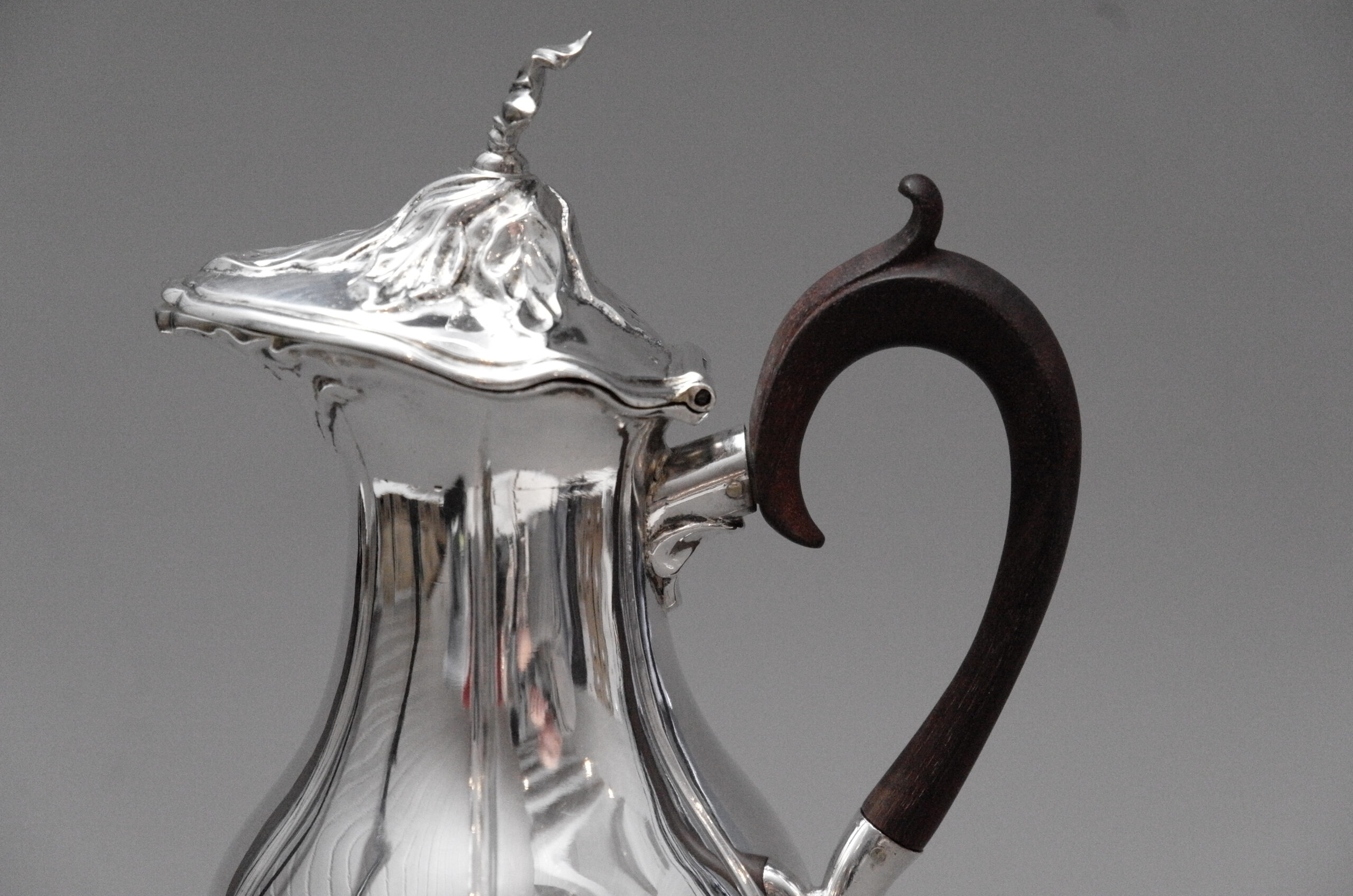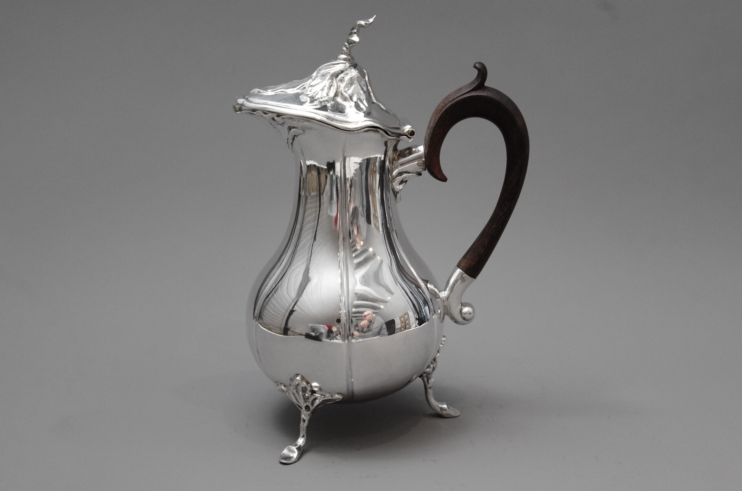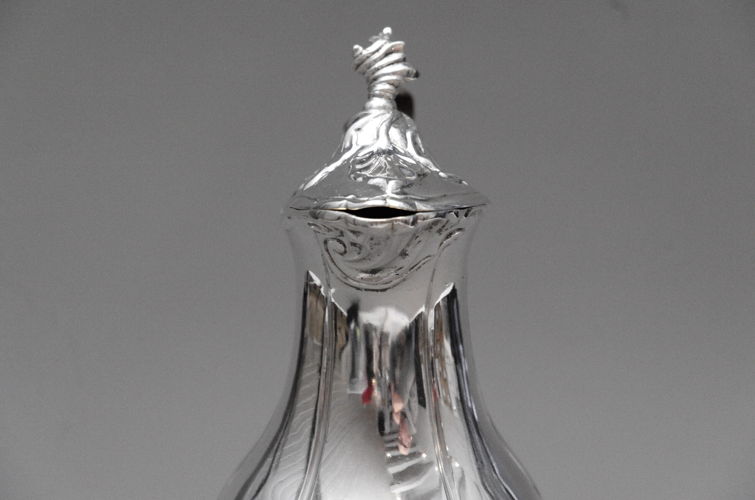 Eine innen vergoldete Mokkakanne steht auf drei Füßen, der Korpus ist balusterförmig und mit vertikalen Zügen dekoriert. Blattwerk verziert den Klappdeckel, die Holzhandhabe ist ebonisiert.
