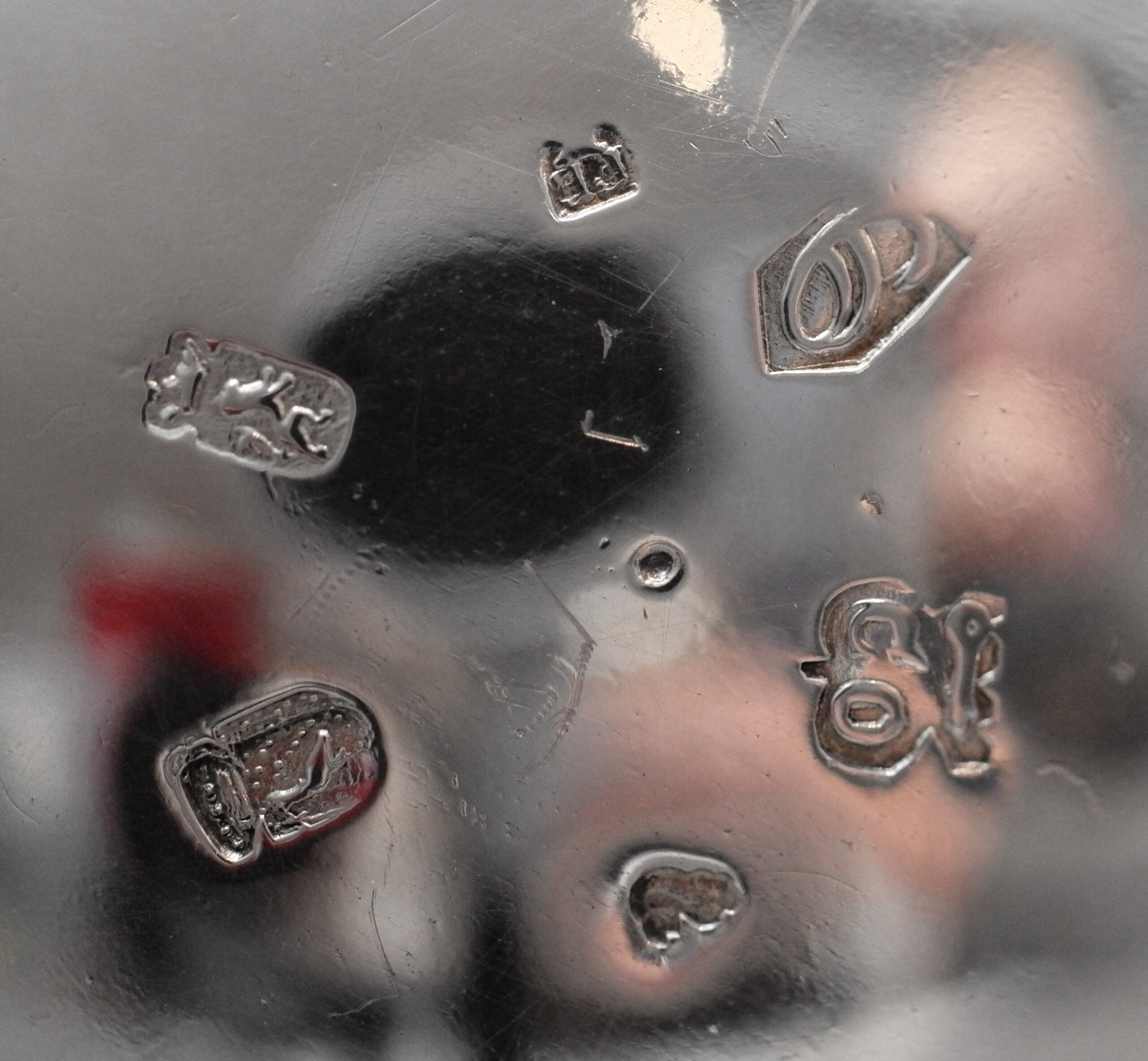 Markiert ist die Kanne mit der Beschau- und Feingehaltspunze für den Haag, 875er-Silber, mit dem Jahresbuchstaben d für 1750 sowie mit der Meistermarke CO für Pieter Constapel, der von 1727 bis 1764 in den Haag tätig war.