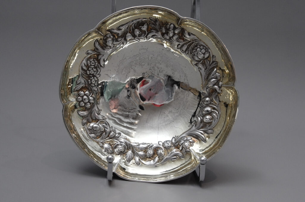 Ein Opferteller, der zur Darreichung von Hostien oder Abendmahlsbrot diente. Geformt ist der Teller als sechspassige, runde Schale, die auf einem runden Standfuß steht. Die Fahne ist mit geprägten Frucht- und Blattmotiven dekoriert, der Spiegel ist blank und die Schale ist innen vergoldet.