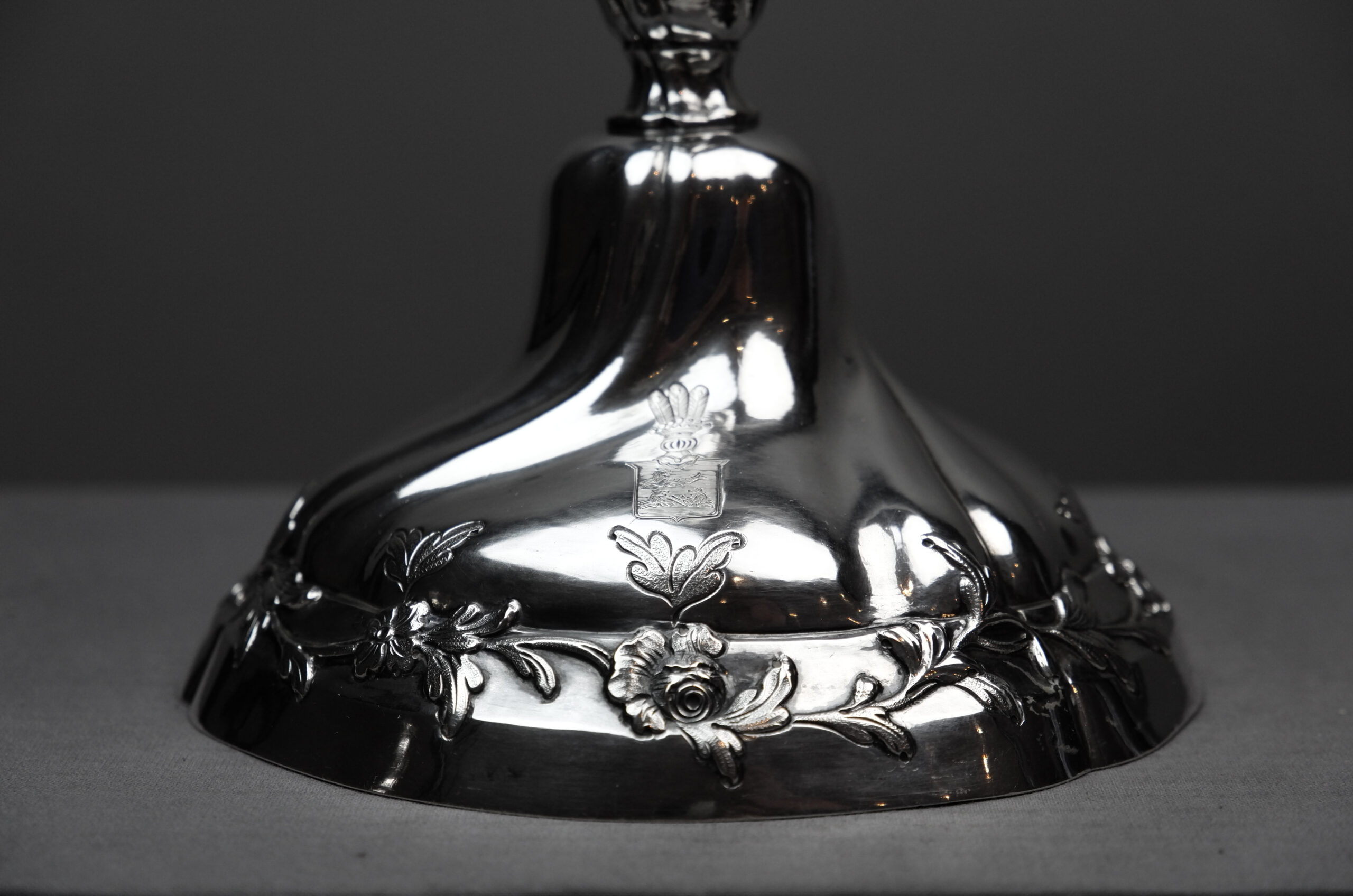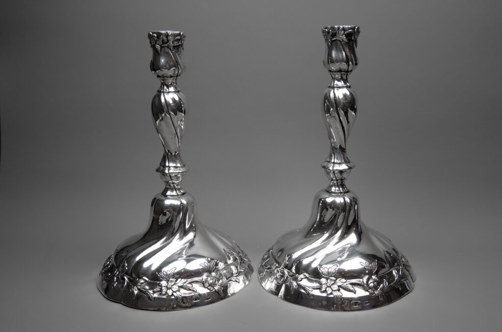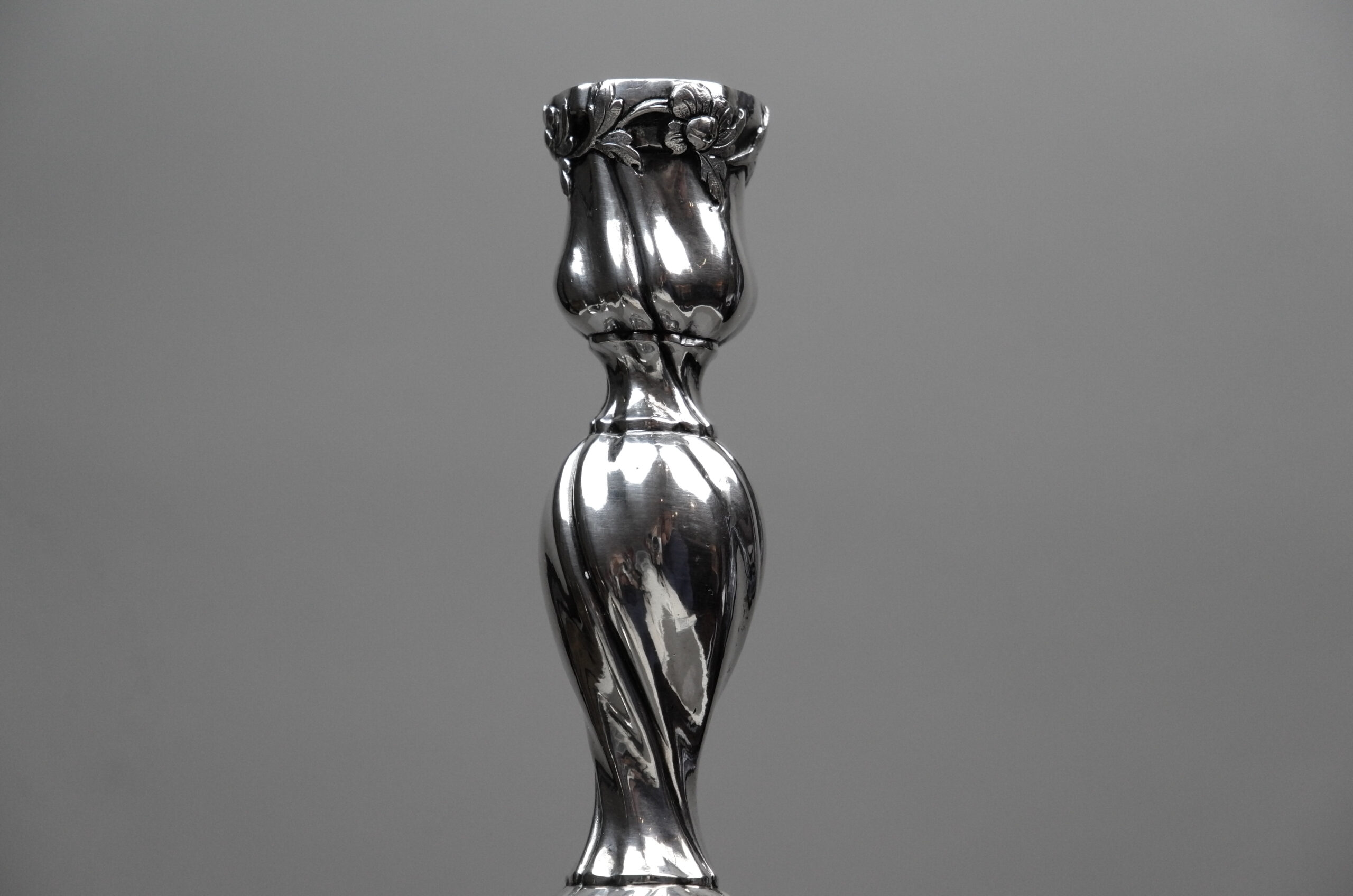 Ein Paar friderizianische Leuchter mit gewundenen Zügen und mit einem mit floralen Mustern verzierter Standfuß, der Balusterschaft aufragend mit Blumenmuster um die Tüllen, ziseliert und graviertes Wappen mit Krone und Federschmuck auf dem Stand.