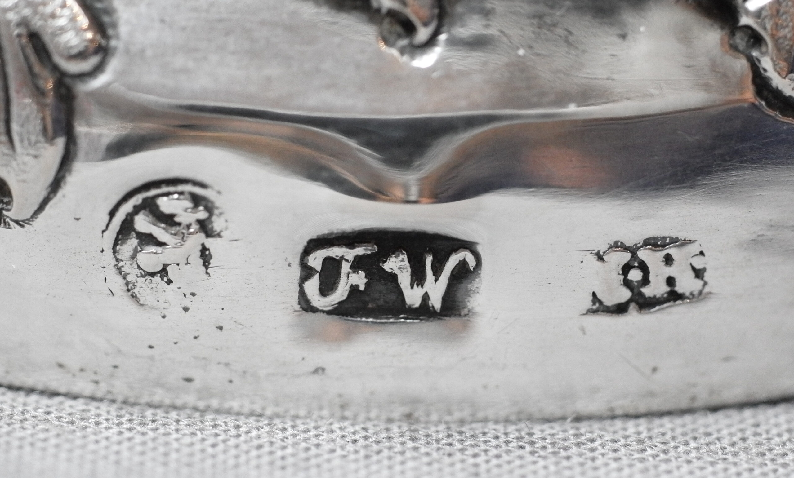 Gepunzt ist mit dem aufrechten Bär im Kreis als Beschaumarke für Berlin, mit den Buchstaben FW als Preußischer Steuerstempel sowie mit den Initialen HM für den Meister Henri Masseron, der von 1767 bis 1817 in Berlin tätig war.