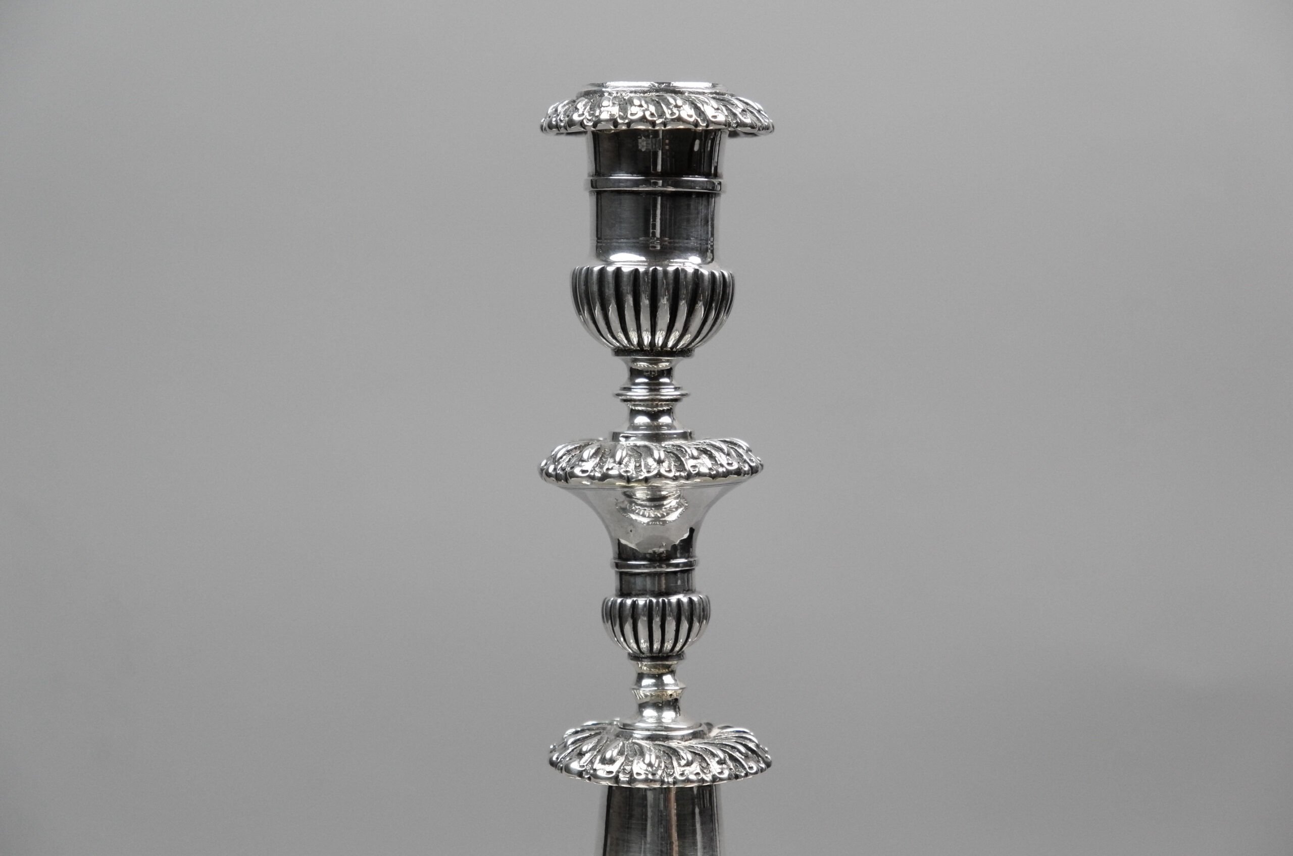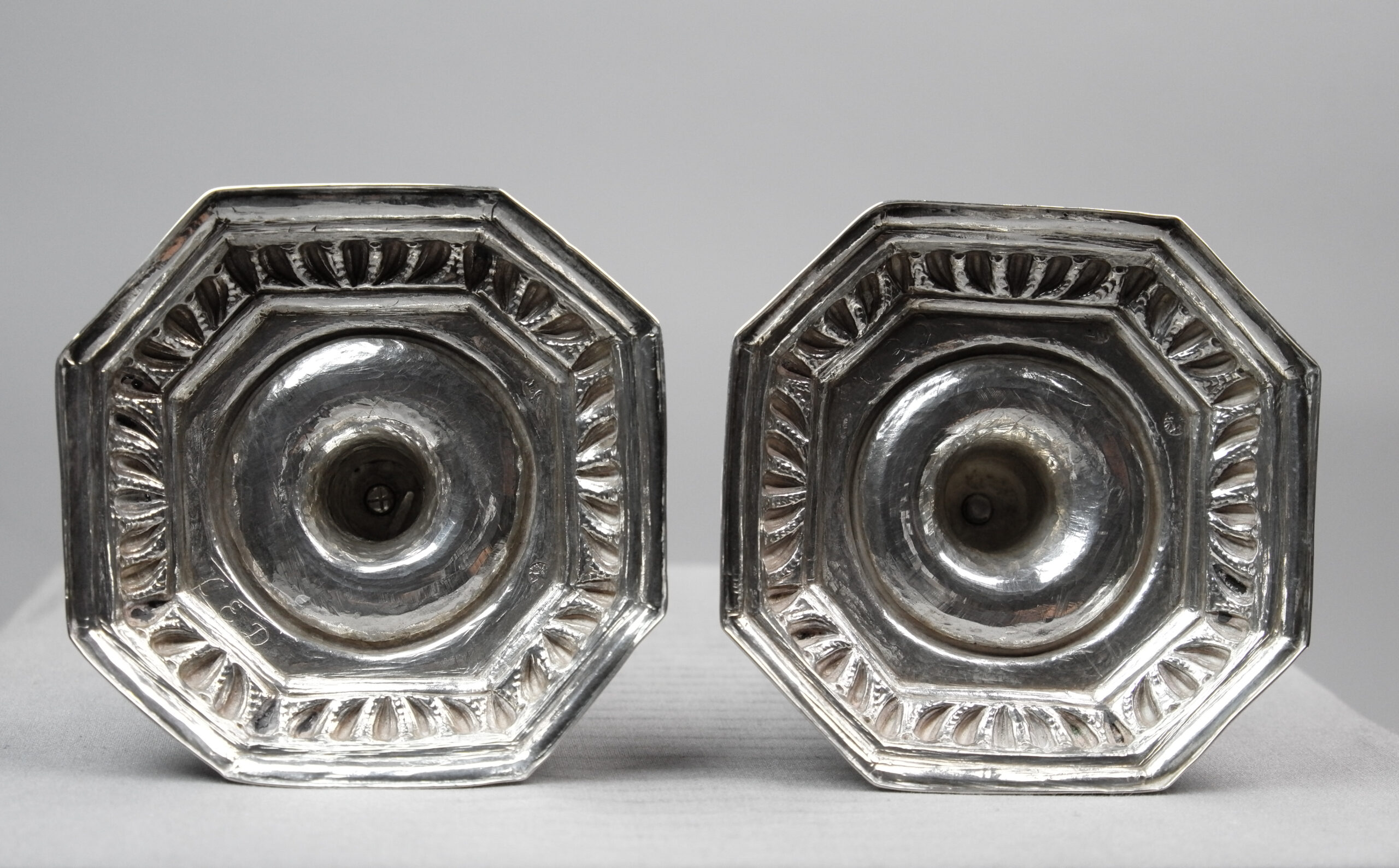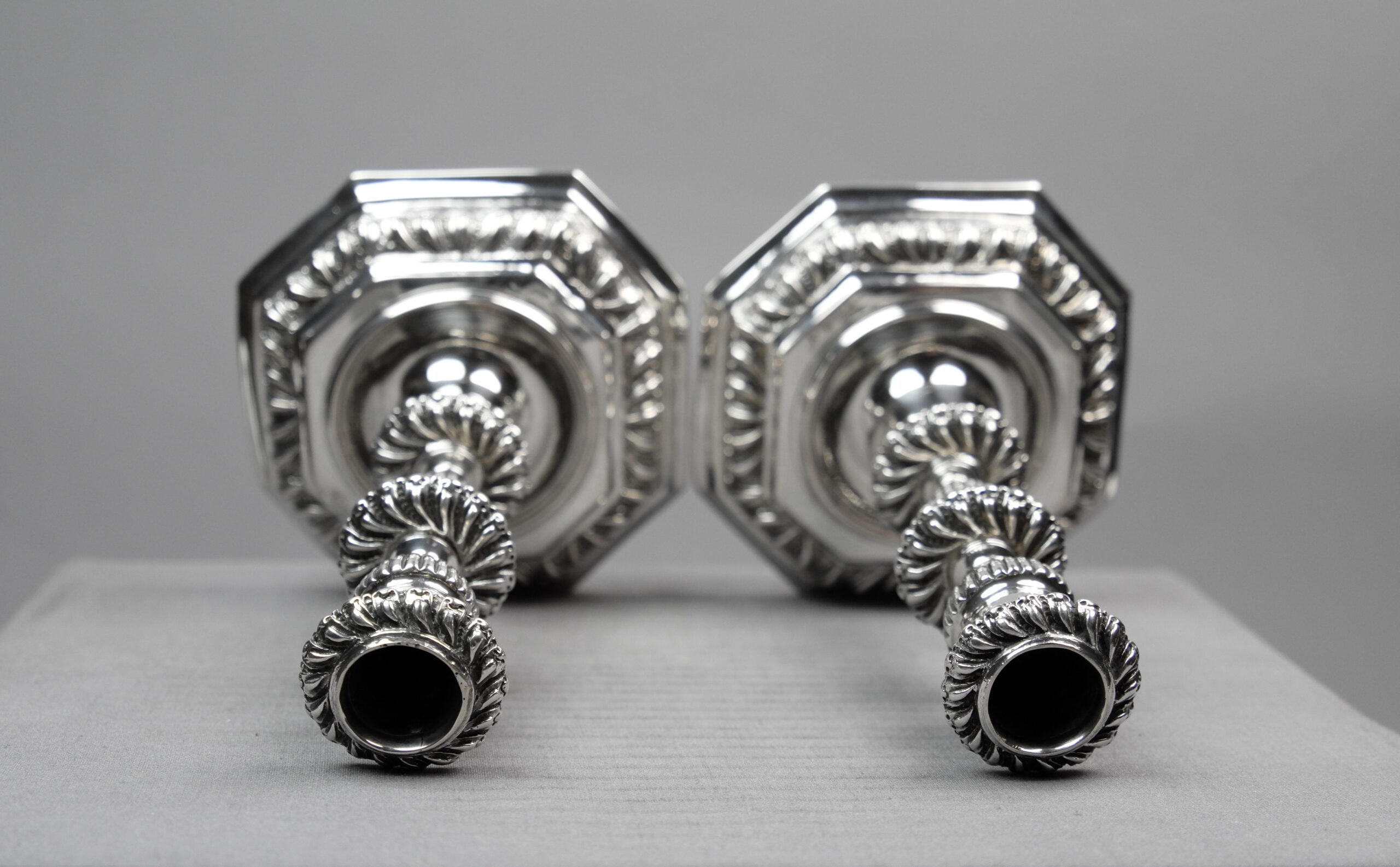 Ein oktagonaler Fuß und ein Balusterschaft mit Pfeifendekor dekorieren diese Kerzenleuchter. Die Tüllen sind vasenförmig und godroniert. Kleine Monogramme befinden sich oben auf dem Stand („CMS“) sowie („CED“) unterseitig.