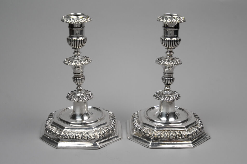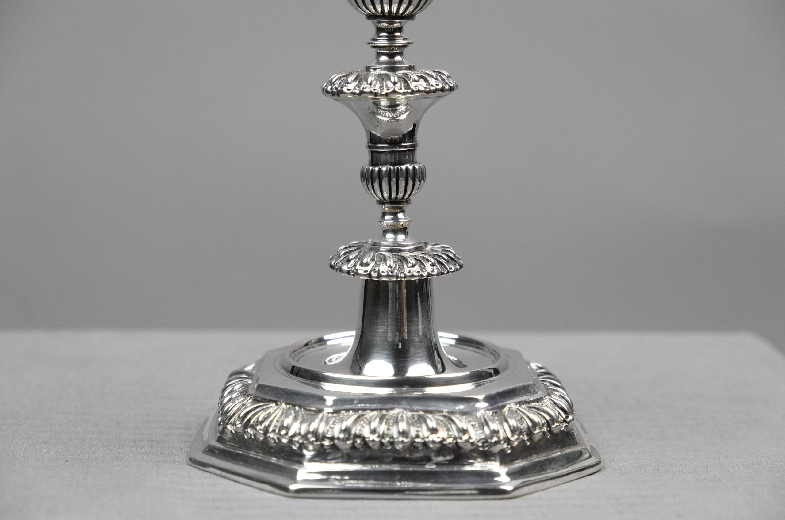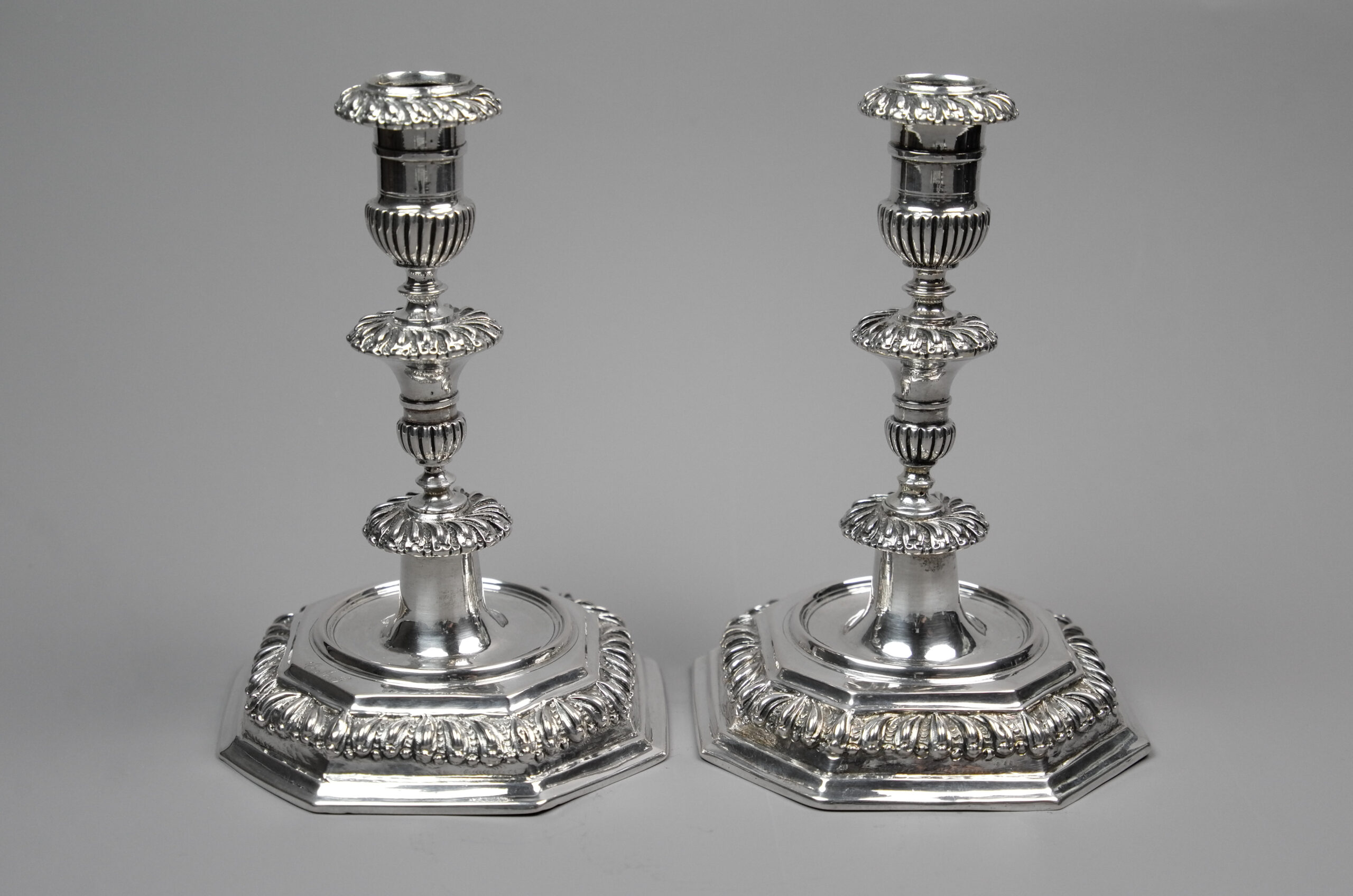 Ein oktagonaler Fuß und ein Balusterschaft mit Pfeifendekor dekorieren diese Kerzenleuchter. Die Tüllen sind vasenförmig und godroniert. Kleine Monogramme befinden sich oben auf dem Stand („CMS“) sowie („CED“) unterseitig.