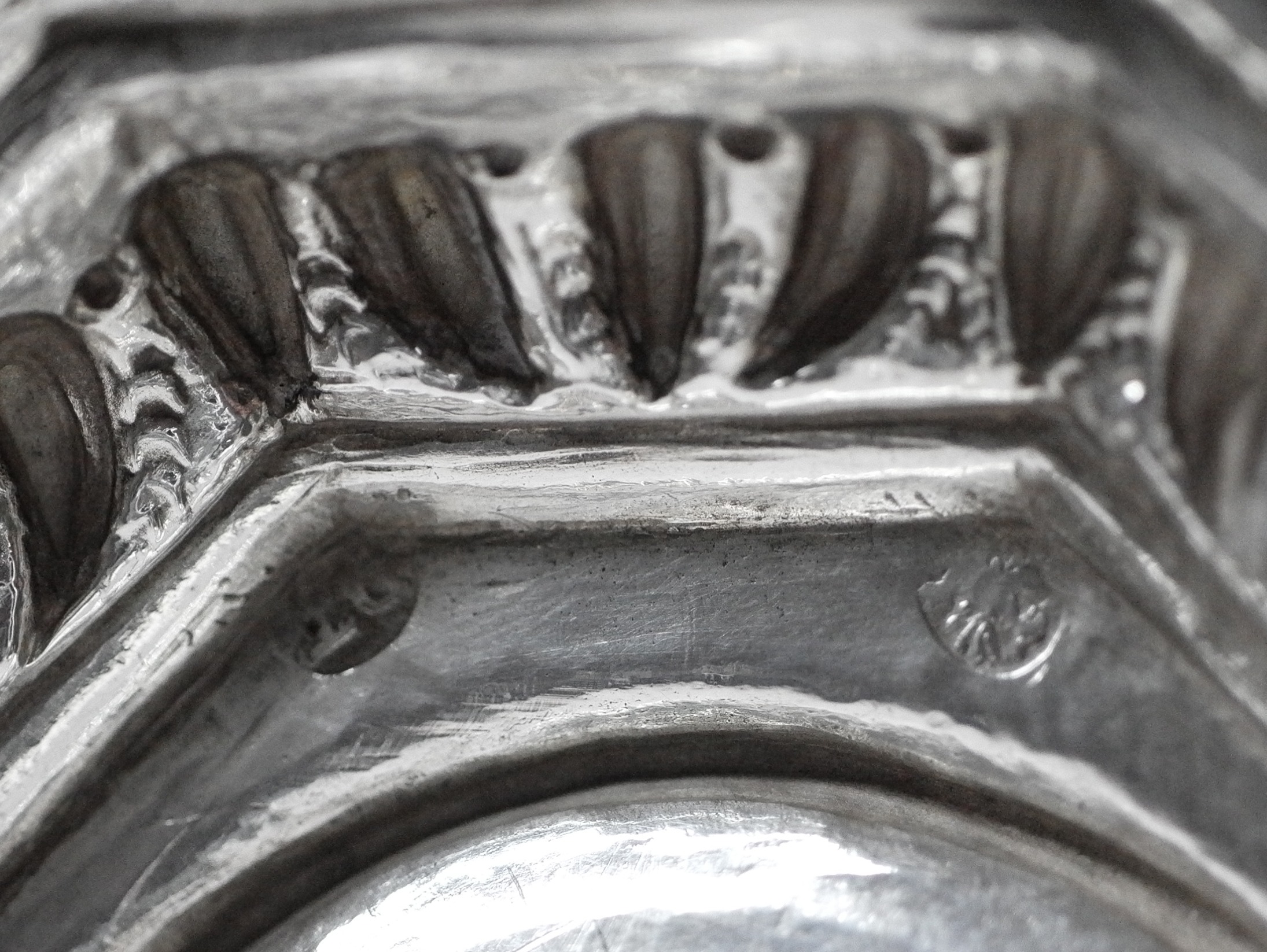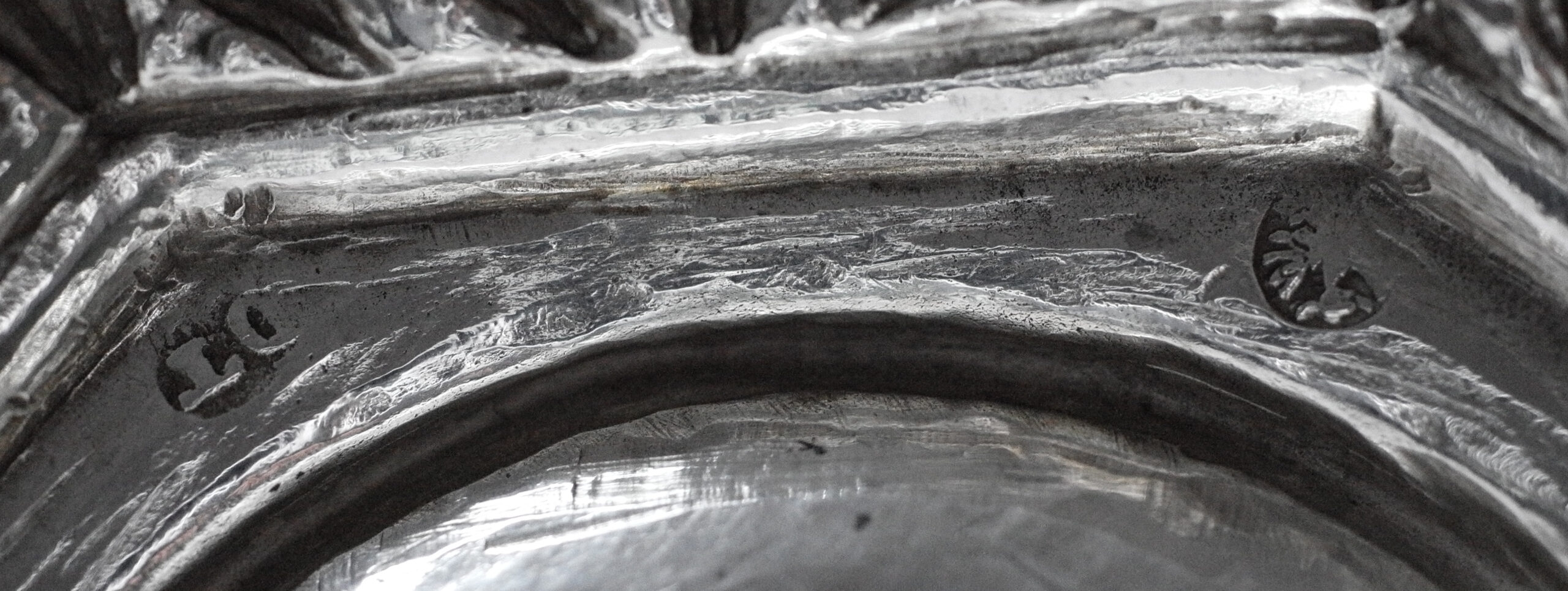 Markiert ist mit der Beschaumarke von Frankfurt am Main sowie mit den Initialen DT für den Meister David Thisson dem Älteren (Rosenberg, Band 2, Lf. Nr. 2044), der 1693 zum Meister ernannt wurde und 1720 verstarb.